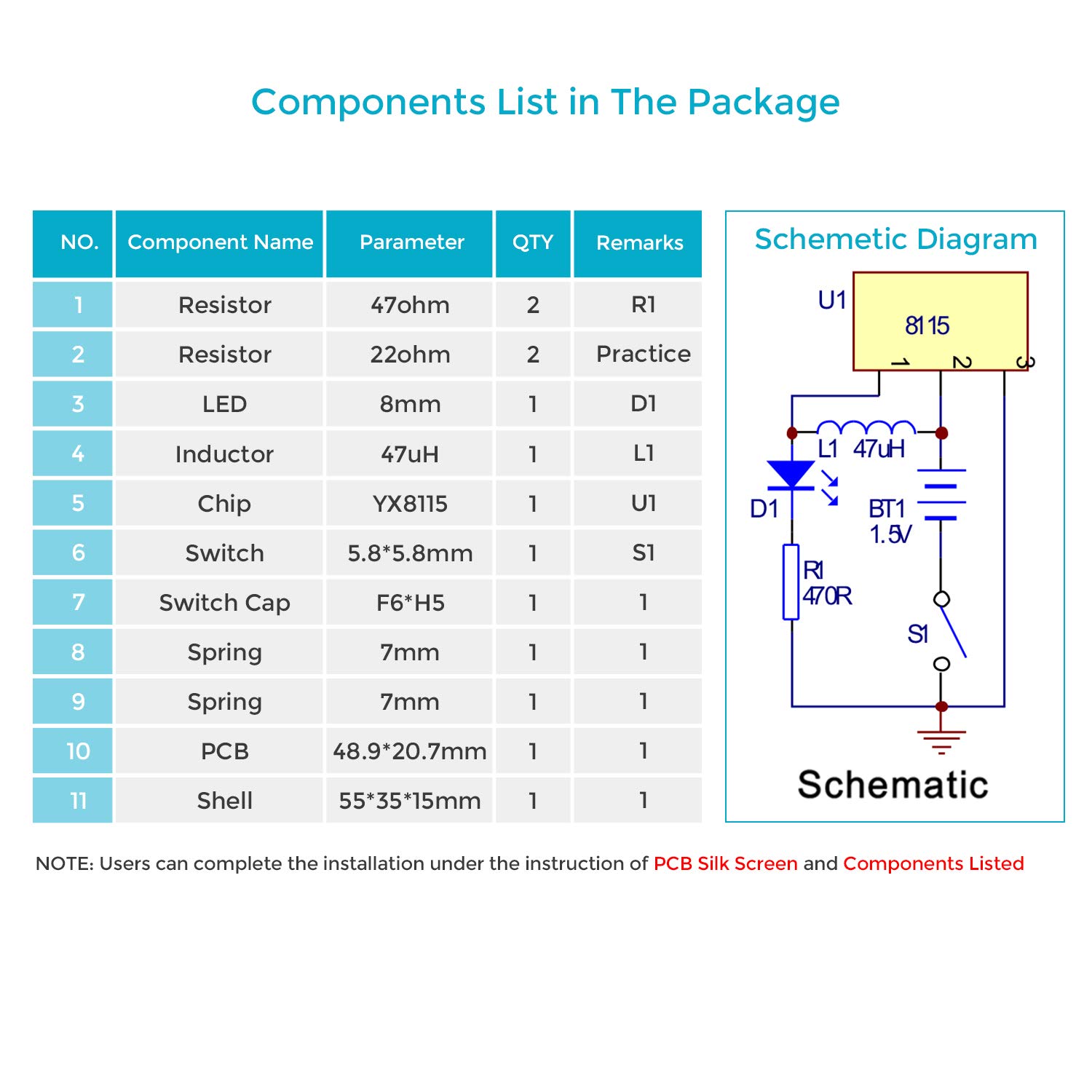 You Wanna Experience Fantastic Electronics Soldering? You Are Interested in DIY Electronics Projects? Wanna Spark & Encourage Teenagers' Talents & Passions and Keep Electronics Learning Interesting and Fun? Racked Your Brains About Cool Gifts to Friends? This Ingenious DIY Electronic Flashlight Born for It. It Makes Learning Not A Dull Thing But A Great Joy. You Will Enjoy The Pleasure of DIY Electronics. This Simple Flashlight Kit Suitable for Learning Electronics & Practice Soldering Skills for DIYers, Electronic Enthusiasts, STEM Students, Beginners, or Anyone Looking For Practical Projects. What Will You Get? Easy-to-Assemble Flashlight Kit: --This product comes to you is Component Kit needs to be installed to A Simple Flashlight. It's helpful to improve the ability to solve practical problems through hands-on practice. In the meanwhile you can enjoy the fun from the DIY projects. --Easy to Assemble: The flashlight kit components' marker name clearly mapped and labelled on PCB layout makes it easy to assemble. Installation Method: Refer to the Product Image 5.