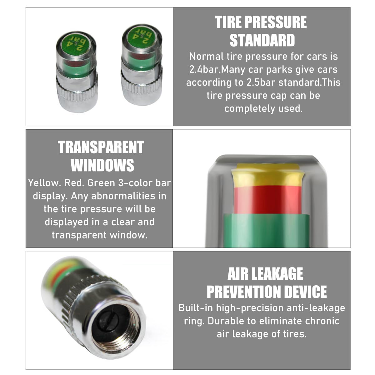 Specification: Material: Stainless Steel, Copper Quantity: 4/ 8/ 12 PCS Color: Silver/ Golden Weight: 28 g Size: 0.9×0.35 inches Feature: Practical, Portable, Durable Fit Type: Universal Fit Other advantages about it: -It is compact and easy to carry and store. -It is transparent, making it easy for you to check tyre pressure. -It has a built-in gasket seal, which ensures that the tyre does not leak when in use. Warm tips: -Please remove it when washing the car. -Please make sure that the black gasket will not be lost when you remove it.