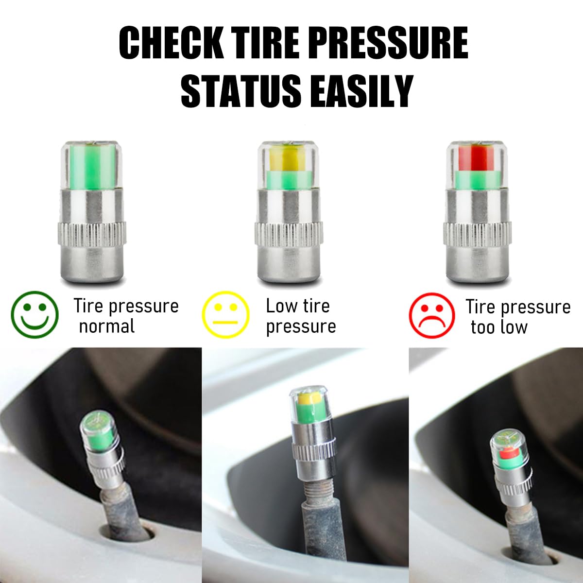 3-color Display: Our tyre pressure monitor is set in three colors, which represent the different pressure conditions of the tyre. Green indicates normal pressure, yellow indicates pressure 10% below standard and red indicates pressure 25% below standard, which is clear at a glance