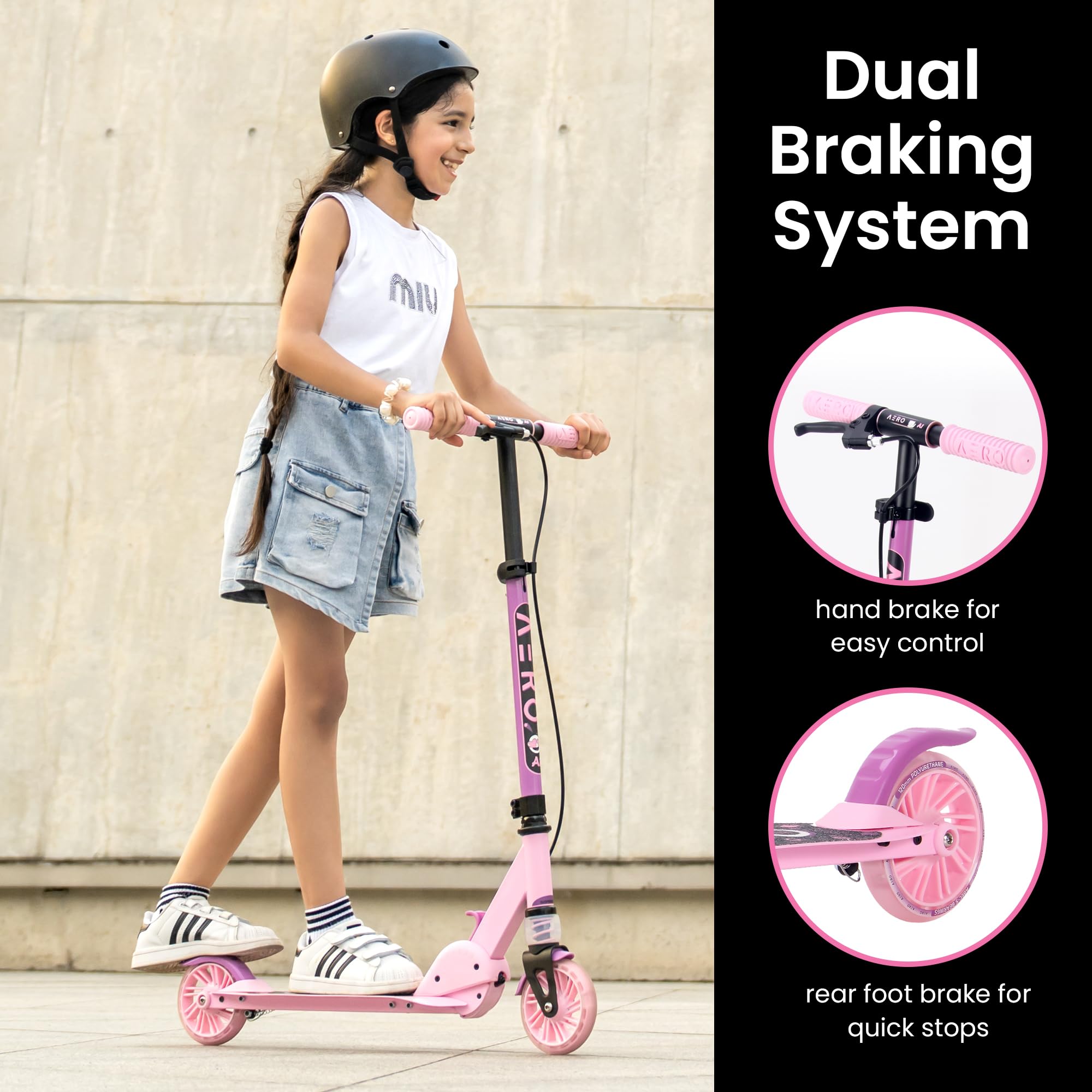 DUAL BRAKES: In additional to the standard foot brake, this kids scooter features a hand-operated brake for enhanced control and safety