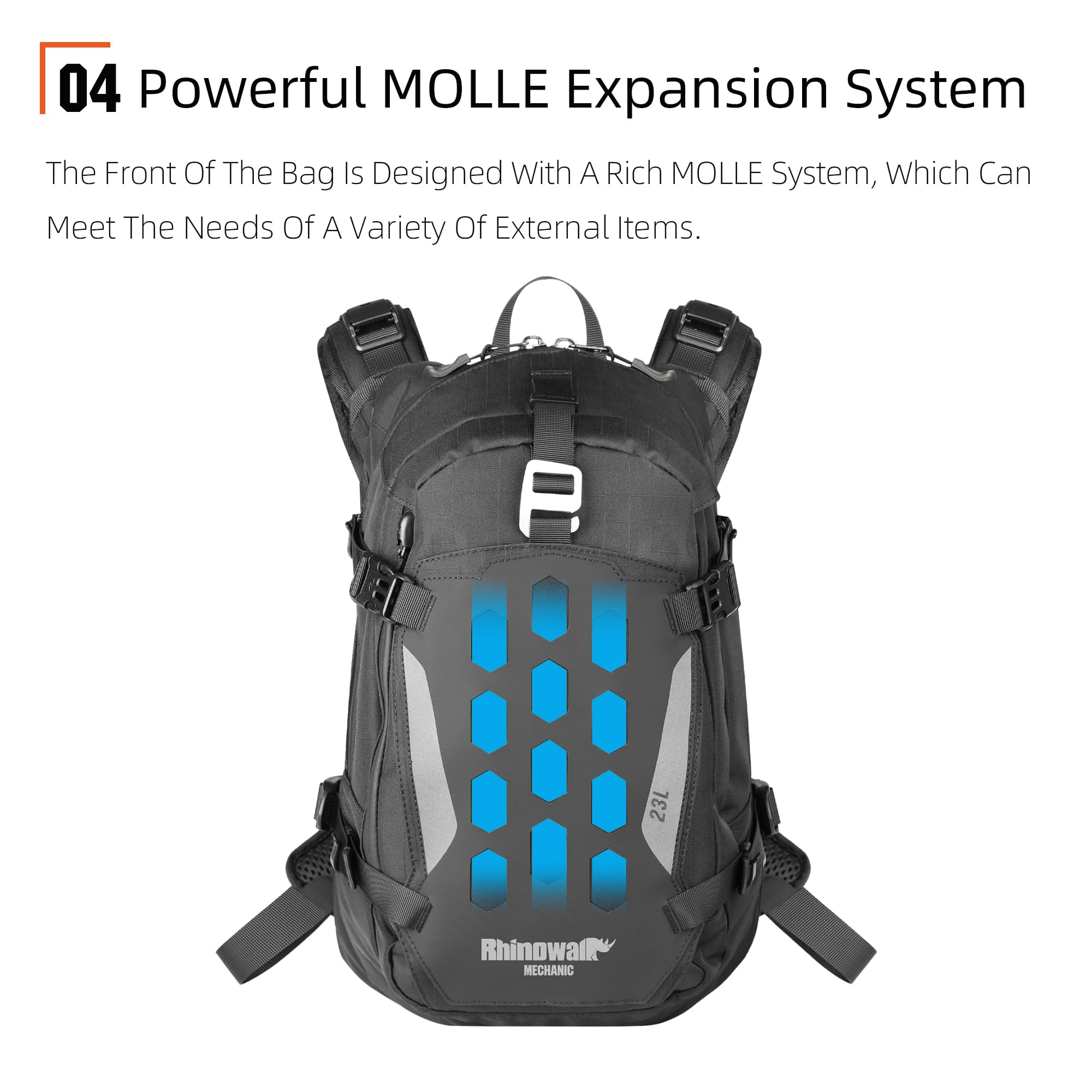 Mount the helmet via buckle: The motorcycle helmet can be mounted through the buckles on both sides of the bag body, and a rain cover is attached