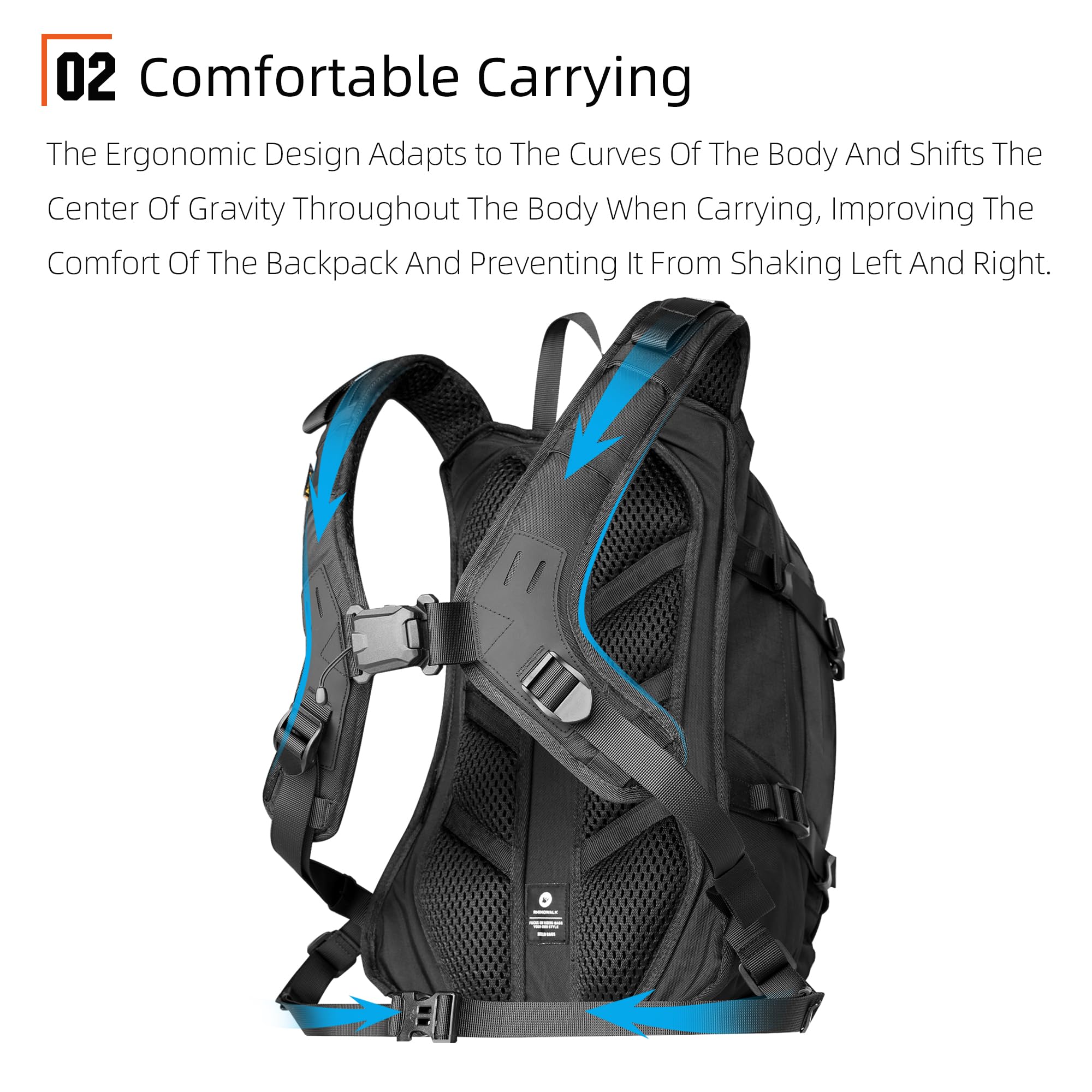 The rich compartment design: Inside the bag includes a water bag compartment, which can hold a 2L water bladder. There are fixed velcro and water pipe opening on the top. And a 14 inch laptop compartment. Independent net bag for repair tools, mobile phones, etc