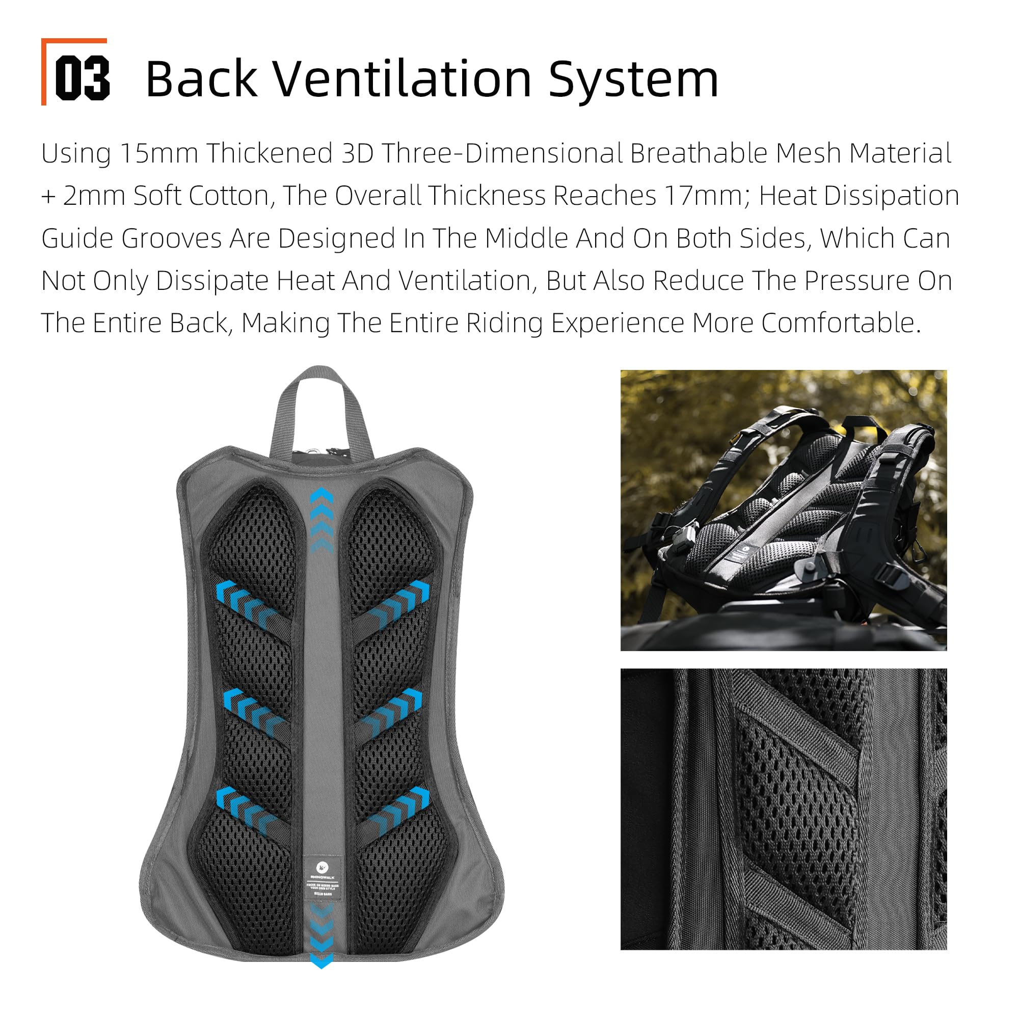 Back ventilation system: Using 15mm thickened 3D three-dimensional breathable mesh material + 2mm soft cotton, the overall thickness reaches 17mm; Heat dissipation guide grooves are designed in the middle and on both sides, which can not only dissipate heat and ventilation, but also reduce the pressure on the entire back, making the entire riding experience more comfortable. The ergonomic design adapts to the curves of the body