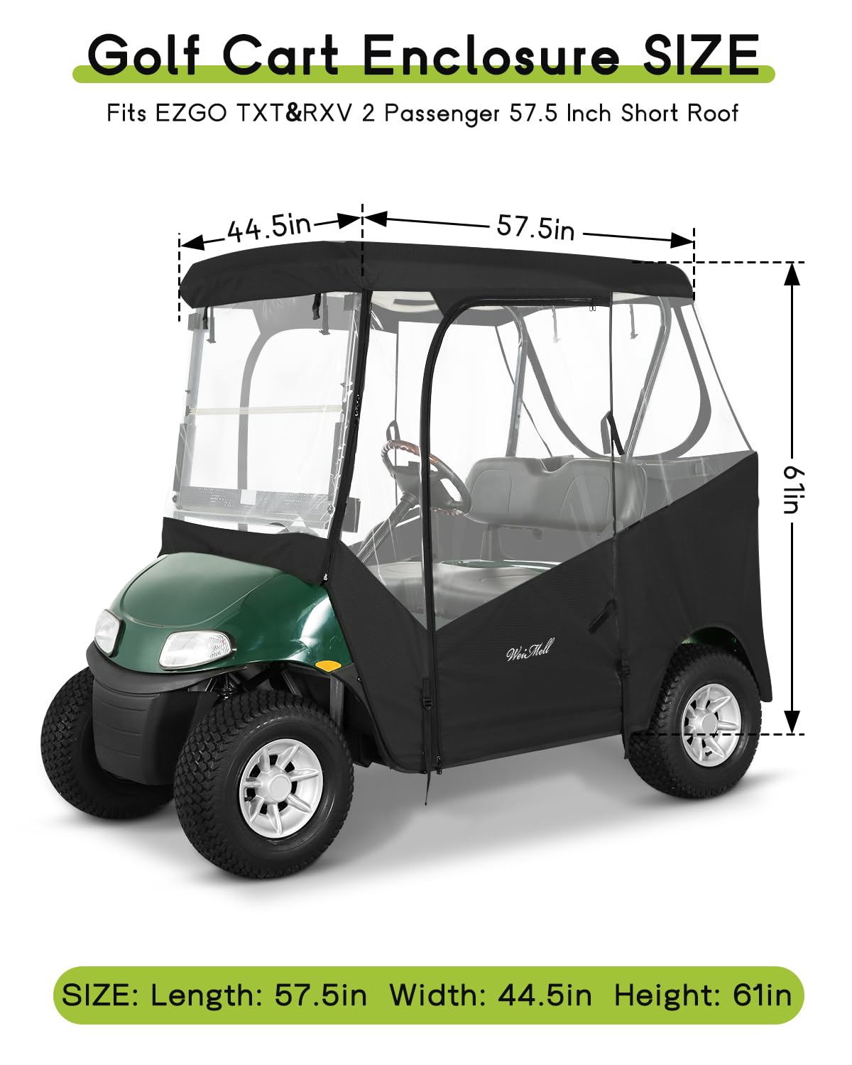 WEIMELL GOLF ENCLOSURE PRODUCT SIZE: This golf cart drivable cover is specifically designed to fit the EZGO TXT and RXV 2-passenger models (NOTE: Not available for 4-passenger extended/long-top carts).
