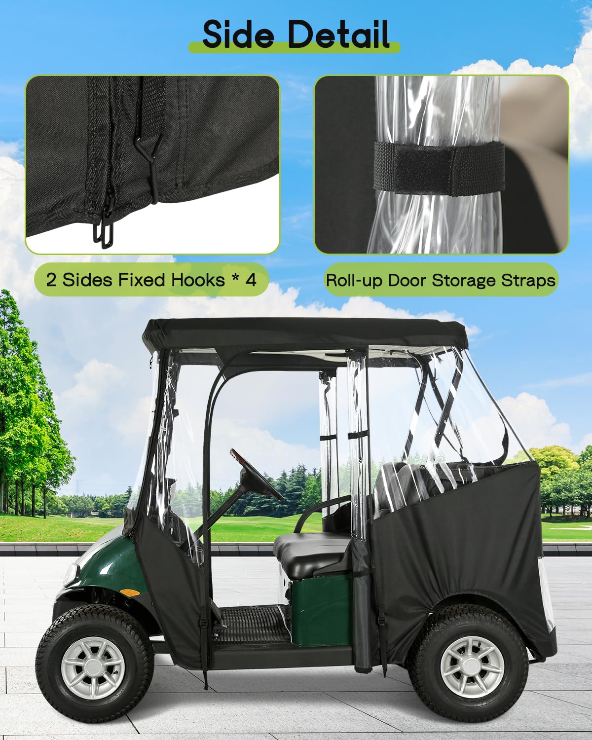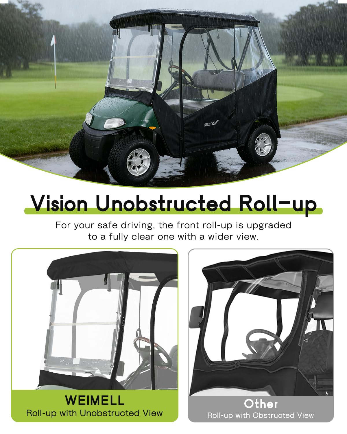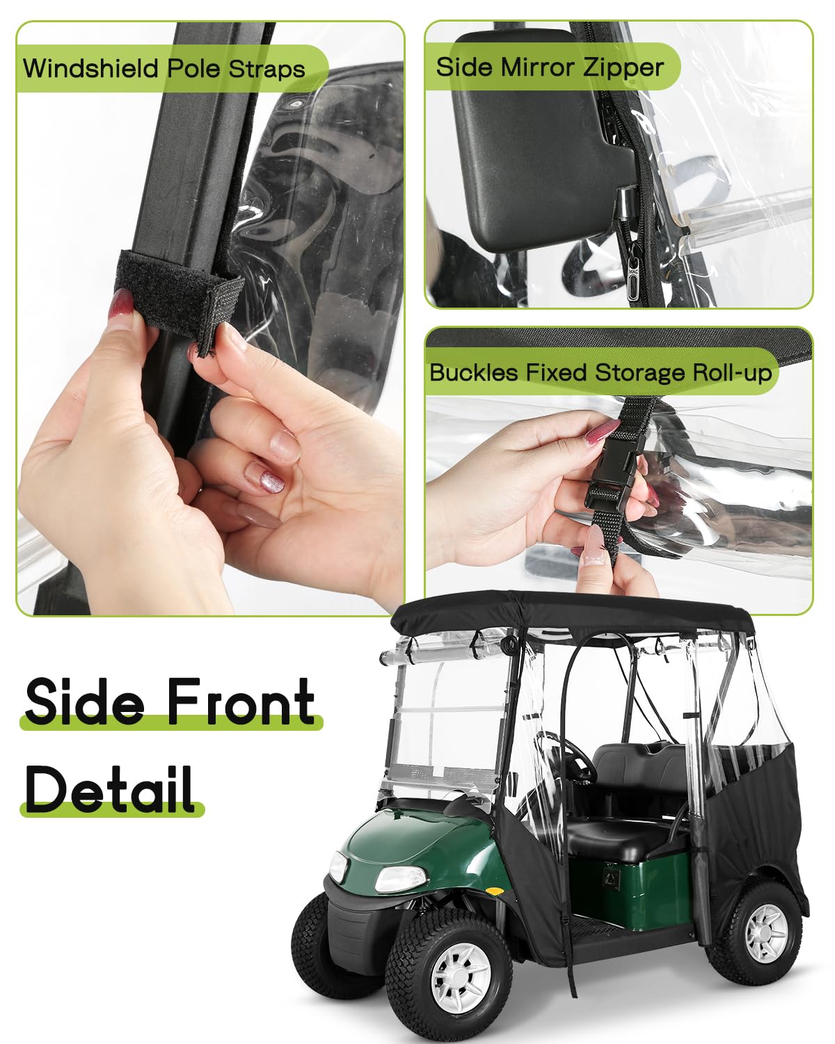 ROLL-UP DESIGN: The front windshield roller shutter can be pulled to the top and fixed with a buckle strap when not in use, the side door roller shutter door and the rear roller shutter window can be rolled up and fixed with a buckle strap for storage, which is convenient for you to get in and out of the golf car and take things, and it also allows you to ensure the ventilation while driving safely with a wide field of vision.