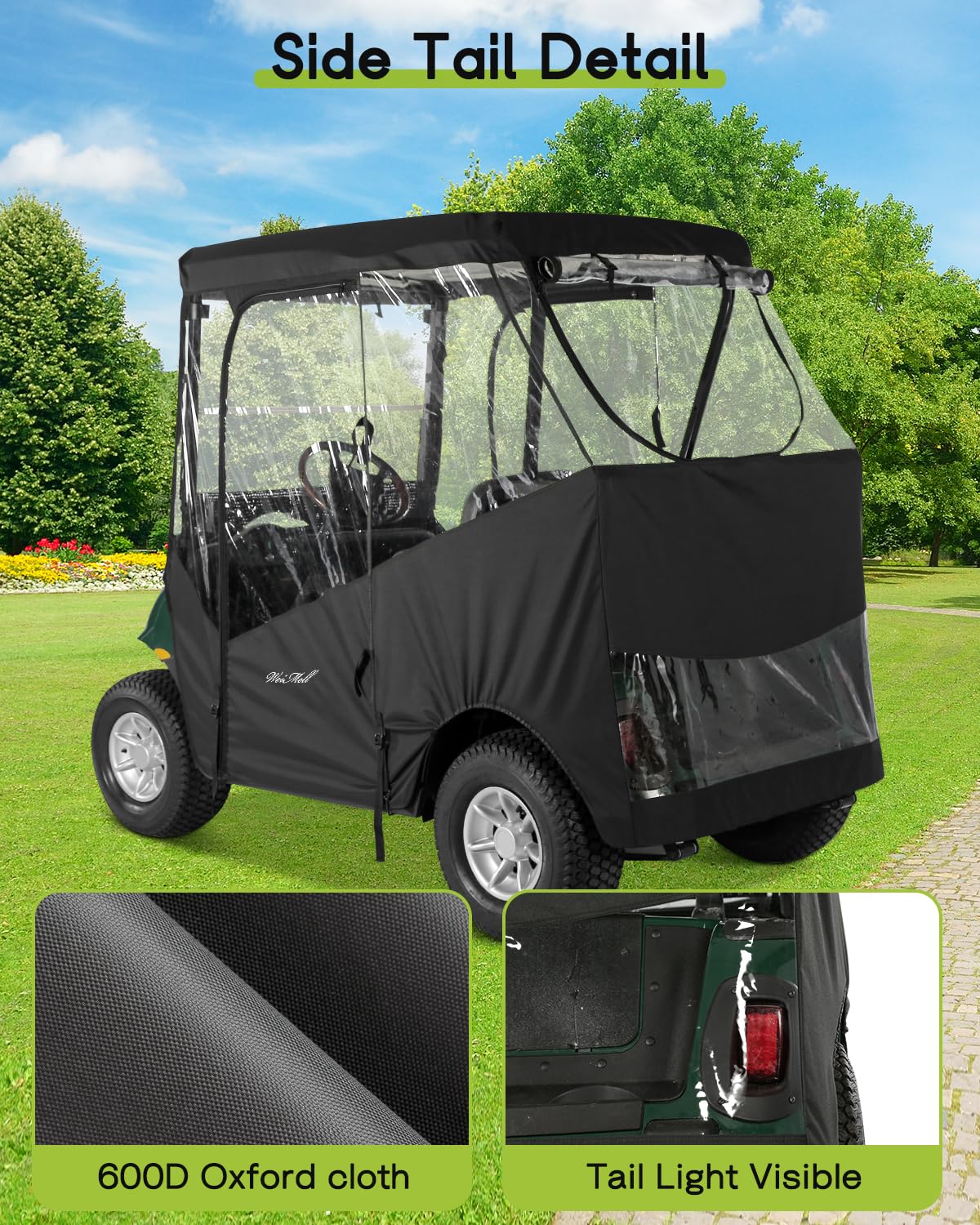 VISIBILITY AND SAFETY: The golf cart rain cover adopted 4-sided clear PVC windows, Taillight transparent windows, and side mirror zipper openings to keep you driving safely day and night.