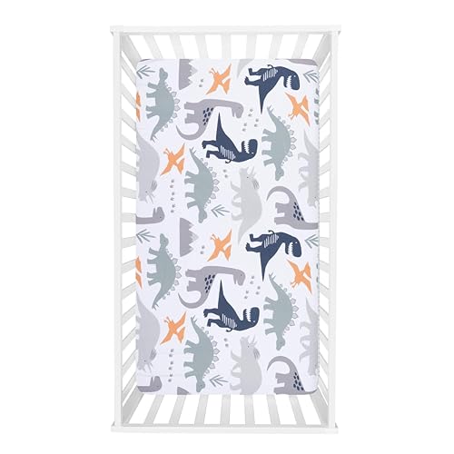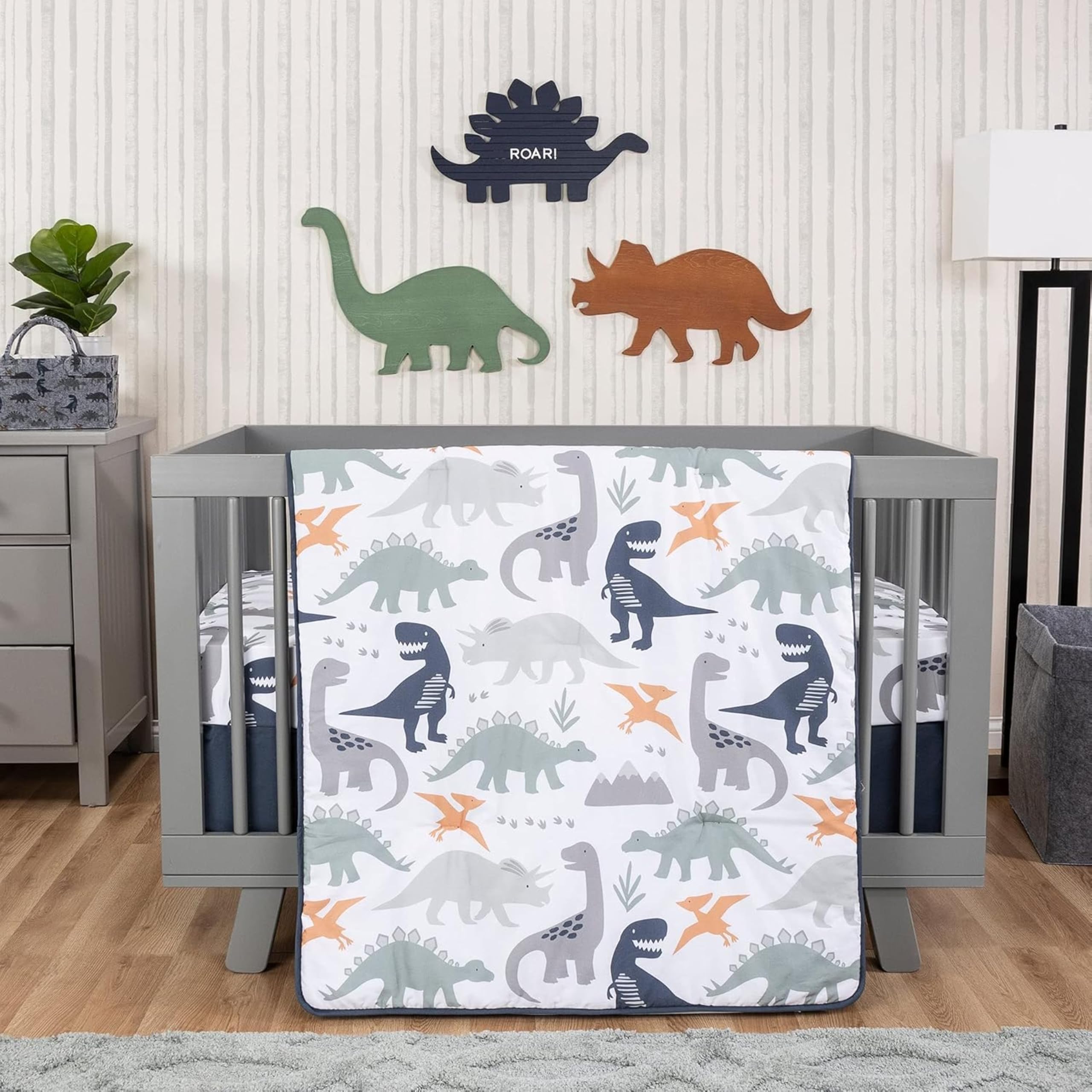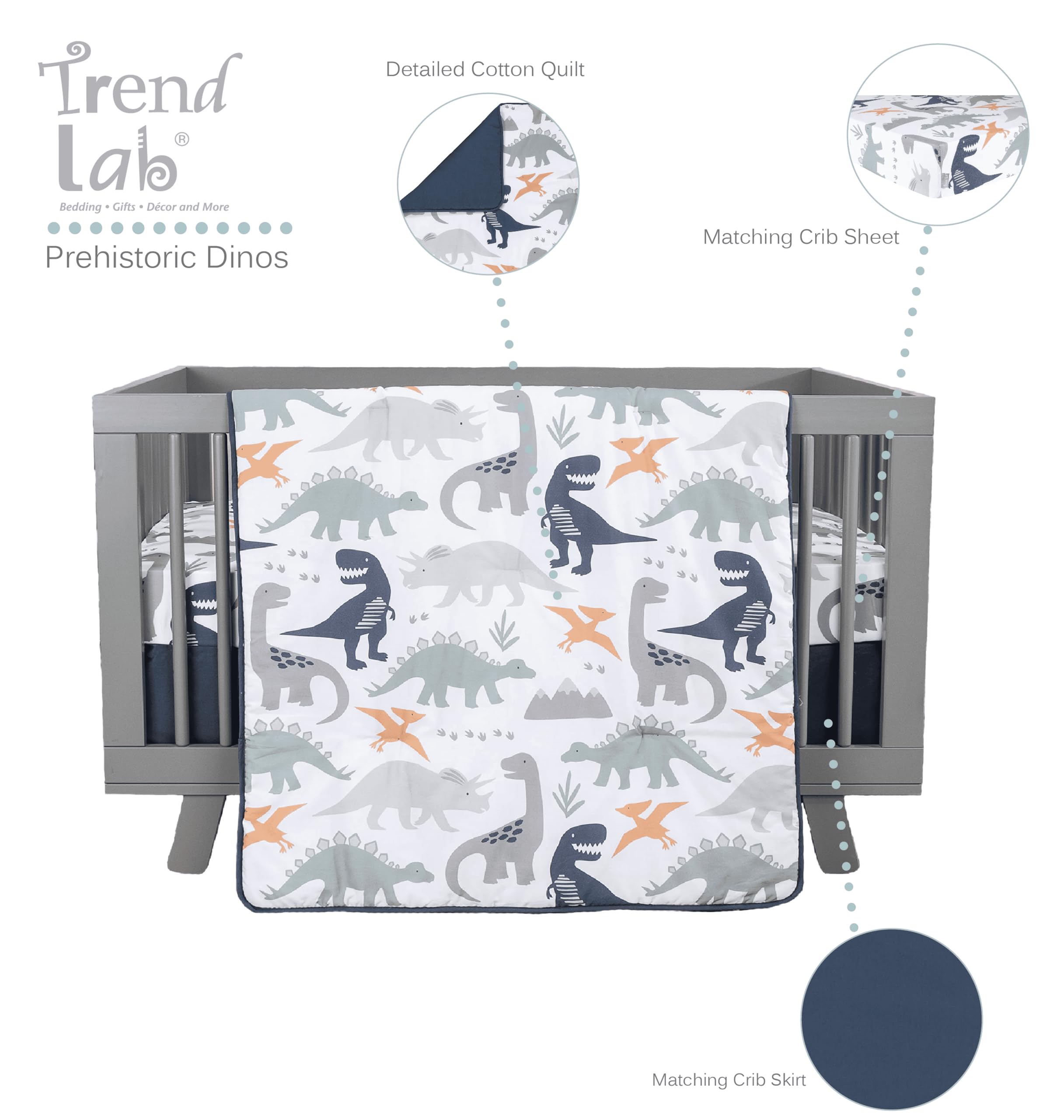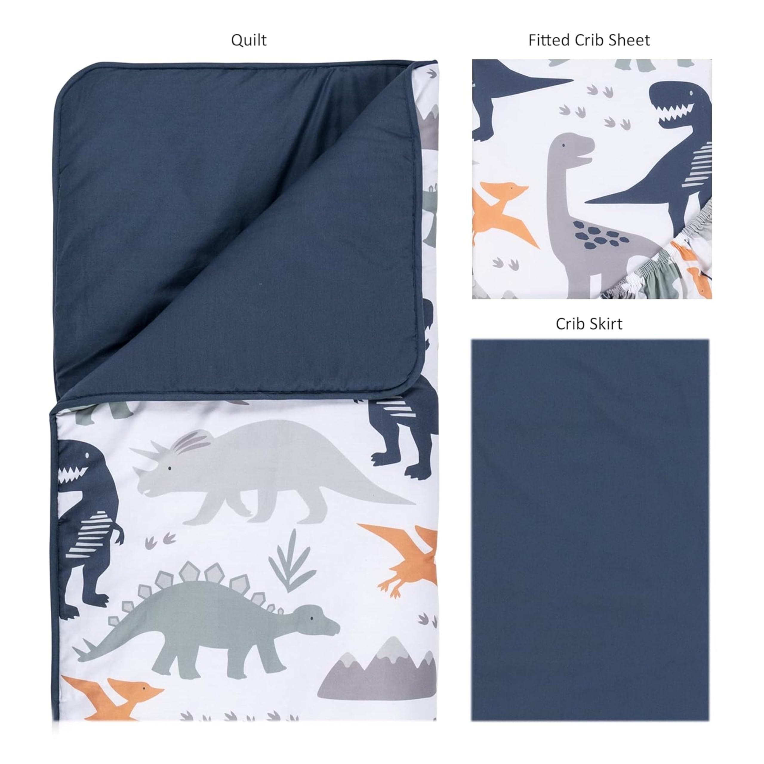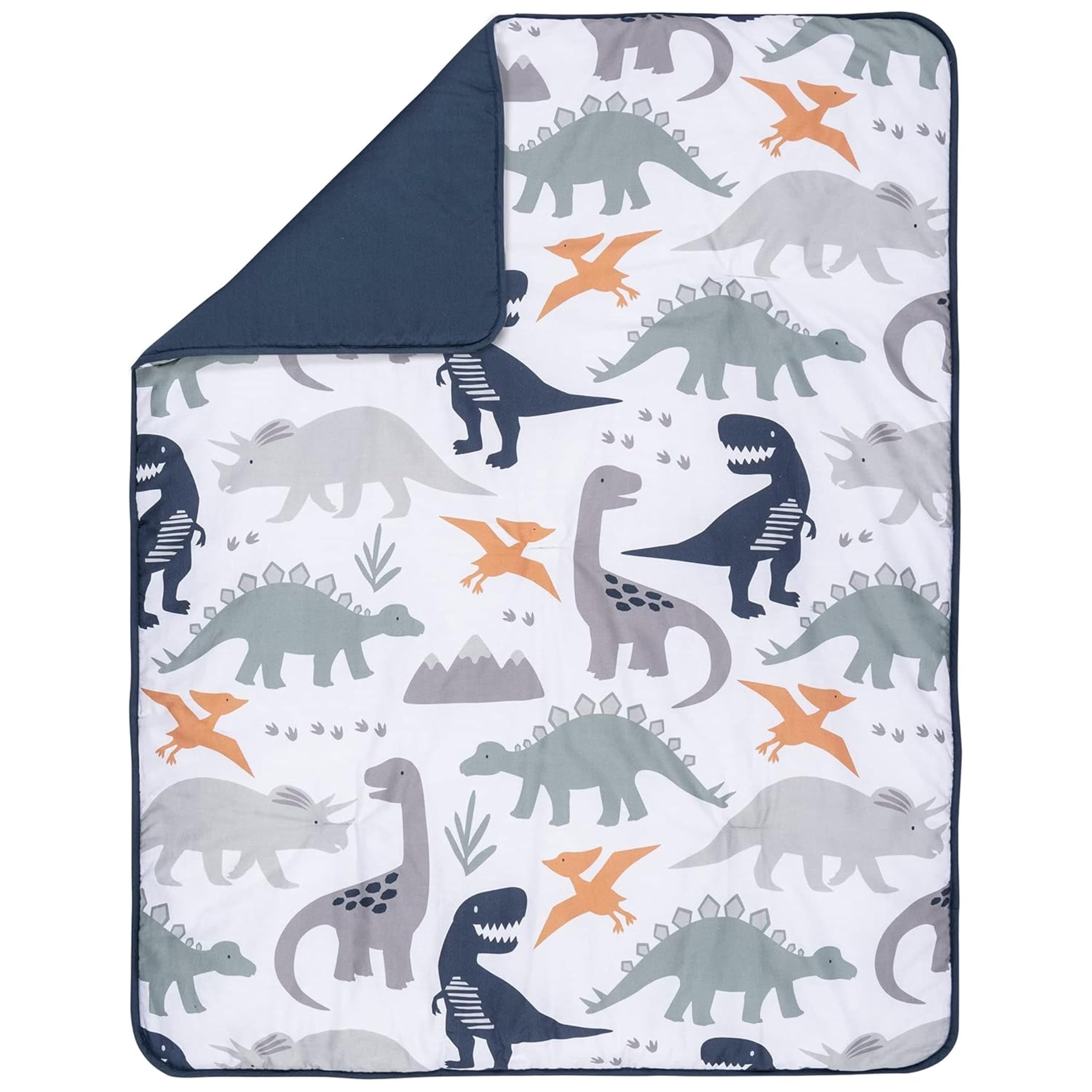 Quilt measures 35 in x 45 in and features a dinosaur scatter print on the front, in paloma gray, navy blue, forest green and orange on a white background with a navy-blue border