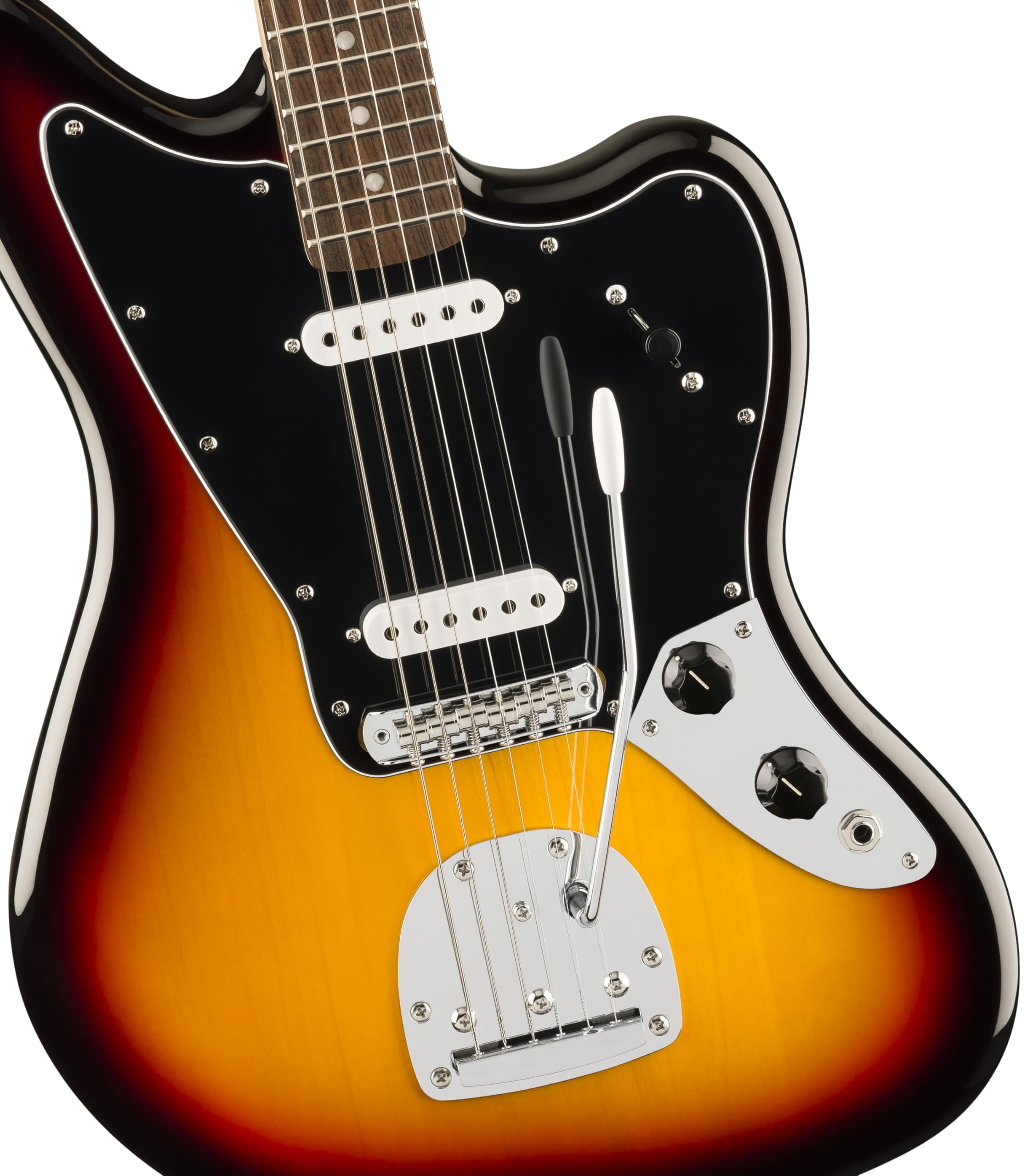 A superb gateway into the time-honored Fender family, the Squier Affinity Series Jaguar delivers legendary design and quintessential tone for today’s aspiring guitar hero. This model features several player-friendly refinements such as a thin and lightweight body, a slim and comfortable “C”-shaped neck with short 24“ scale length, a vintage-style tremolo and floating bridge for superior tremolo action and sealed die-cast tuning machines with split shafts for smooth, accurate tuning and easy restringing. Loaded with two Squier single-coil pickups with 3-way switching for genre-defying sonic variety, this model is ready to accompany any player at any stage.