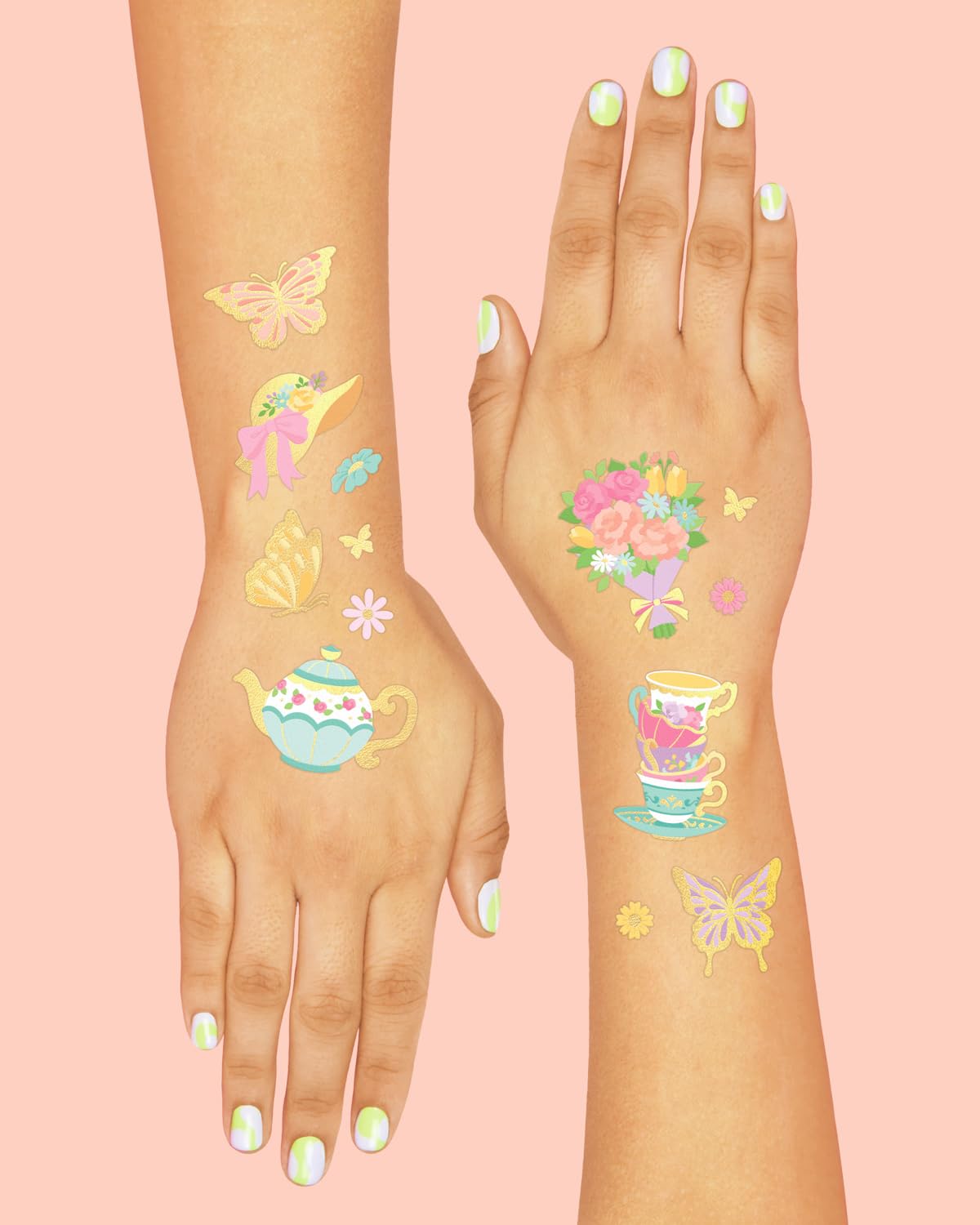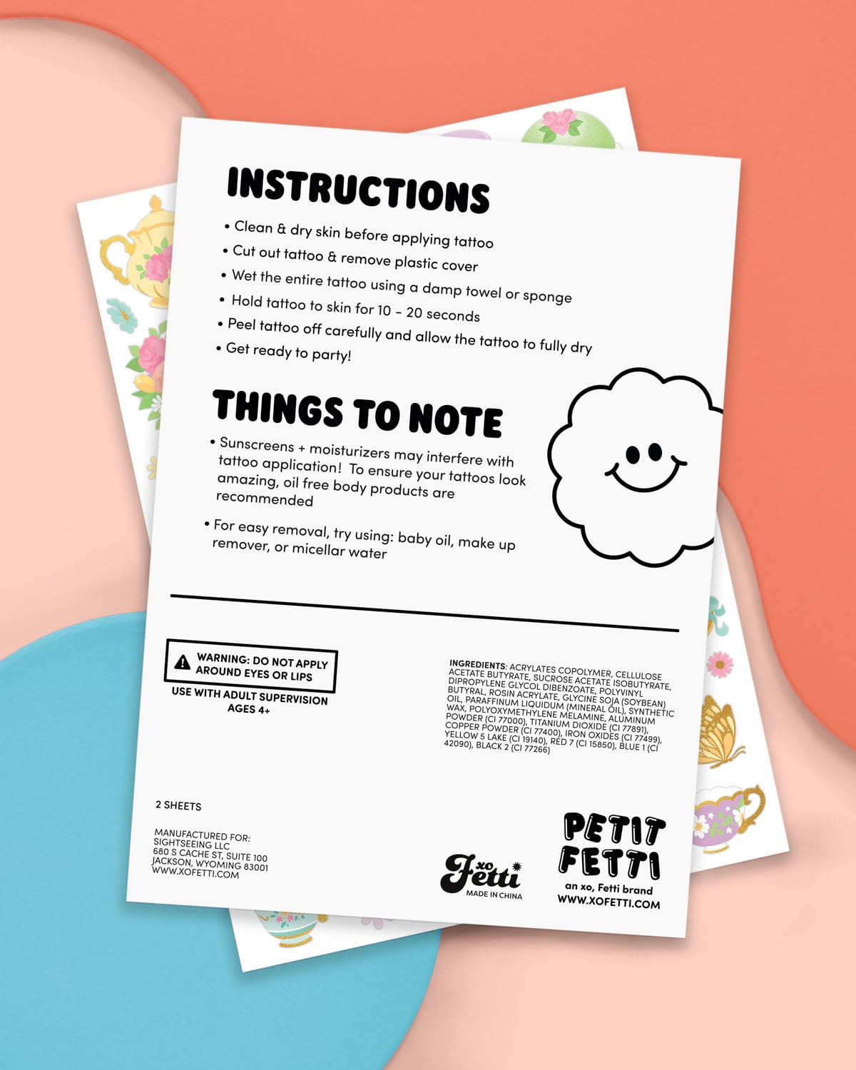 These temporary tattoos are a tea party must have. Not only are they super cute, but guests will love them too! With 48 tattoos in total, every party guest will get their own. With designs like tea cups, butterflies, macaroons, tea kettles, cupcakes + more there is sure to be a favorite for everyone. Ready to apply? Use our easy to follow instructions on the back of the tattoo sheet. Once applied, get ready to party day into night since these are long lasting, durable, and waterproof. So, are you ready to throw the cutest tea party of all time? We got you girl (: