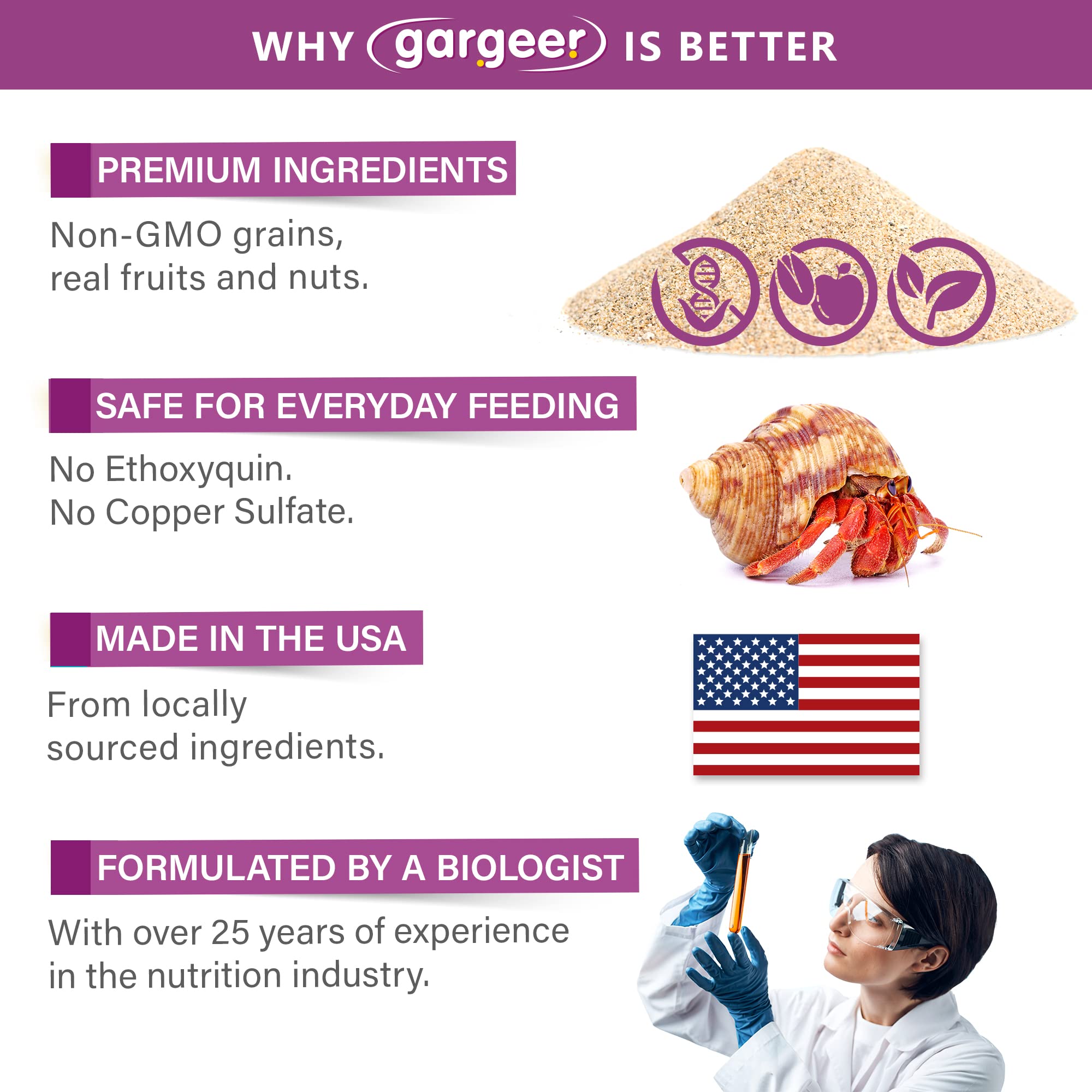 SAFE. Gargeer’s Hermit Crab diets contain no harmful ingredients, such as ETHOXYQUIN or COPPER SULFATE.