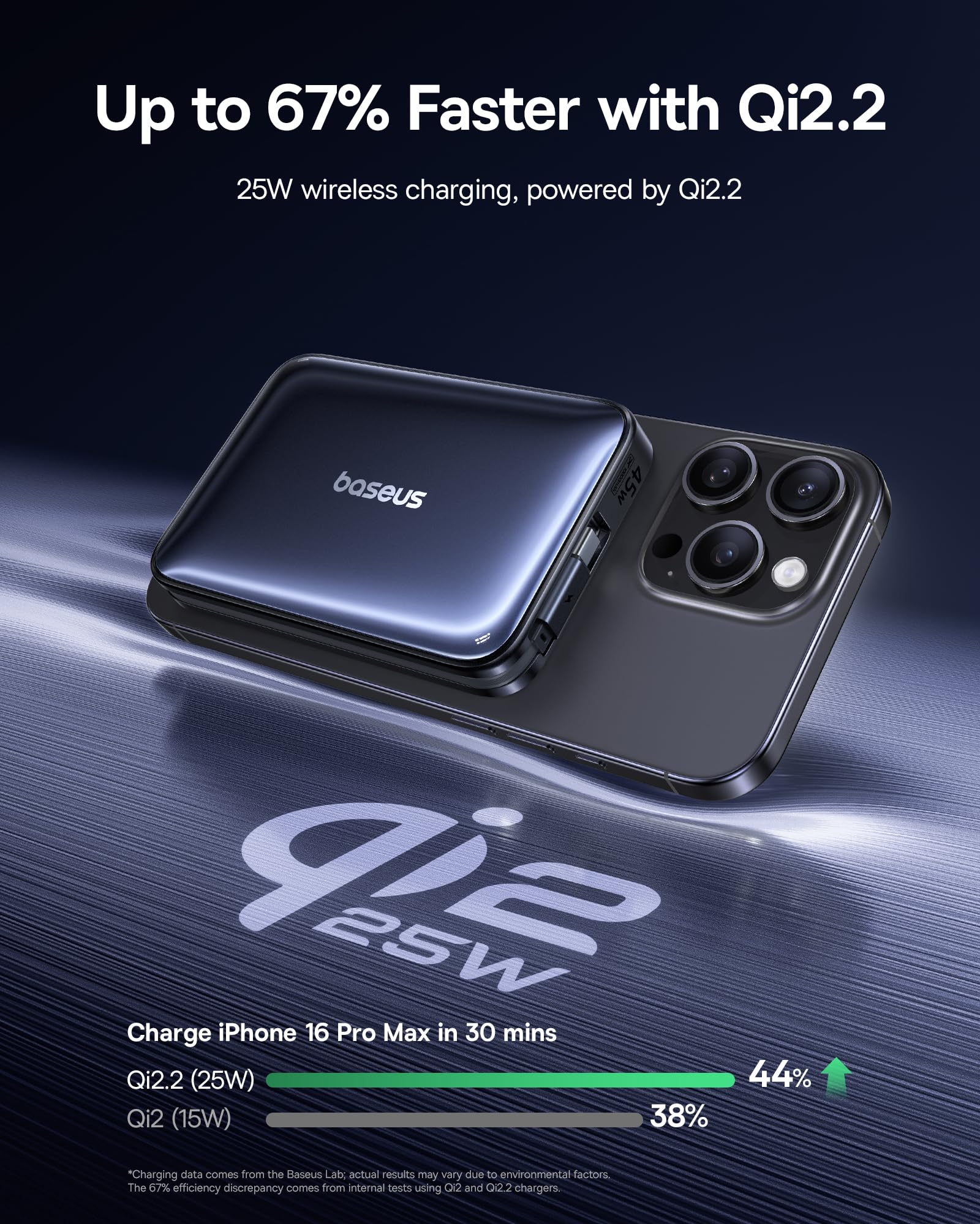 đĄď¸ă25W Faster Wireless Charging with Latest Qi2.2 CertificationăExperience ultra-fast 25W wireless charging, up to 50% faster than standard 15W MagSafe. Powered by the latest Qi2.2 wireless charging protocol certification. This portable charger delivers maximum wireless compatibility and efficiency, making it an ideal MagSafe charger for iPhone 17 and Samsung devices.
