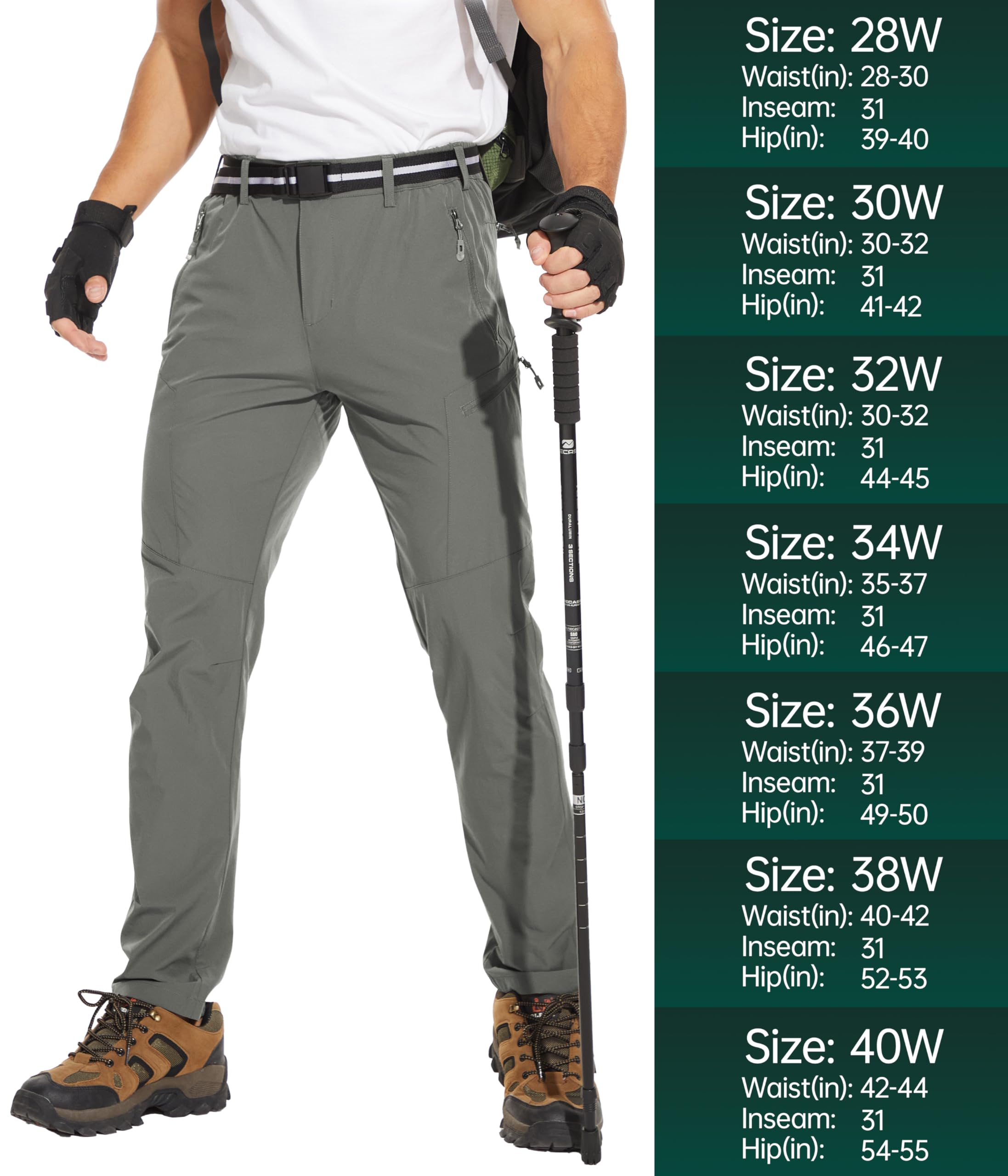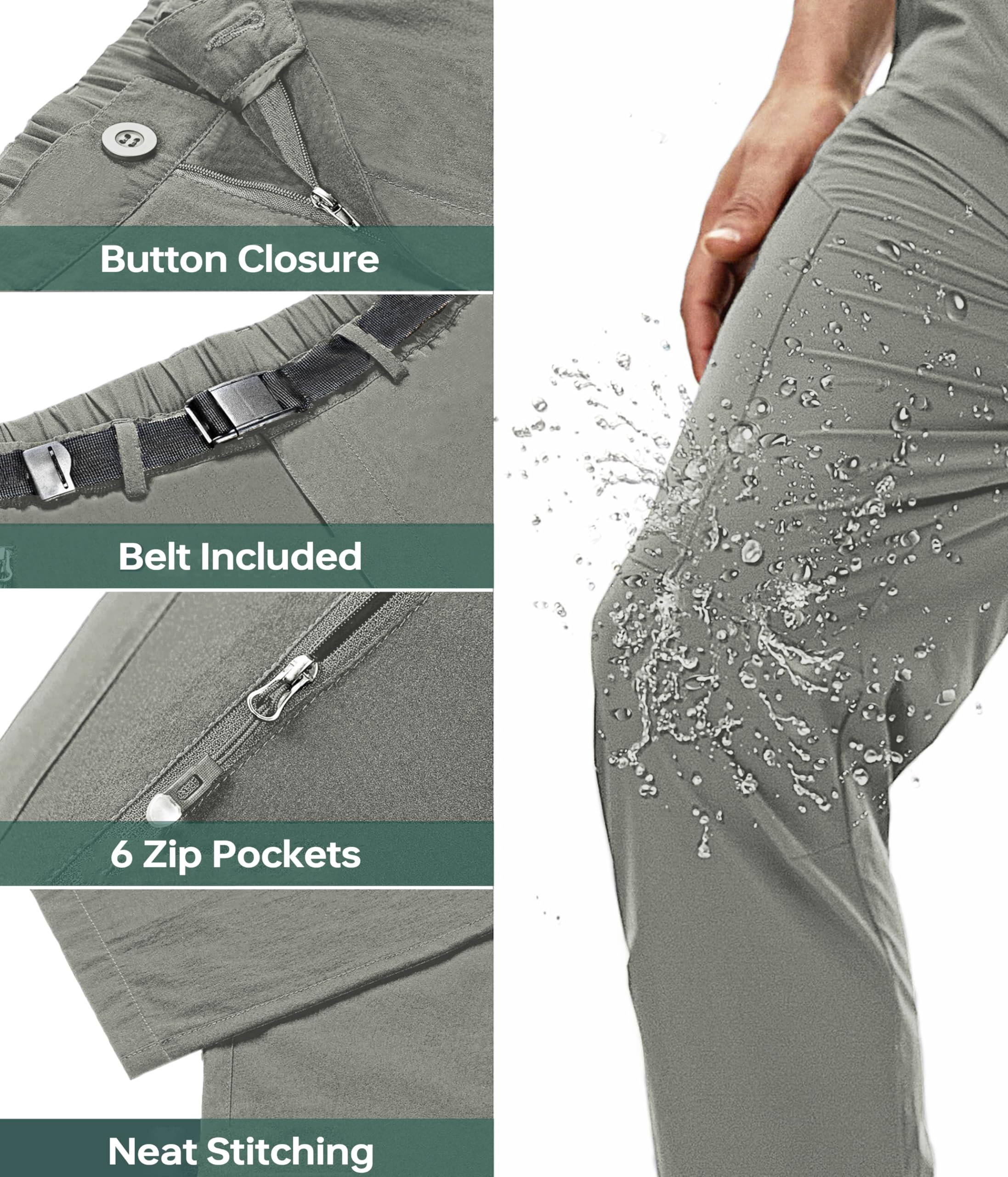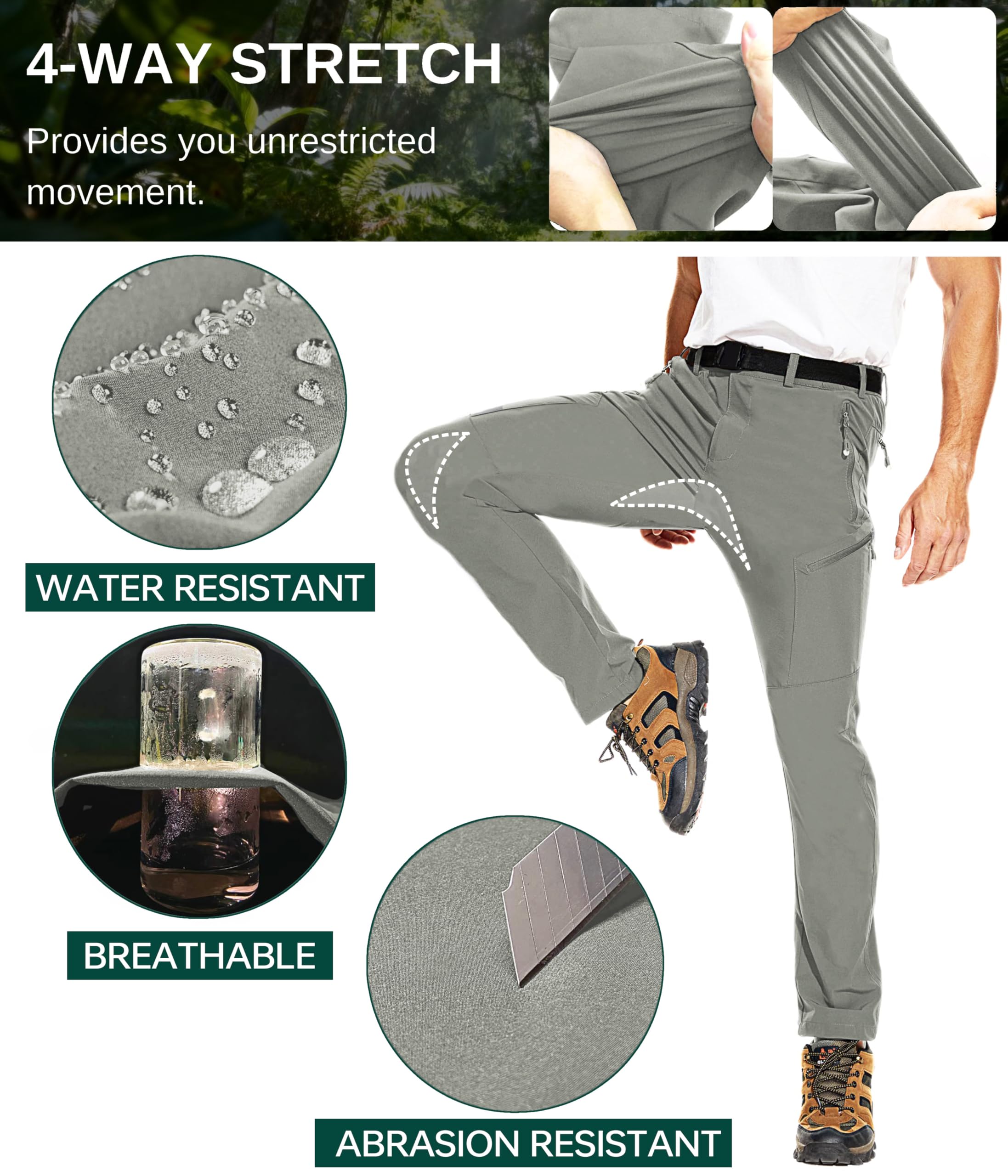 【Stretchy & Quick Dry Material】Our travel pants for men are made of durable material, which is 4-way stretch, quick dry and water resistant. No more annoyance of moisture when hiking with these waterproof hiking pants men