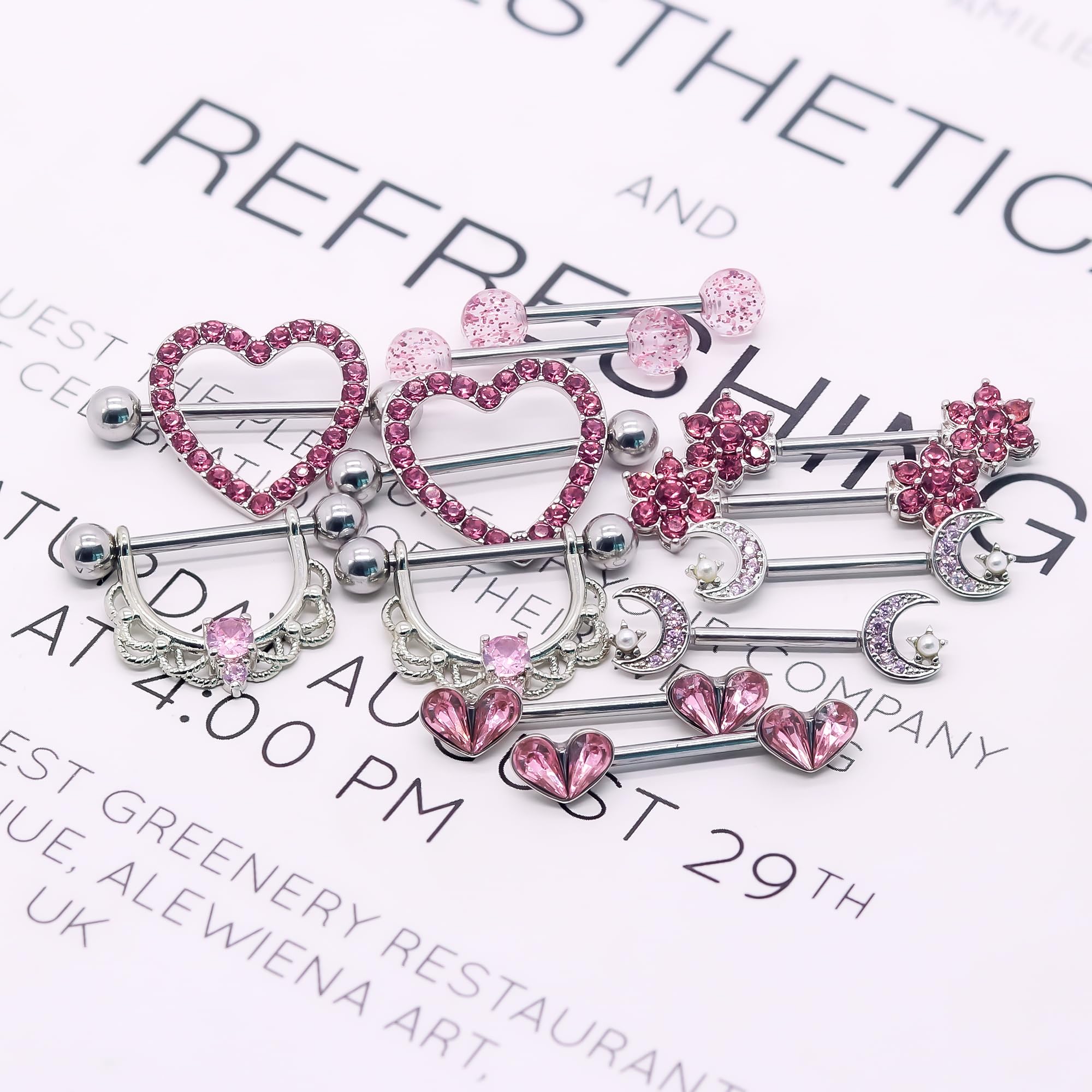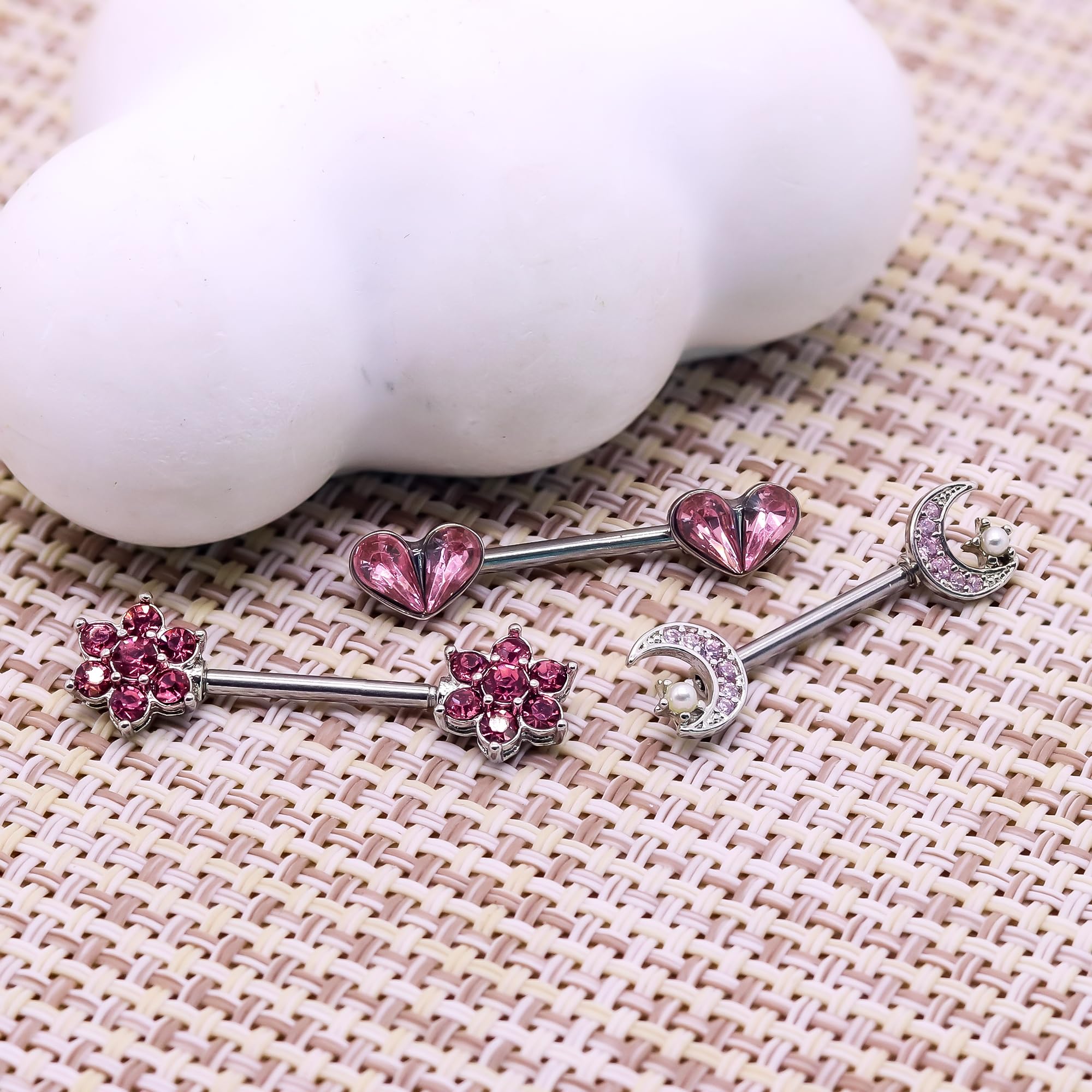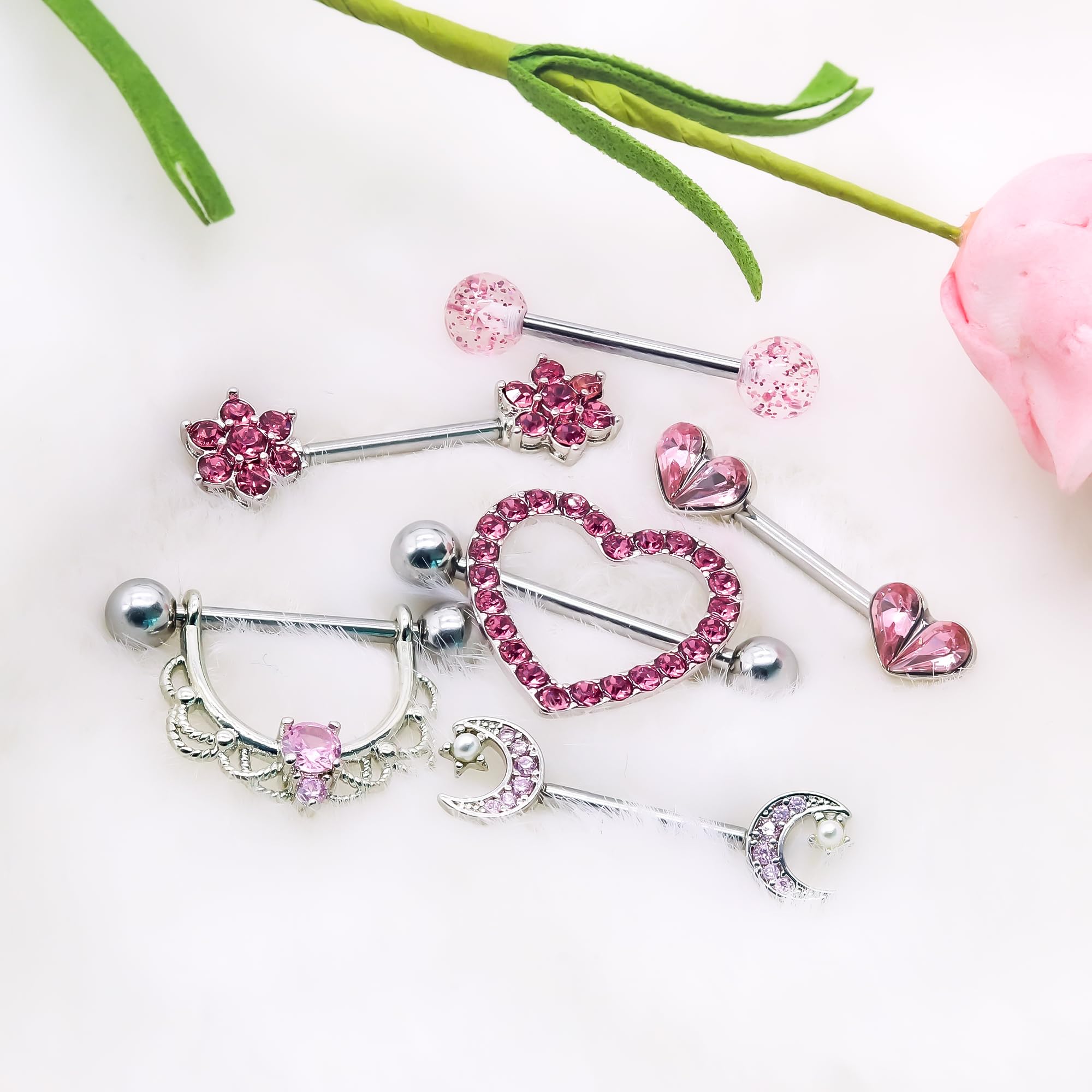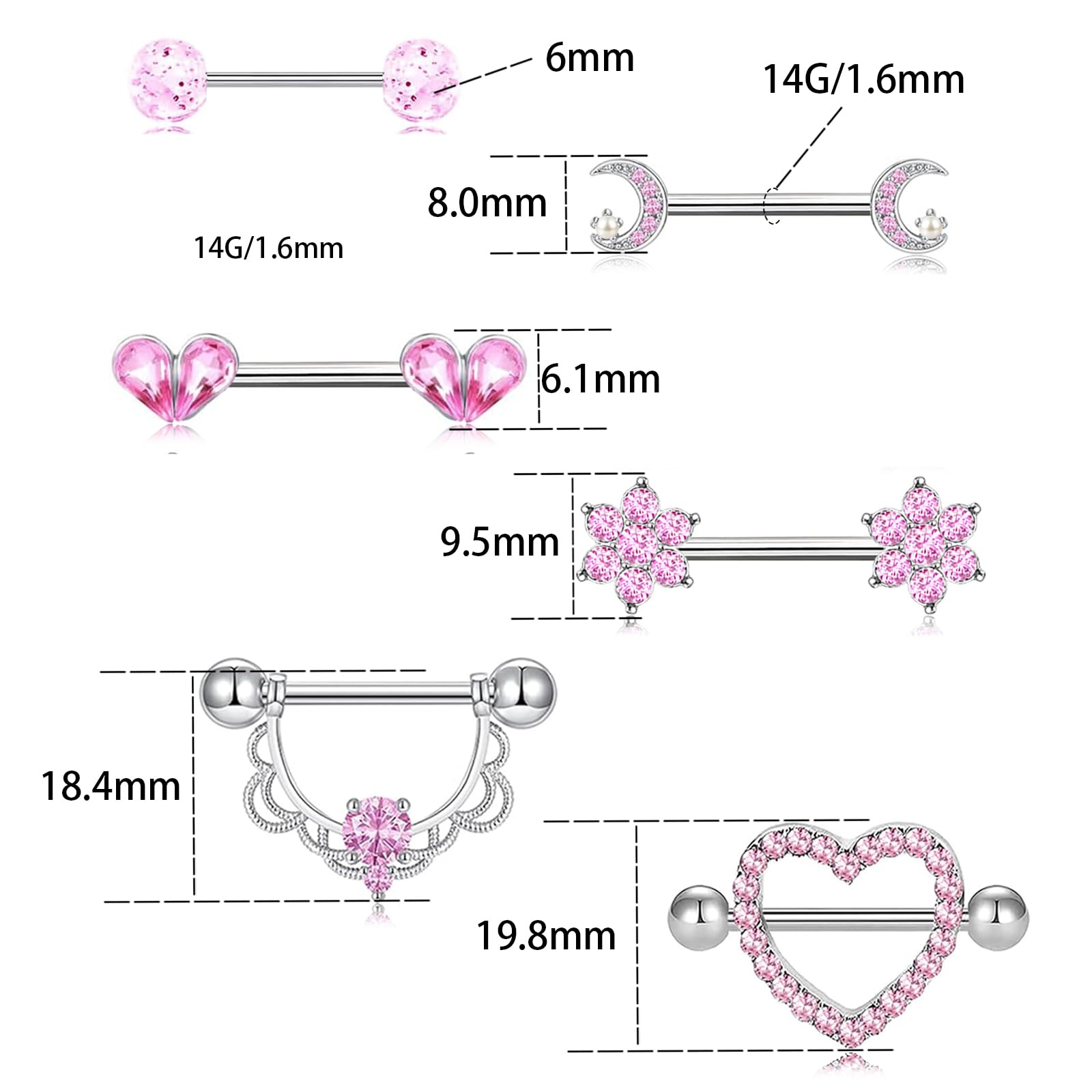 Product Style: 6 Pairs 14G Heart,Flower,Moon etc CZ nipple barbell design sexy jewelry for women.
