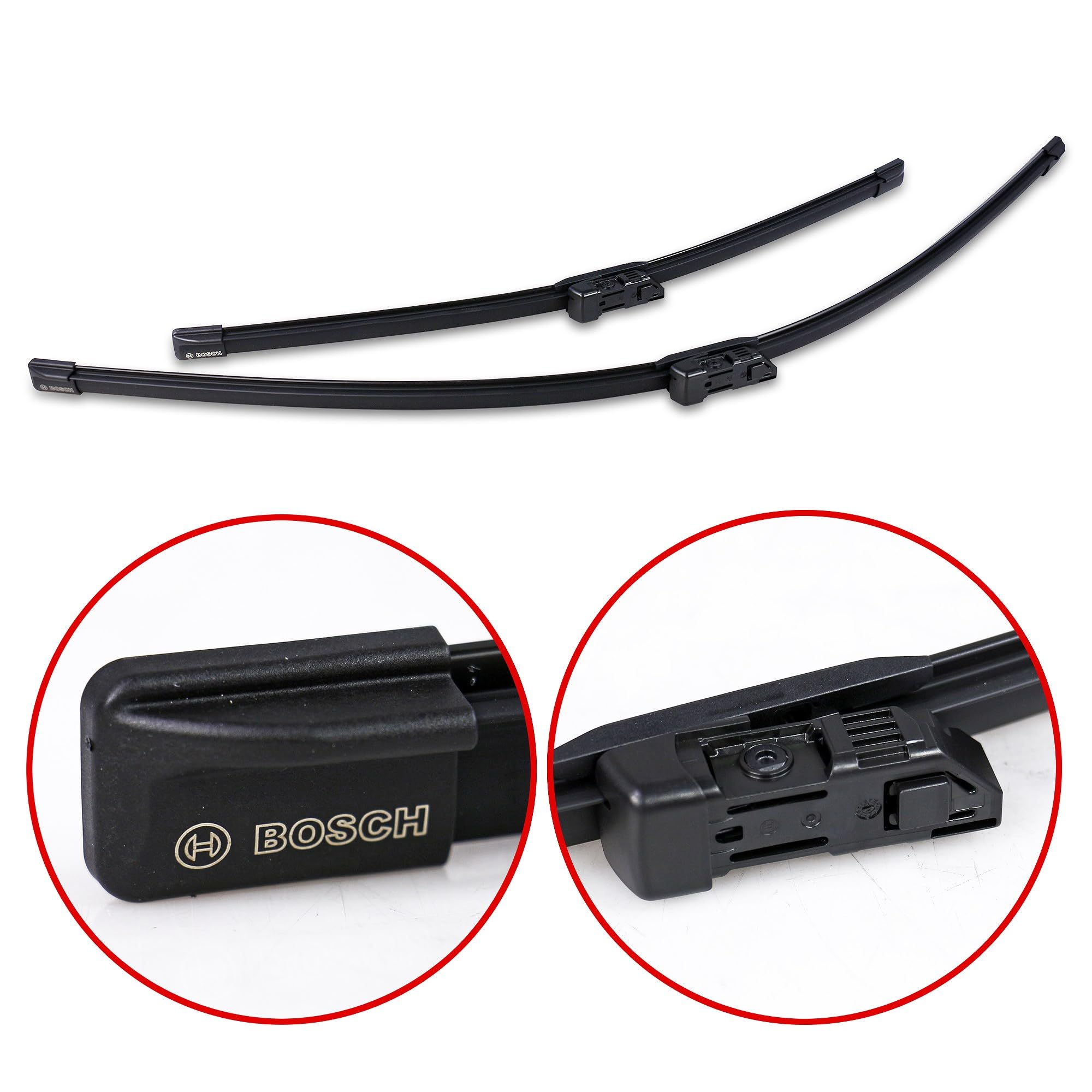 Bosch AeroTwin's patented beam design contains no metal or plastic brackets, joints or hinges, offering an ideal technology upgrade for vehicles originally fitted with conventional wiper blades. The specially blended dual rubber compound with graphite coating removes even the smallest traces of water for exceptional all-weather visibility and smooth, quiet operation. Specific beam curvature for OE specialty wiper arm types, coupled with dual precision-tensioned steel springs, ensures uniform pressure along the entire blade length for crystal clear visibility. Built-in asymmetrical wind spoiler uses air flow to increase blade-to-windshield contact - for consistent performance at highway speeds. Wind spoiler also serves to protect the tension springs from damage by severe weather elements for increased durability and long life. Pre-assembled OE style adapter provides OE fit and function for simple, easy installation on specific vehicles. Set of 2. Note: AeroTwin wiper blades are designed to fit vehicles with specific wiper arm connnection types - they are not universal fit wiper blades. Please verify specific vehicle fitment details with fit checker above.
