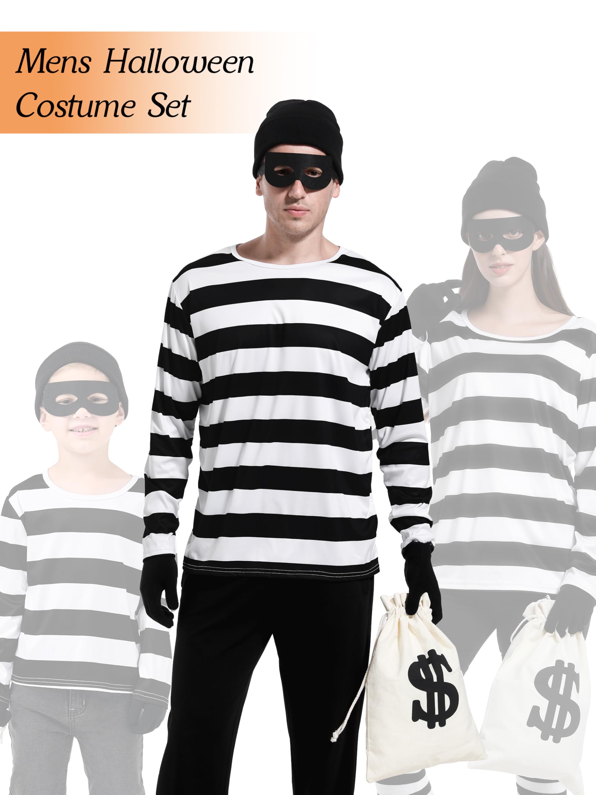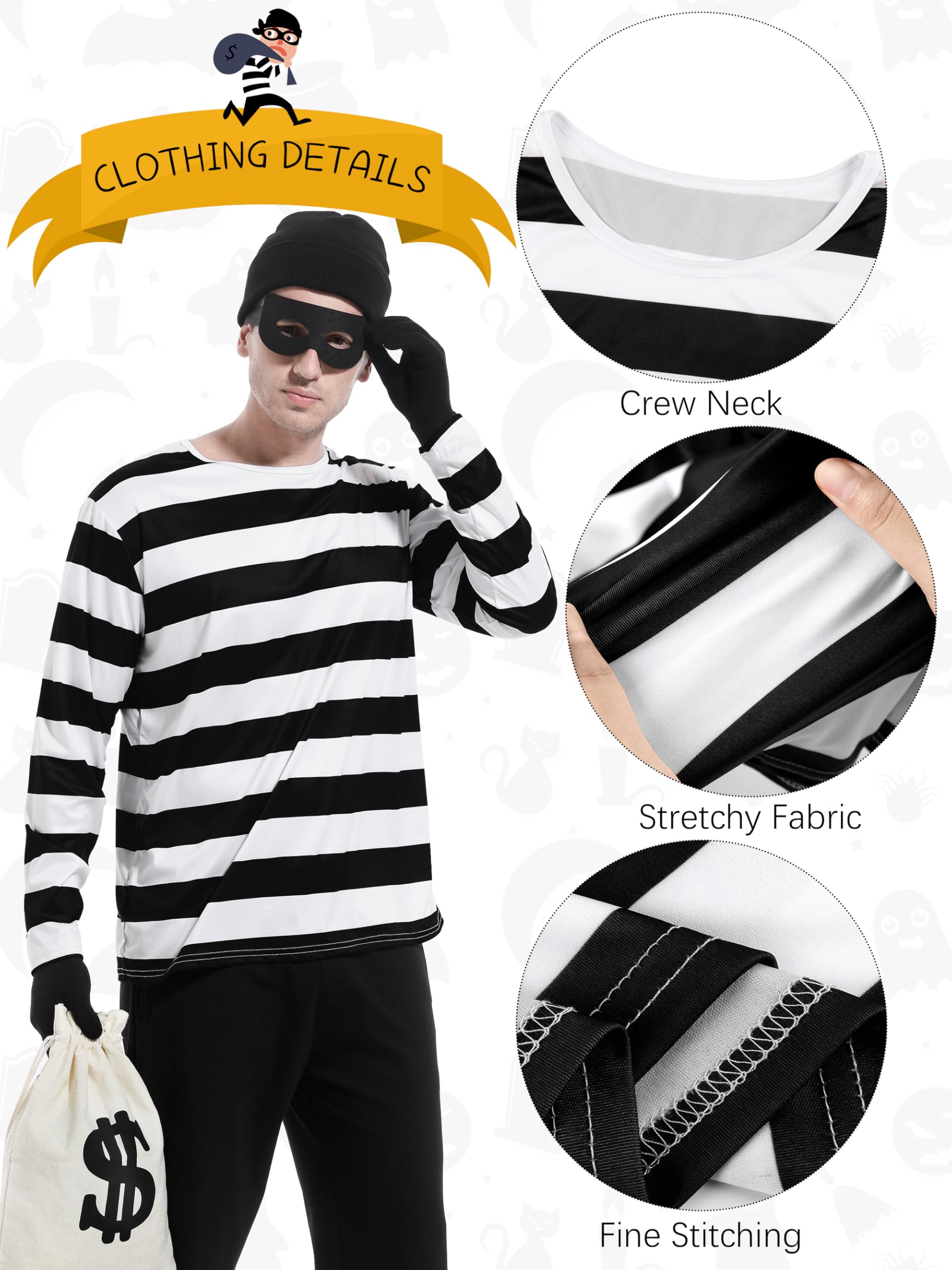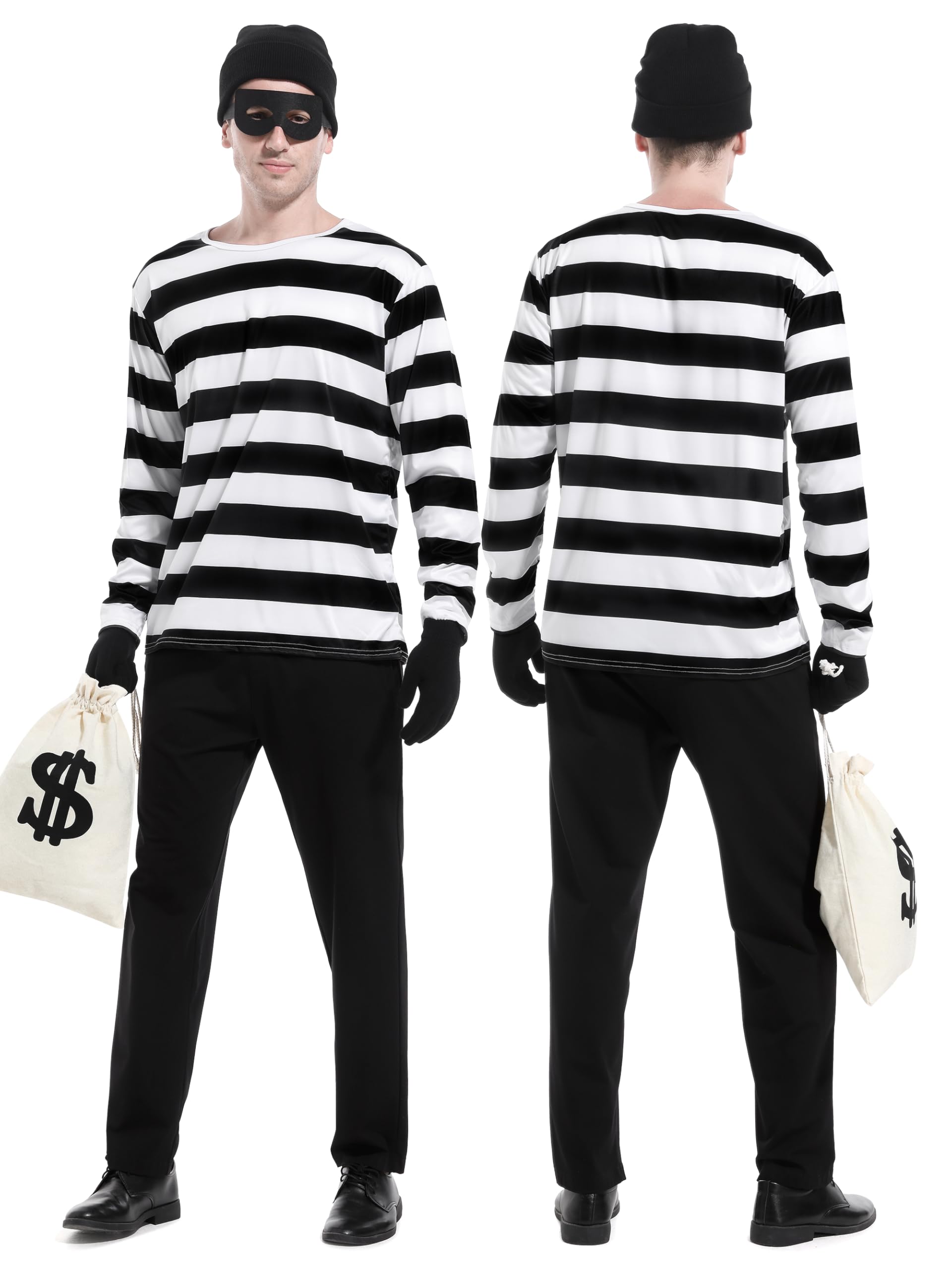 Halloween costume set includes: 1 black and white striped long-sleeved shirt, 1 beanie hat, 1 pair of eye masks and black gloves, 1 canvas money bag with drawstring closure