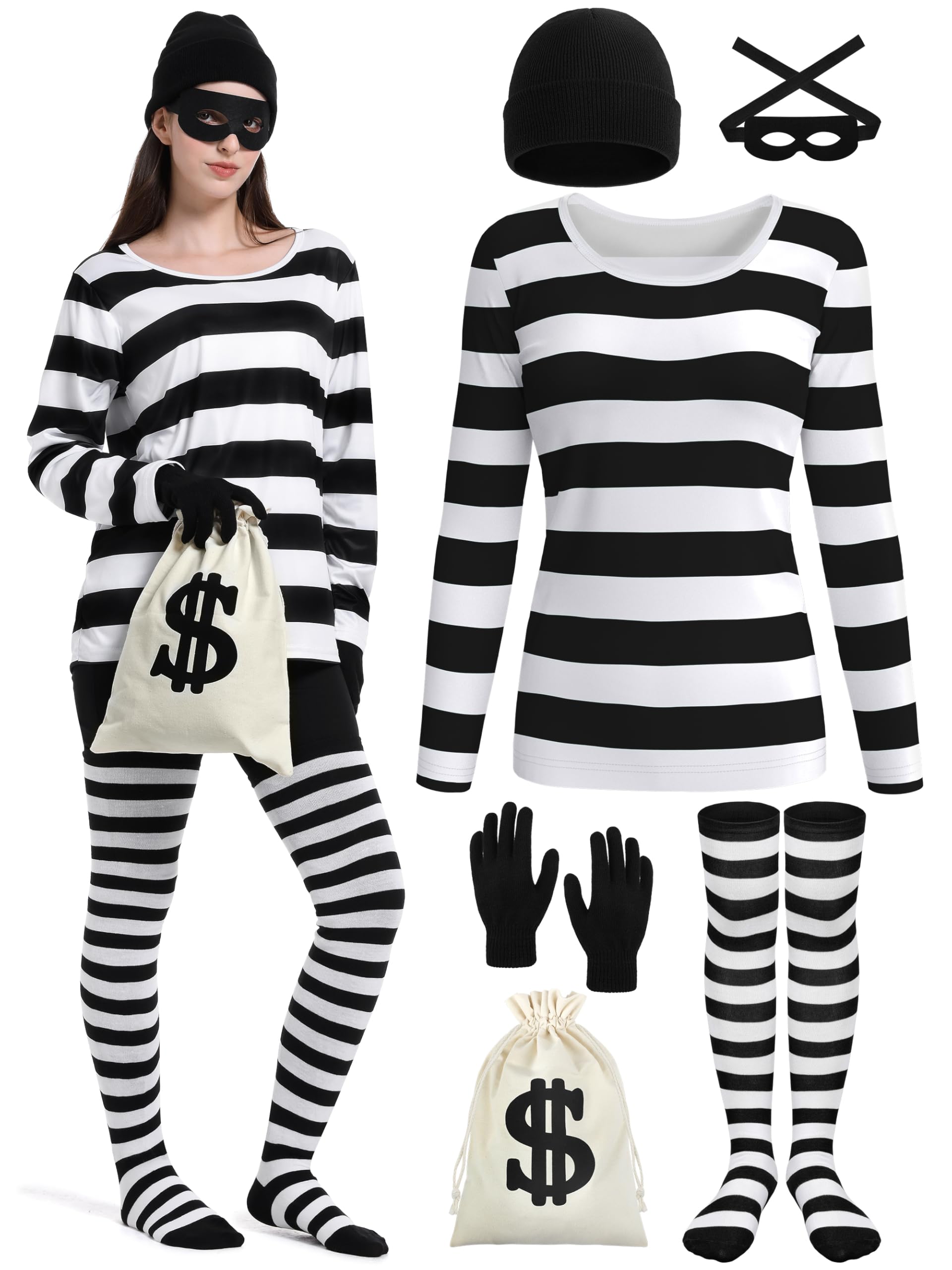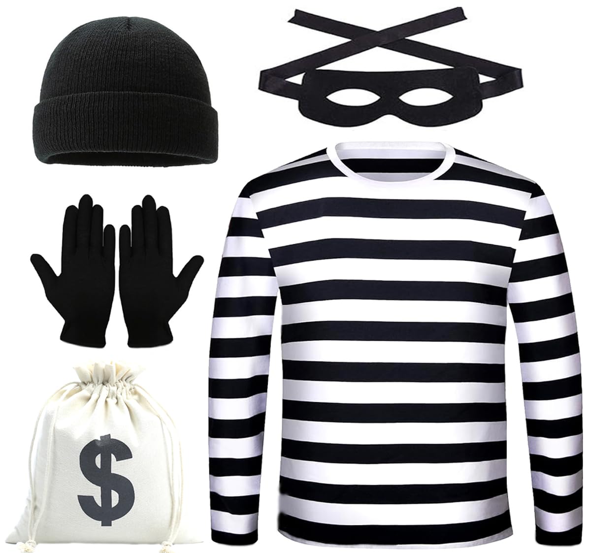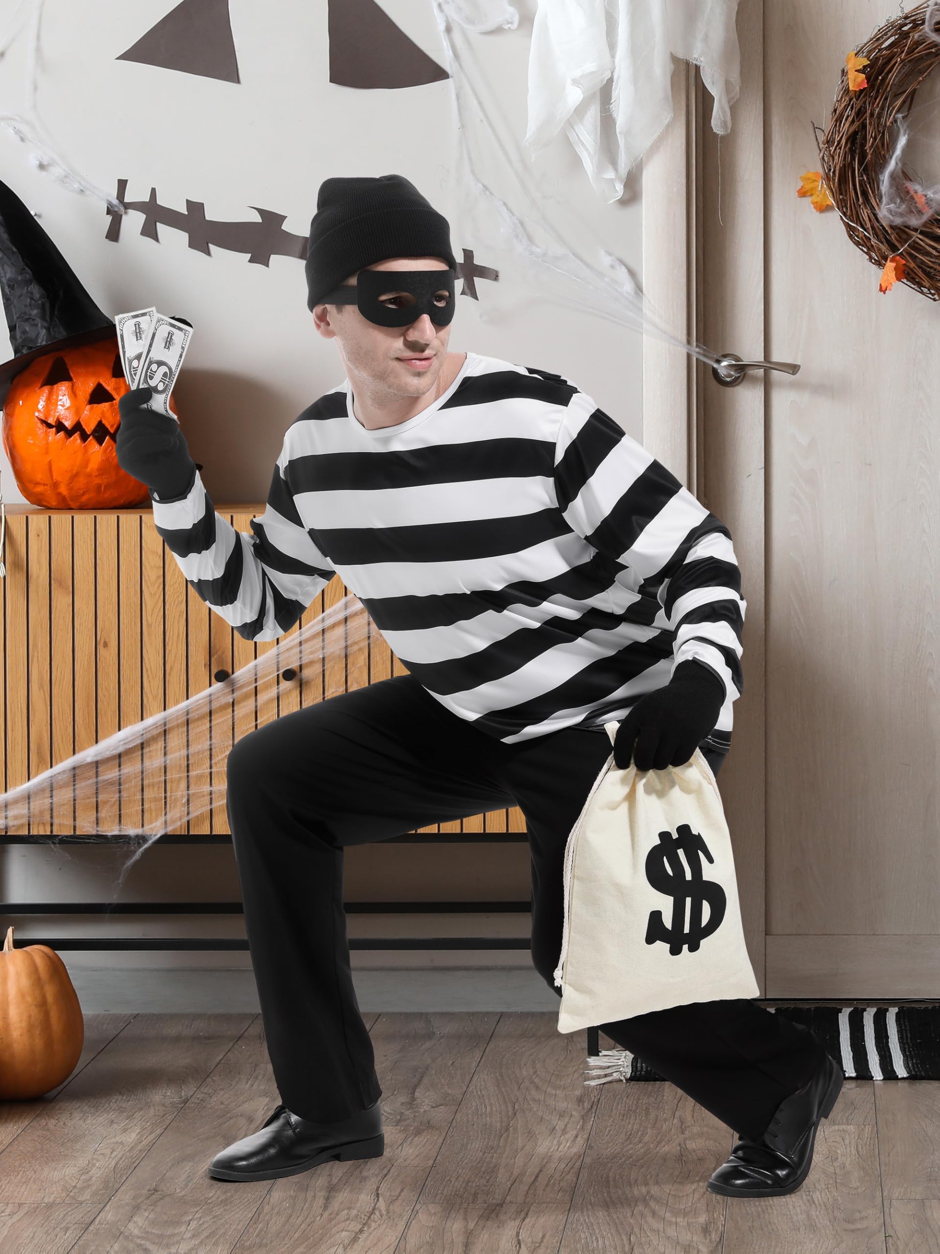 Halloween costume set includes: 1 black and white striped long-sleeved shirt, 1 beanie hat, 1 pair of eye masks and black gloves, 1 canvas money bag with drawstring closure