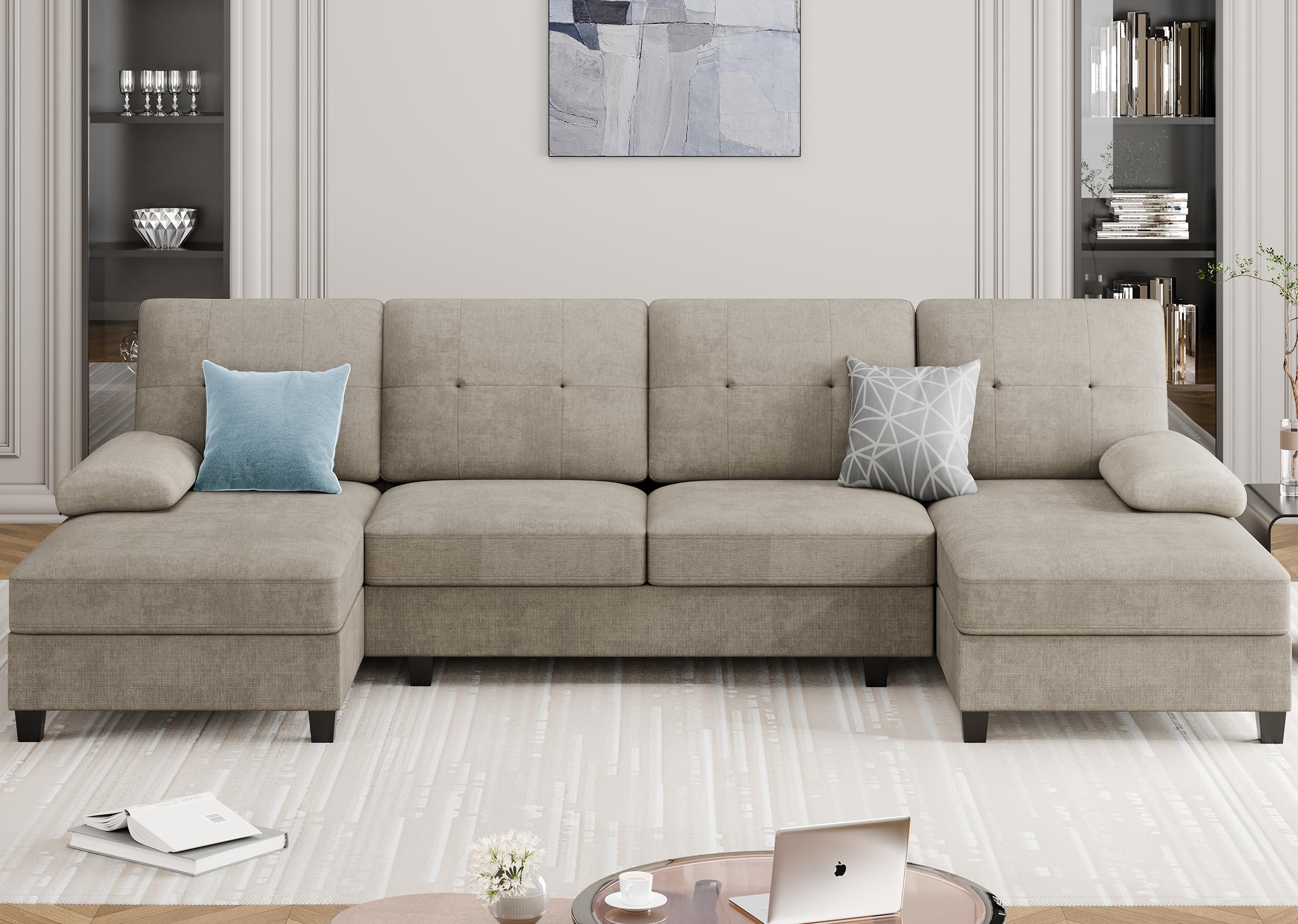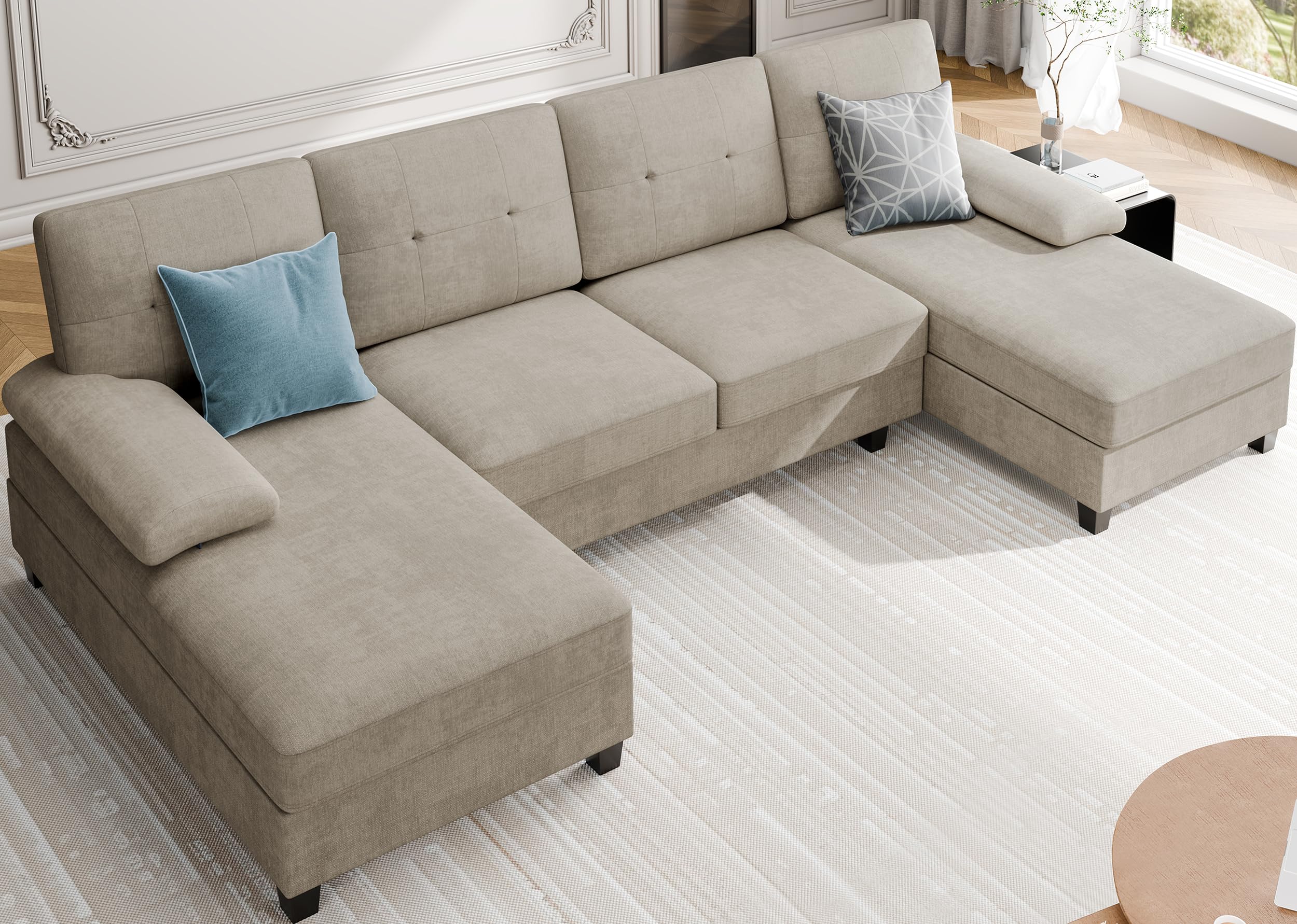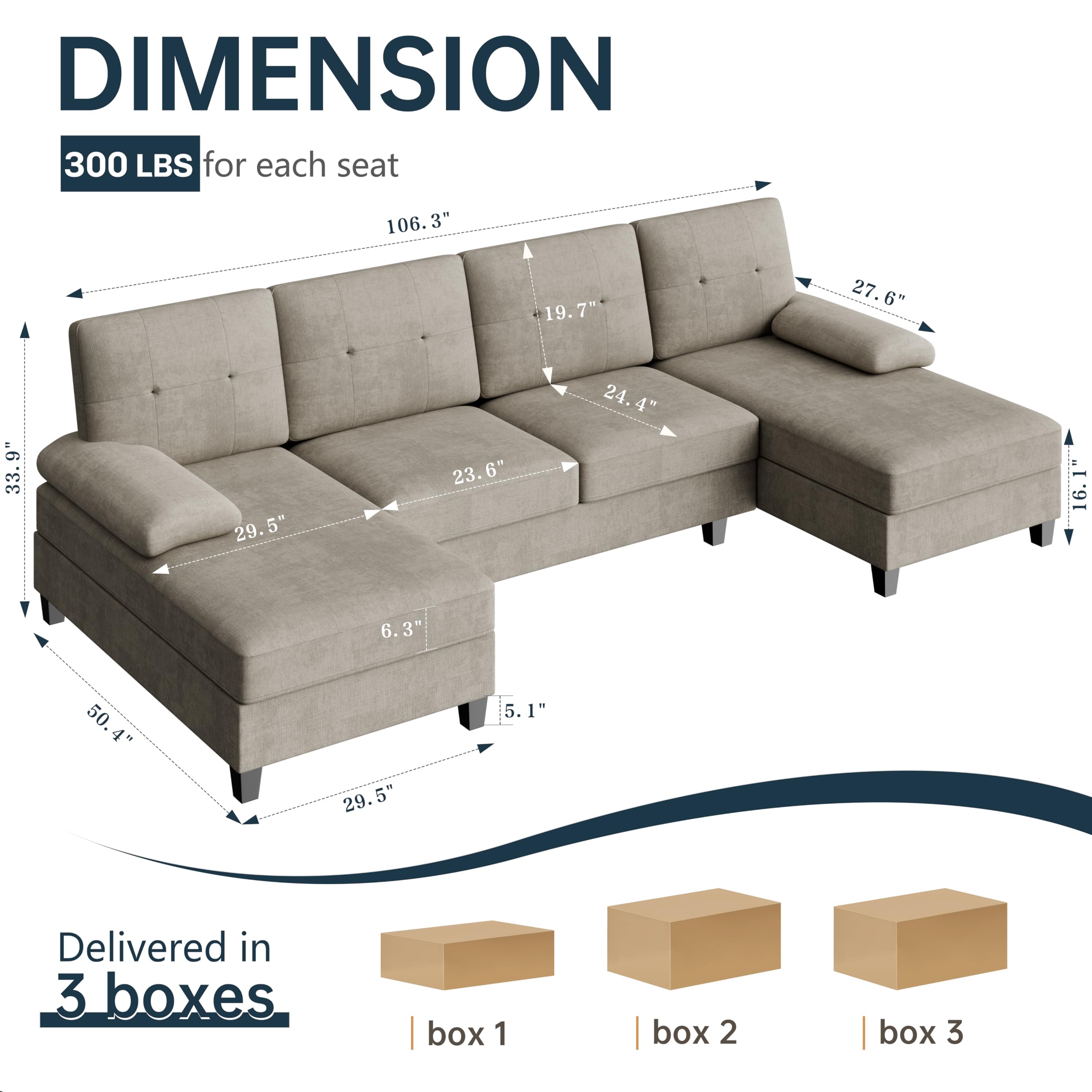 [HIGH QUALITY] Wood frame and breathable fabric surface, this couch is definitely sturdy for long-time use. 300lbs for each seat. Overall dimension of this couch: 106.3" x 50.4" x 33.9". Seat height: 16.1". With 2 wide chaise lounges, the sectional couches for living room can seat up to 4 people together