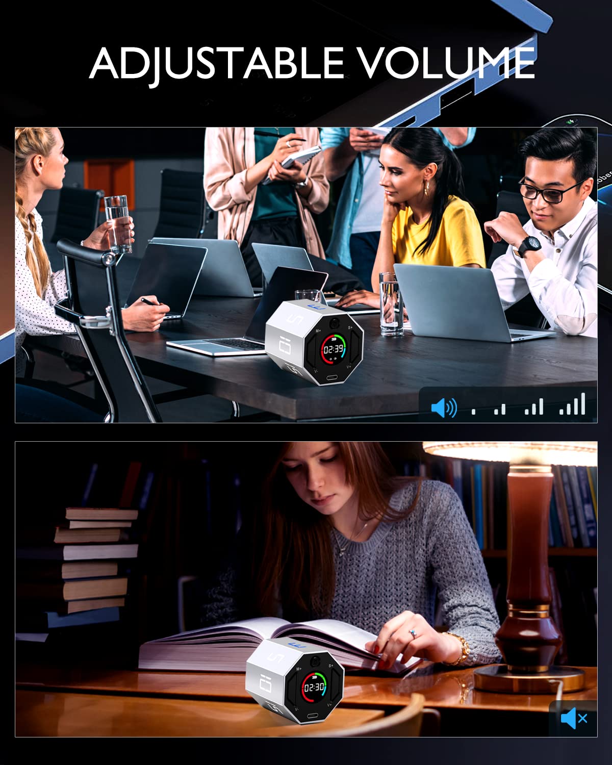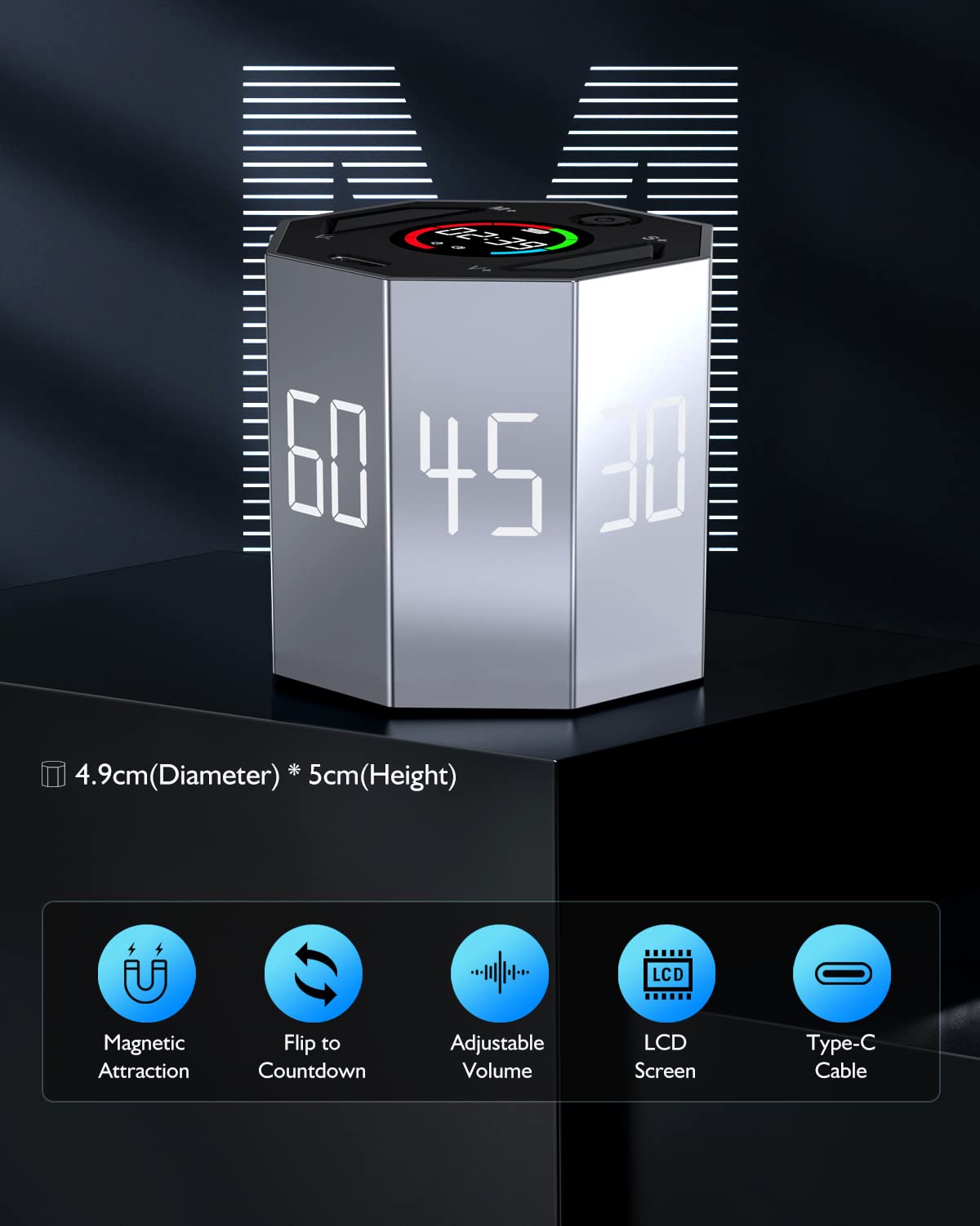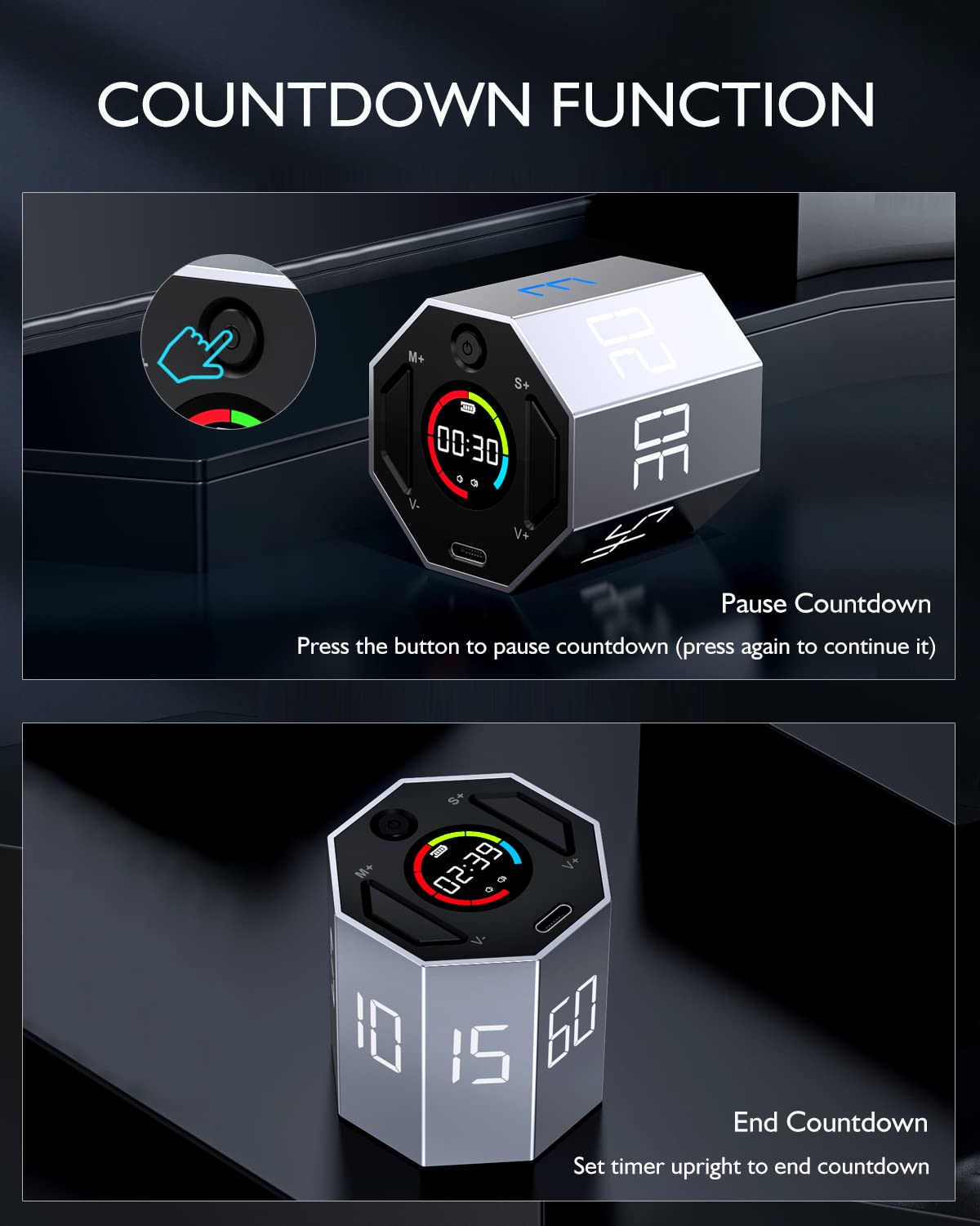 OCTAGONAL GRAVITY TIMER - FLIP TO SET TIME: [upgrade] Pomodoro timer 2.0 has 8 preset countdowns (3/5/10/15/20/30/45/60 minutes), Just flip up any side of the Pomodoro timer to set your countdown, you can set it with one hand when you are busy. Also supports custom countdown(the maximum time is 99:59) which widely suits your daily study, fitness yoga, work meetings, kitchen cooking, etc.