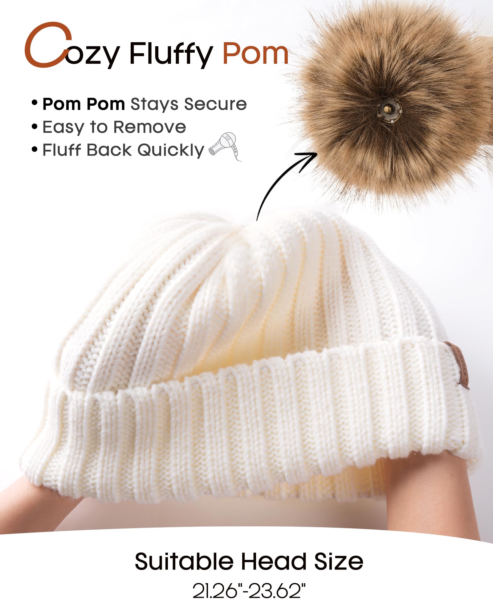 Pom Pom Hat - The winter hat with a faux fur pompom,this puff ball is bigger,super cute and removable;The pom pom snaps securely in place when you want to wear it, and is easily removable when you don't;