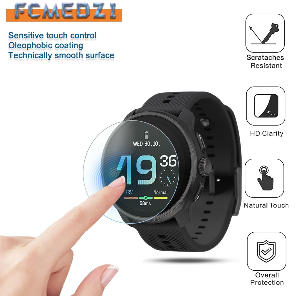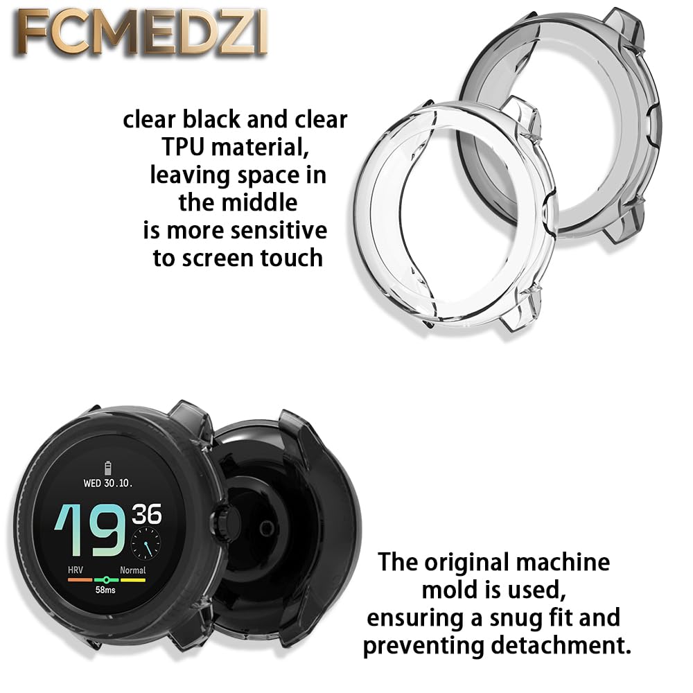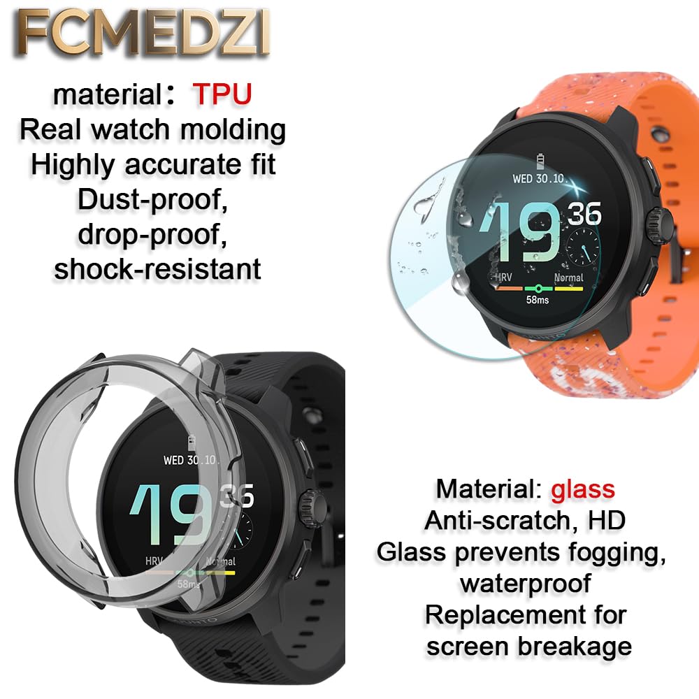 Product includes (3 pieces) FCMEDZI screen protectors and (2 cases) protective covers, Suitable for Suunto Race S smartwatch. The Race S screen protector features: - Tempered glass with 9H hardness - 2.5D curved edge design - 98% light transmittance - 98% anti-reflective coating - HD clarity with touch sensitivity - Oleophobic coating technology - Smooth surface finish The Race S protective case features: - Premium ultra-thin TPU soft silicone material - Maintains touchscreen accuracy - Easy access to all ports and buttons - Does not interfere with strap insertion or sensors FCMEDZI professional protection offers: - Smartwatch-specific protection - Sweatproof and water-resistant properties - Soft, lightweight and durable construction - Effective protection against scratches and impacts - Enhanced wearing comfort experience