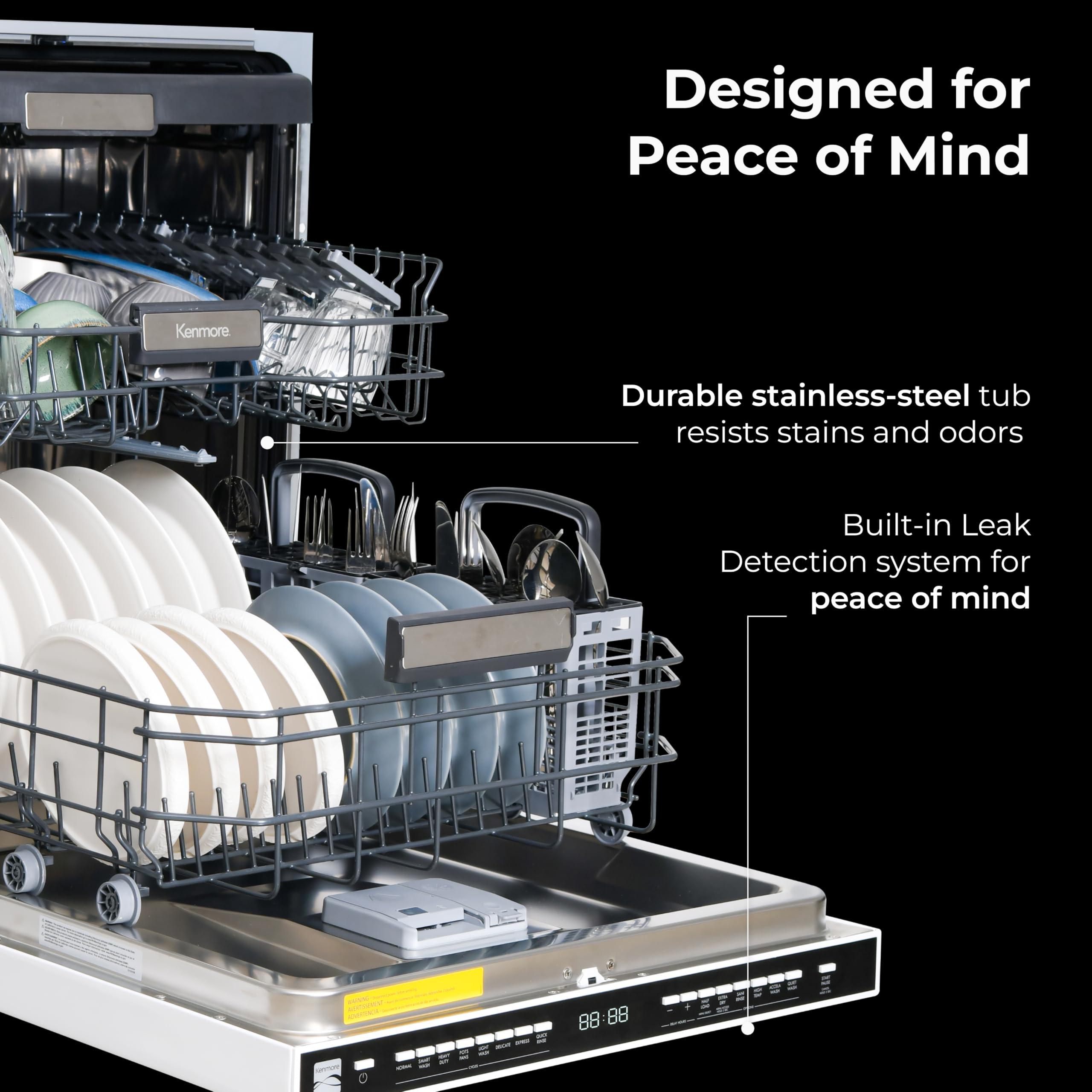 Tackle tough messes with the Kenmore 24" Built-In Dishwasher. UltraWash Plus uses 3 pressurized spray arms and filtered water for a powerful clean without pre-rinsing. The SmartWash cycle senses soil levels and adjusts settings automatically. Know it's good and clean with the UL Certified Sani Rinse Option. TurboDry combines a fan and heating element for dry, spot-free dishes. Fit up to 15 place settings with a flexible adjustable rack. Quiet Wash keeps things peaceful, while ENERGY STAR certification helps save water and energy. Built-in leak detection protects your home from water damage.