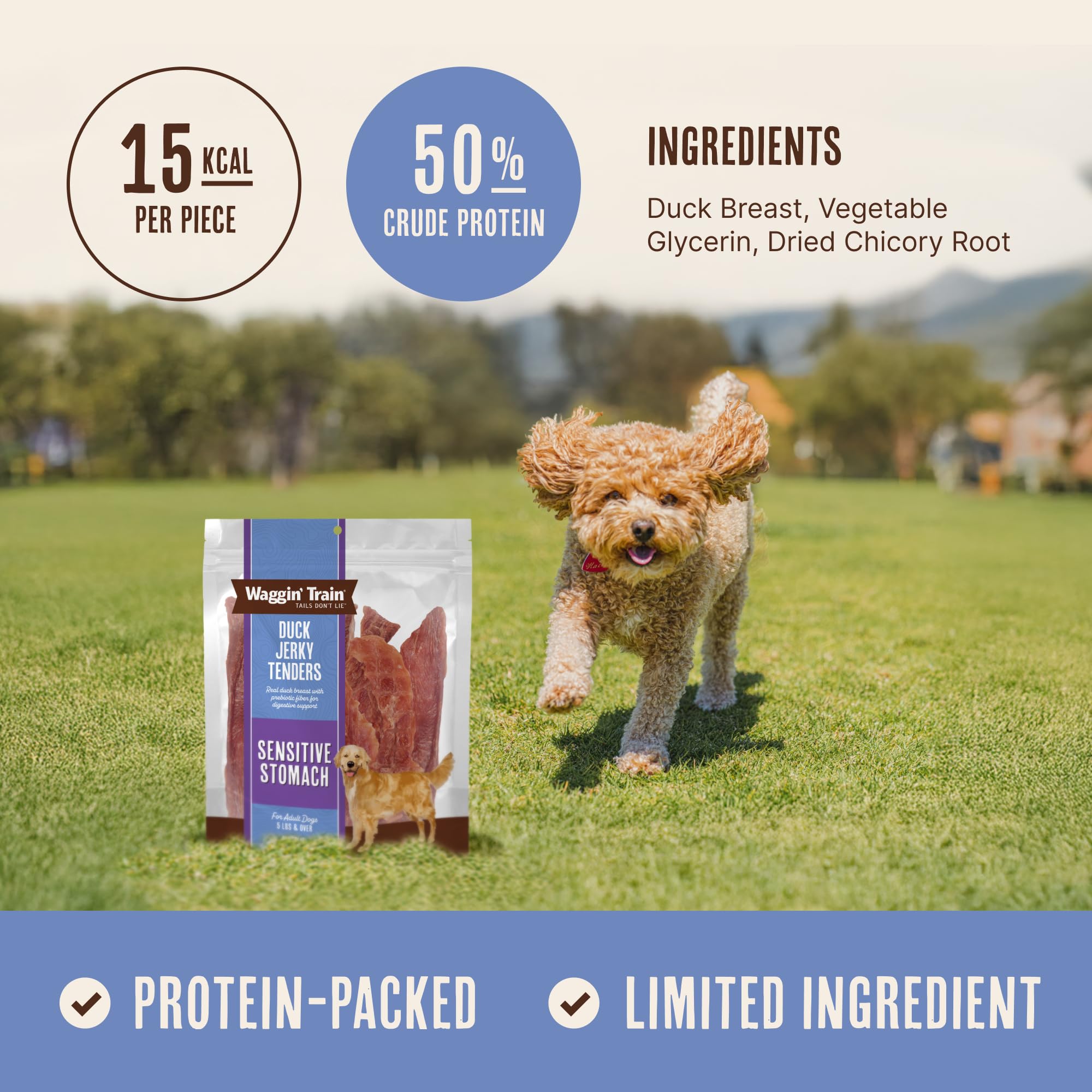 SIMPLE LIMITED INGREDIENTS: Your dog will be wagging their tail with joy when they taste Waggin' Train duck jerky dog treats! All of our dog jerky items are made with only real, simple ingredients and are perfect pet treats for any size adult dog