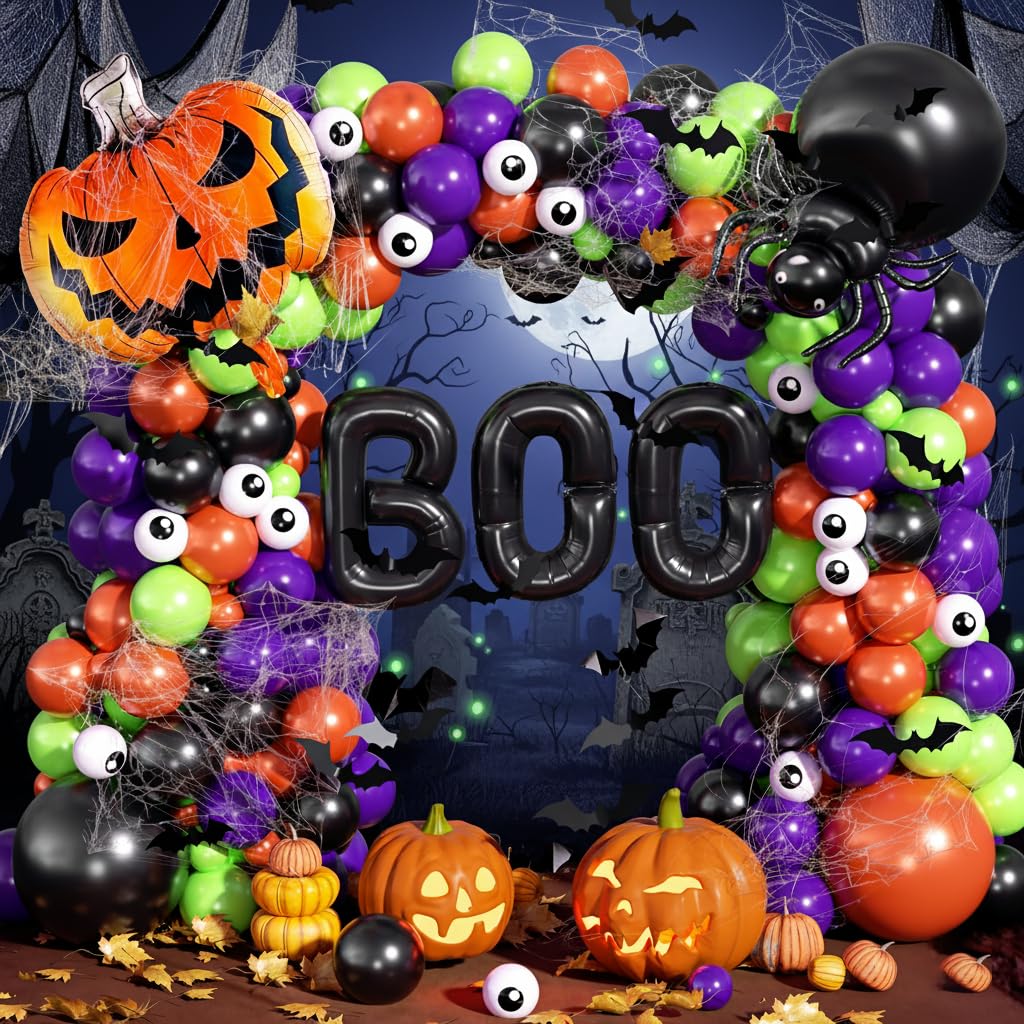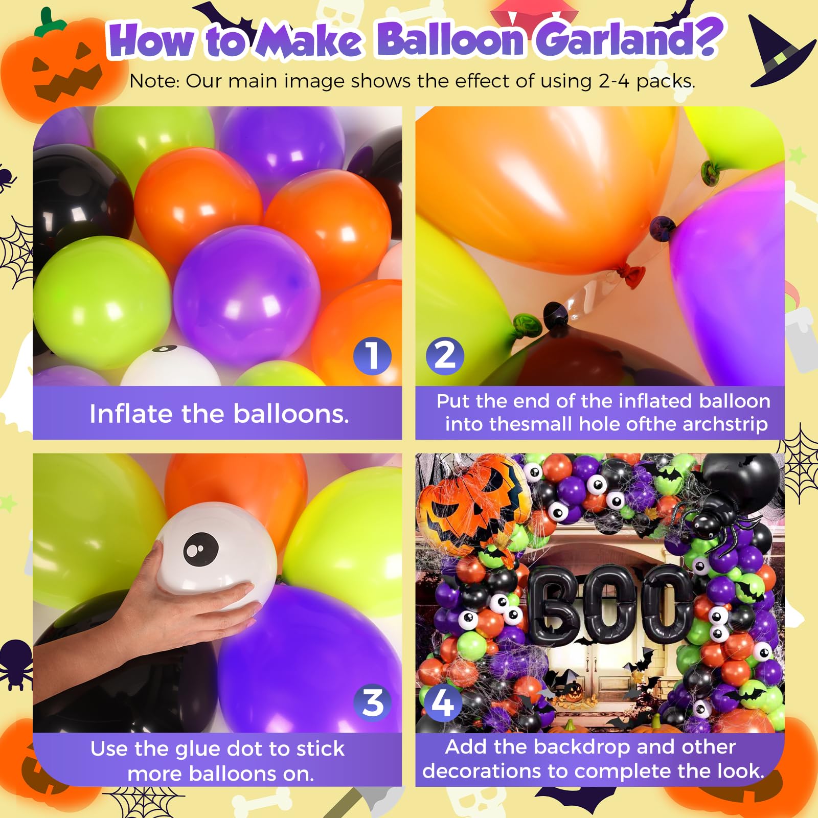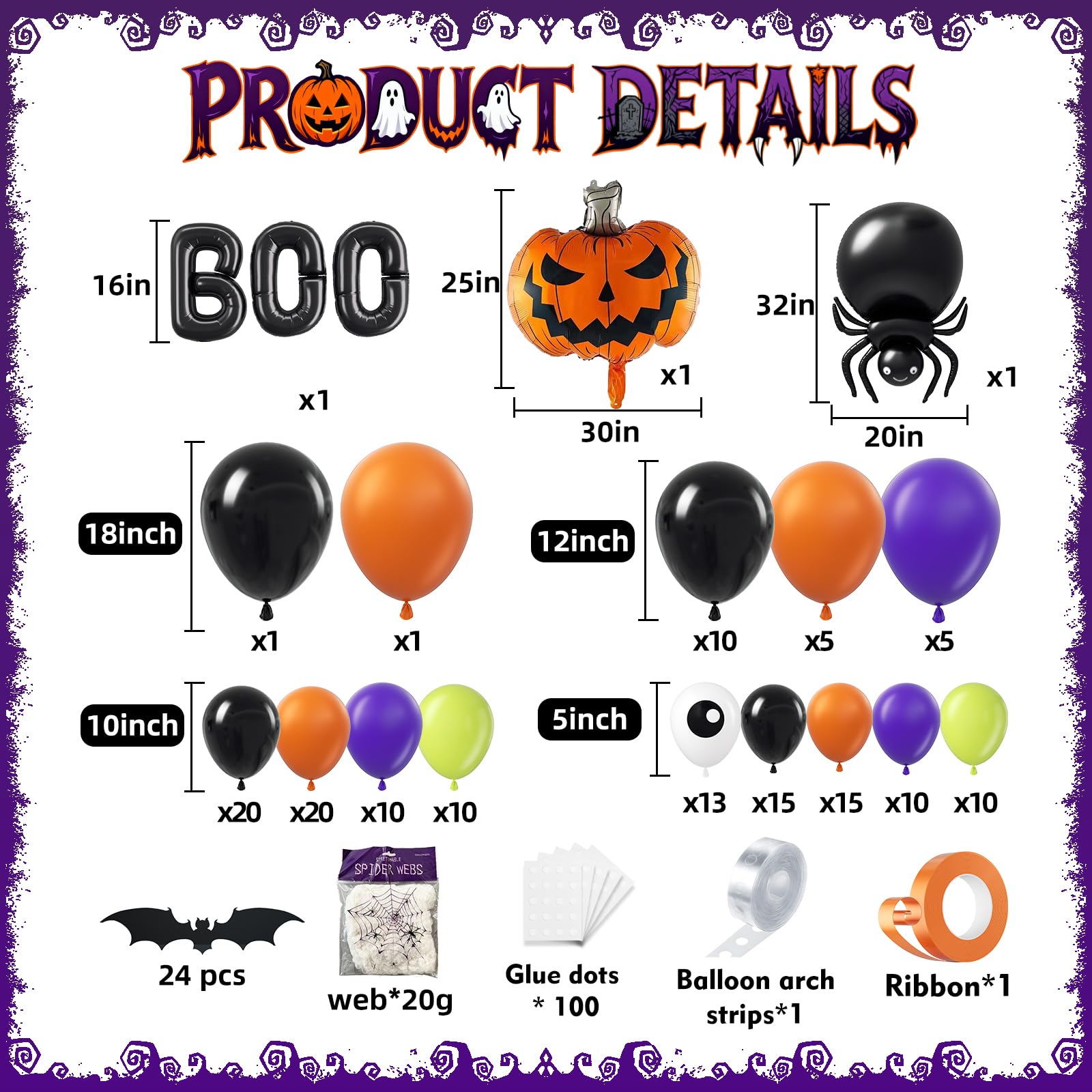 Eye-Catching Halloween Balloon Arch Kit with Stars: Featuring a total of 151 premium balloons and 3 accessories to help you easily create stunning balloon arches. Includes one oversized spider pumpkin BOO explosion star aluminum mold balloon, spider web, 24 3D bat figures, and 13 5-inch eye balloons, alongside orange (18" 1pcs, 12" 5pcs , 10" 20pcs, 5" 15pcs),black (18" 1pcs, 12" 10pcs , 10" 20pcs, 5" 15pcs), purple (12" 5pcs, 10" 10pcs, 5" 10pcs), purple (10" 10pcs, 5" 10pcs)balloons. We are offer balloon garland strip 1Pcs,Dot glue 20 x 5Pcs, Ribbon 1Pcs