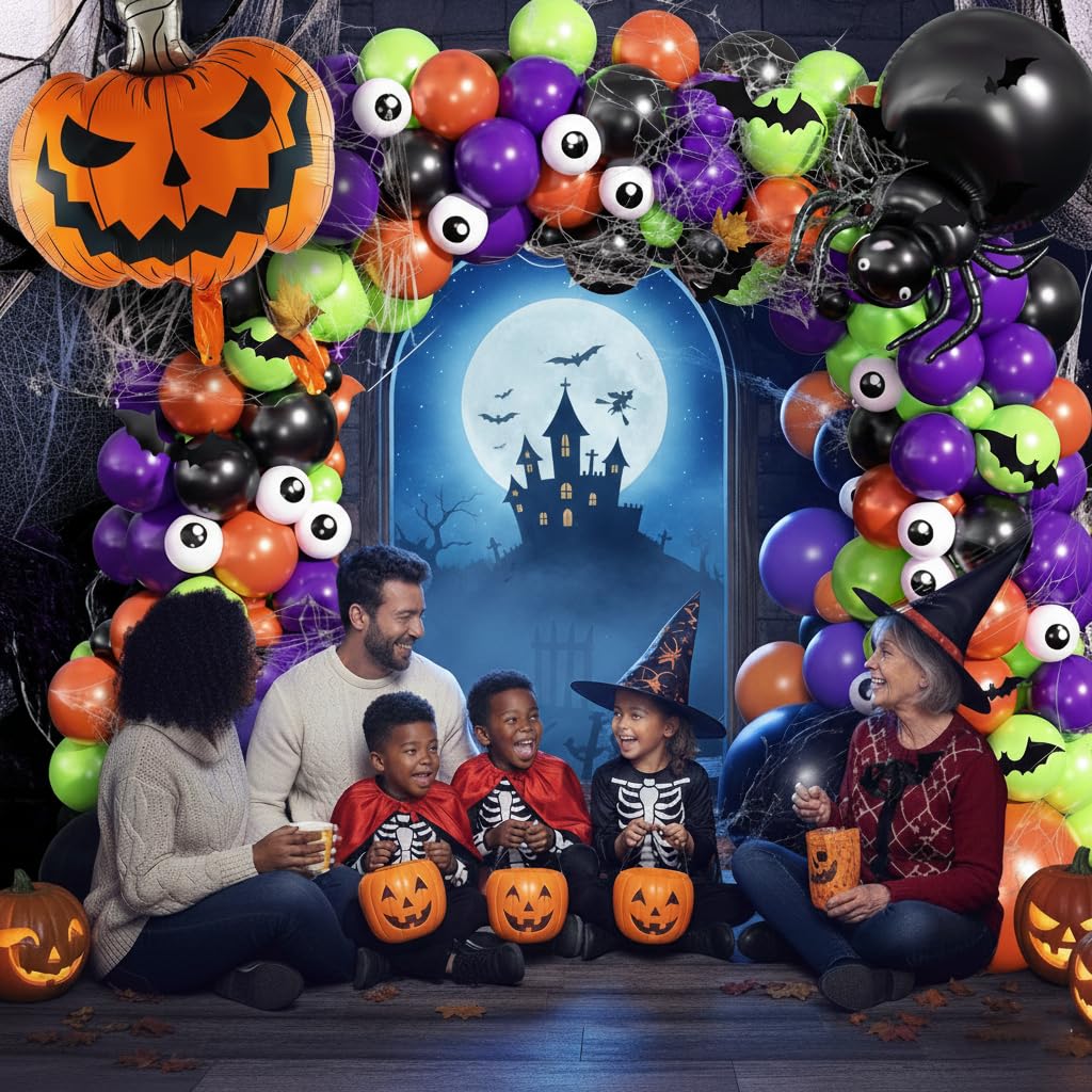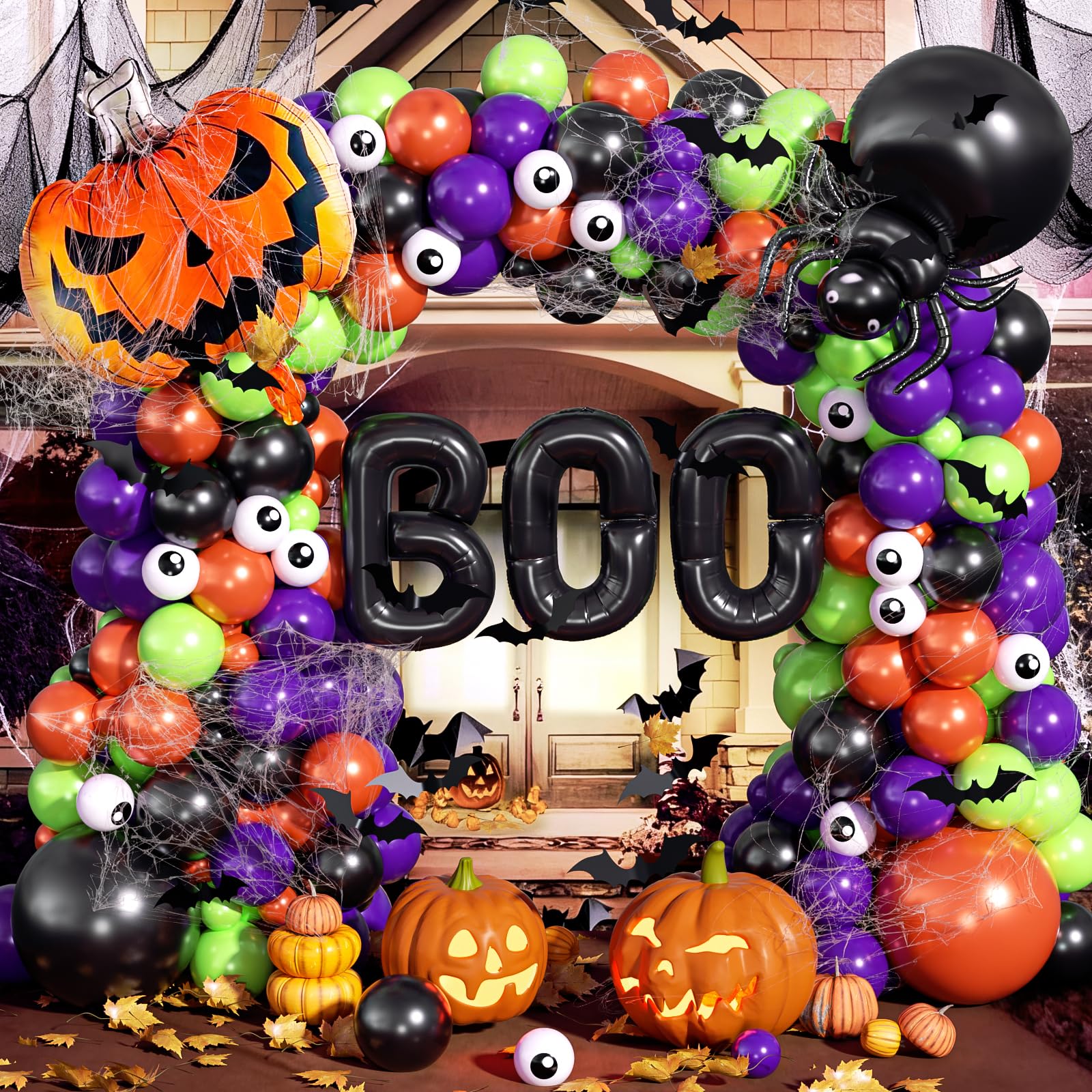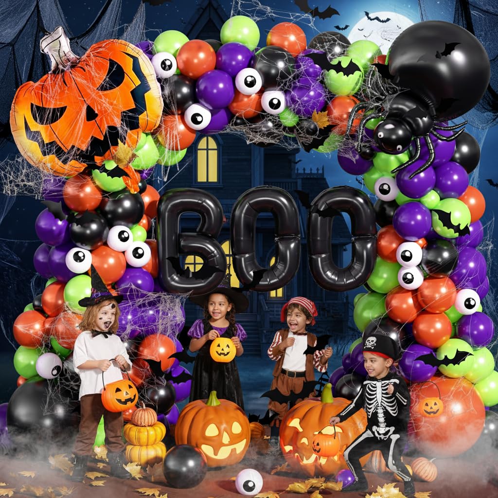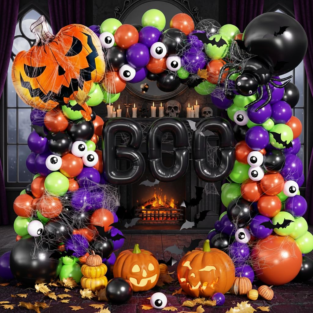 Eye-Catching Halloween Balloon Arch Kit with Stars: Featuring a total of 151 premium balloons and 3 accessories to help you easily create stunning balloon arches. Includes one oversized spider pumpkin BOO explosion star aluminum mold balloon, spider web, 24 3D bat figures, and 13 5-inch eye balloons, alongside orange (18" 1pcs, 12" 5pcs , 10" 20pcs, 5" 15pcs),black (18" 1pcs, 12" 10pcs , 10" 20pcs, 5" 15pcs), purple (12" 5pcs, 10" 10pcs, 5" 10pcs), purple (10" 10pcs, 5" 10pcs)balloons. We are offer balloon garland strip 1Pcs,Dot glue 20 x 5Pcs, Ribbon 1Pcs