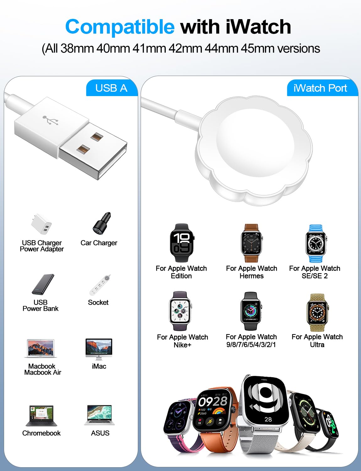 【Wide Compatible】- Our wireless charger is compatible with iWatch series Ultra2/Ultra/10/9/8/7/6/SE2/SE/5/4/3/2 (including the 38 mm/40 mm/41 mm/42 mm/44 mm/45 mm Version).Please take off the watch case and use a 5V/1A adapter or original adapter(ETL/UL Certified).