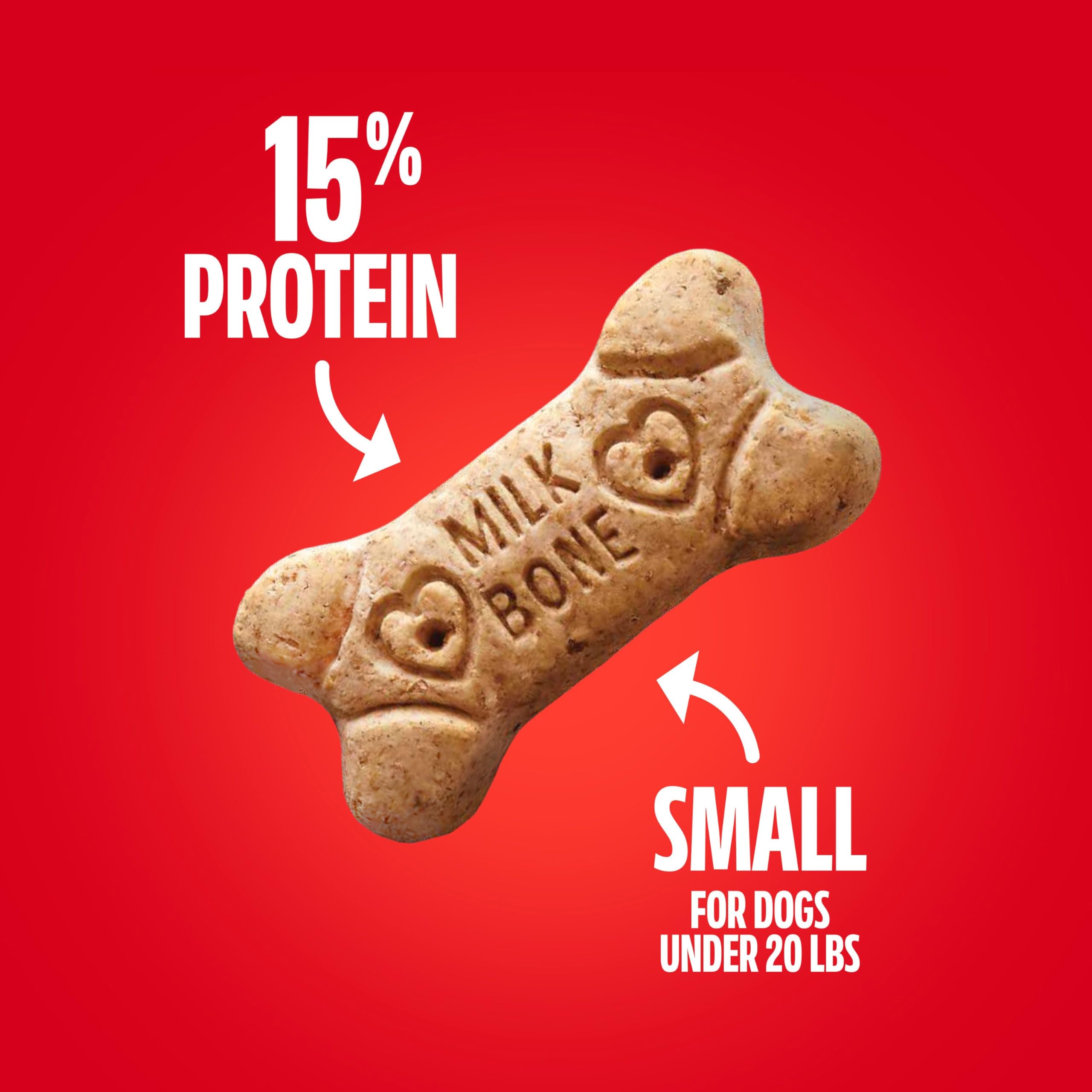 Give your dog tasty fun every day with Milk-Bone Original Dog Biscuits. These small dog treats deliver that irresistible, classic crunch and tail-wagging meaty taste dogs can’t get enough of in every bite. But the great taste isn’t the only thing to love about these dog snacks. Their crunchy texture helps clean teeth and reduce tartar build-up to make those sloppy doggy kisses even more enjoyable. Plus, they’re made with more than 12 vitamins and minerals, and they’re produced in Buffalo, New York, USA. Add a box to your cart, and fill every day of doglife with more love (and deliciousness).