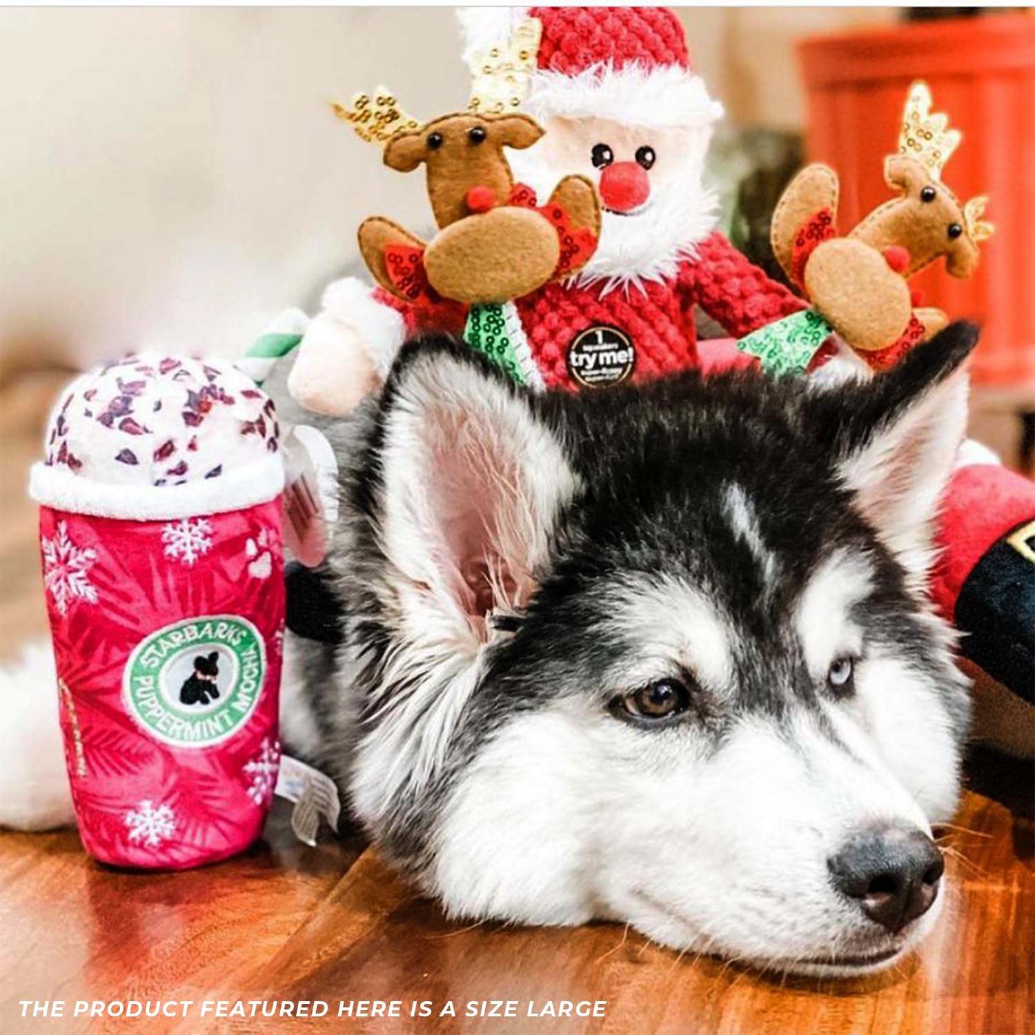 Funny Parody Plush Dog Toy: Perk up your pooch with our Starbarks Puppermint Mocha dog toy. This dog toy features a holiday-themed red and white plush exterior with a built-in squeaker hidden inside. It’s a fun, cute interactive dog toy that will warm up those winter nights! Size Large 7"x4.5"x2".
