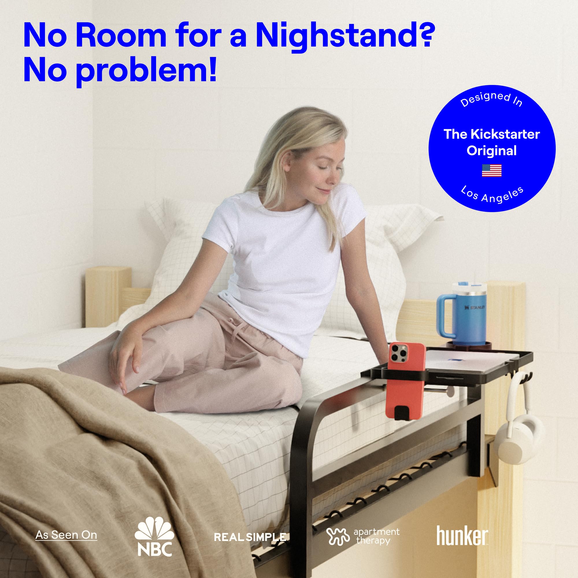 INTRODUCING THE DORMESSENTIAL: the ultimate floating nightstand made for dorm life and small space living. Designed to fit any bed with a rail—including metal dorm beds, Ikea frames, lofted beds, and side-railed setups—it installs easily with a sturdy 2.0" clamp. Made from eco-friendly, recyclable plastic, the DormEssential features a sleek matte finish and comes with modular accessories for personalized organization. Whether you're in a shared dorm, loft bed, or compact room, it's the perfect all-in-one solution for college students looking to stay organized in style.