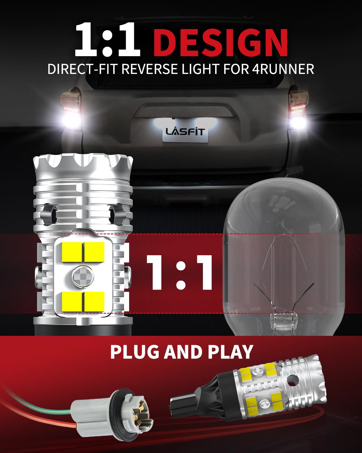 Bright Reverse Light for Enhanced Visibility:Equipped with high-performance 3030 SMD LED chips, this reverse light is significantly brighter than stock halogen bulbs.With its enhanced brightness, the lasfit led bulb allows for better visibility when maneuvering your Toyota 4runner in reverse.The 6000K cool white reverse light extends visibility, ensuring safer driving at night or in poor weather conditions