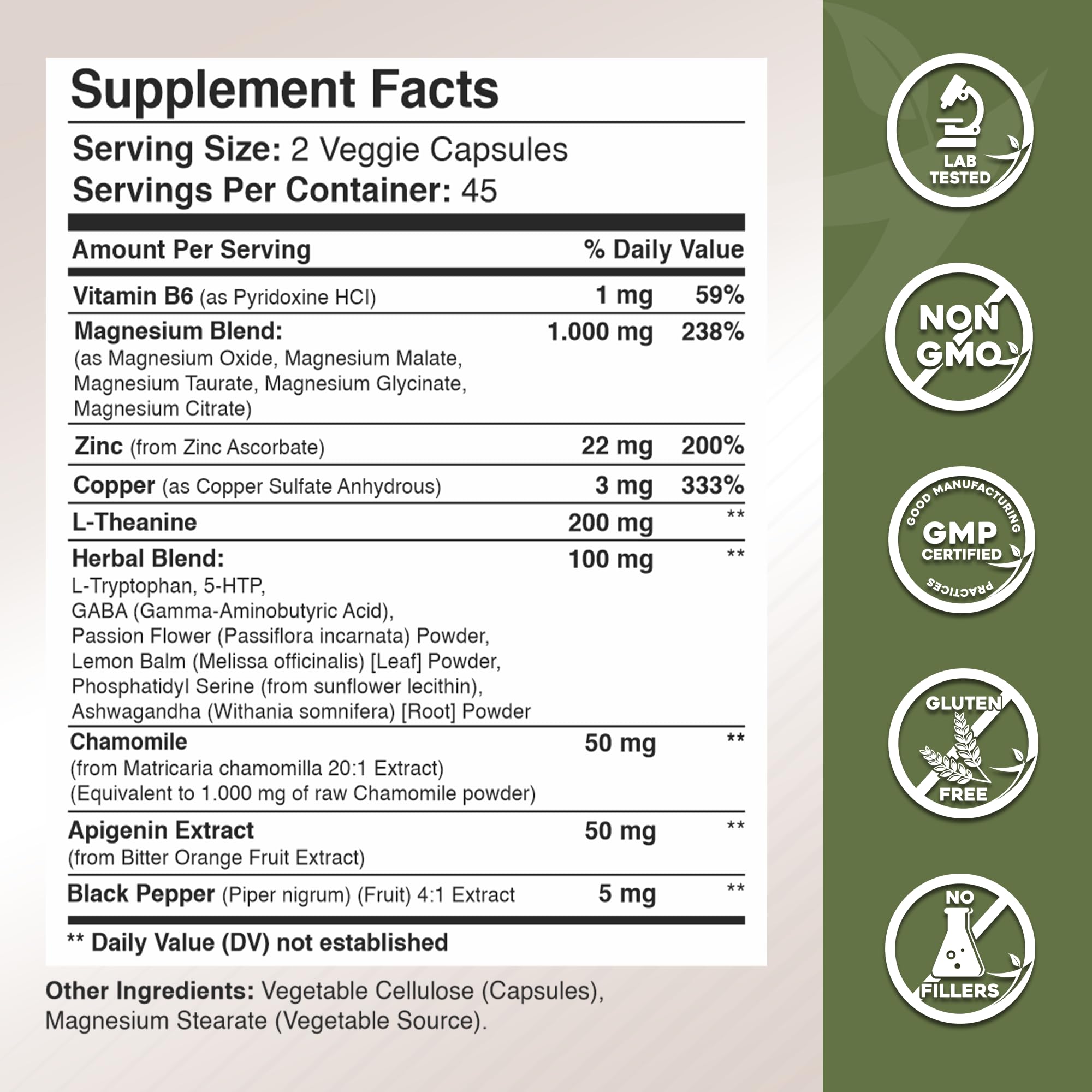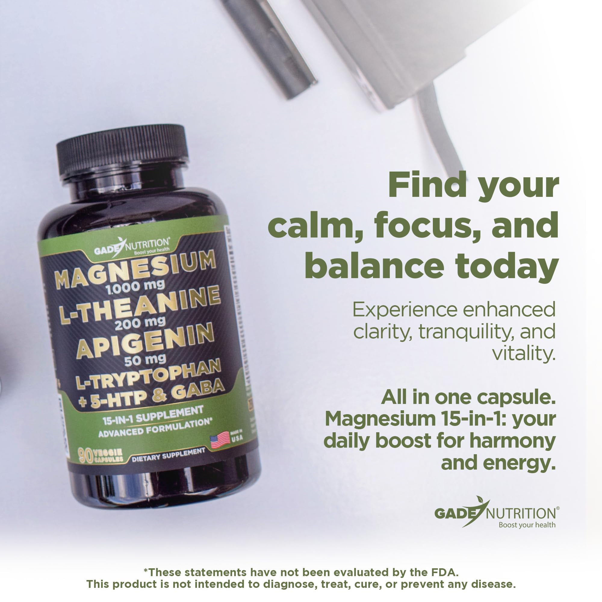 EXPERIENCE CALM AND FOCUS: Magnesium 1000 mg with L-Theanine, Apigenin, L-Tryptophan, 5-HTP, and GABA is your go-to solution for enhanced relaxation and mental clarity. Magnesium, a vital mineral, plays a central role in over 300 enzymatic reactions in the body, supporting muscle function, energy production, and overall well-being. This formula combines the power of magnesium with natural compounds known for their calming and mood-balancing properties.