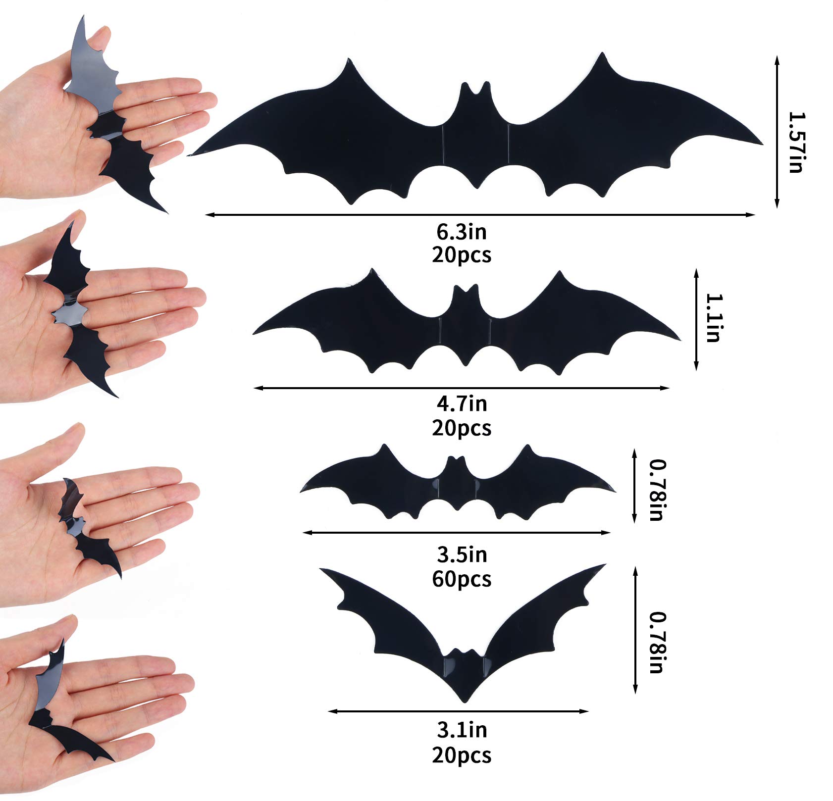 Package:120 bats stickers in 4 sizes, enough adhesive tape 20 x big bats 16 x 4 cm, 20 x medium bats 12 x 3 cm, 20 x small bats 8 x 4 cm 60 x small bats 9 x 2 cm