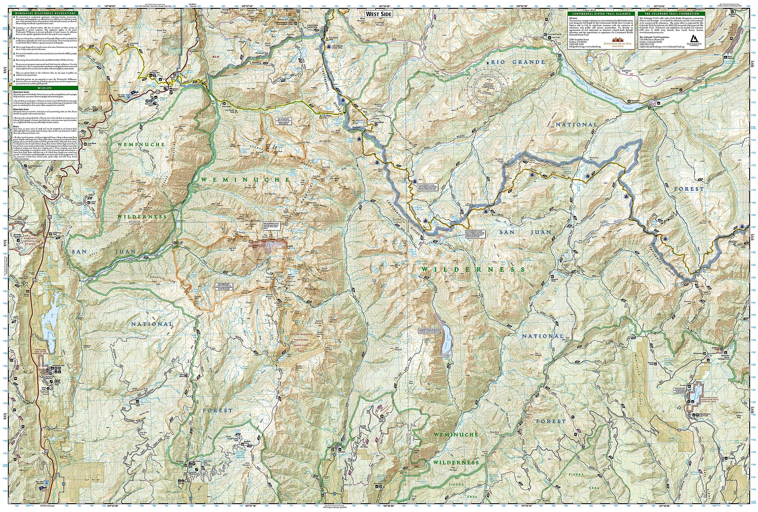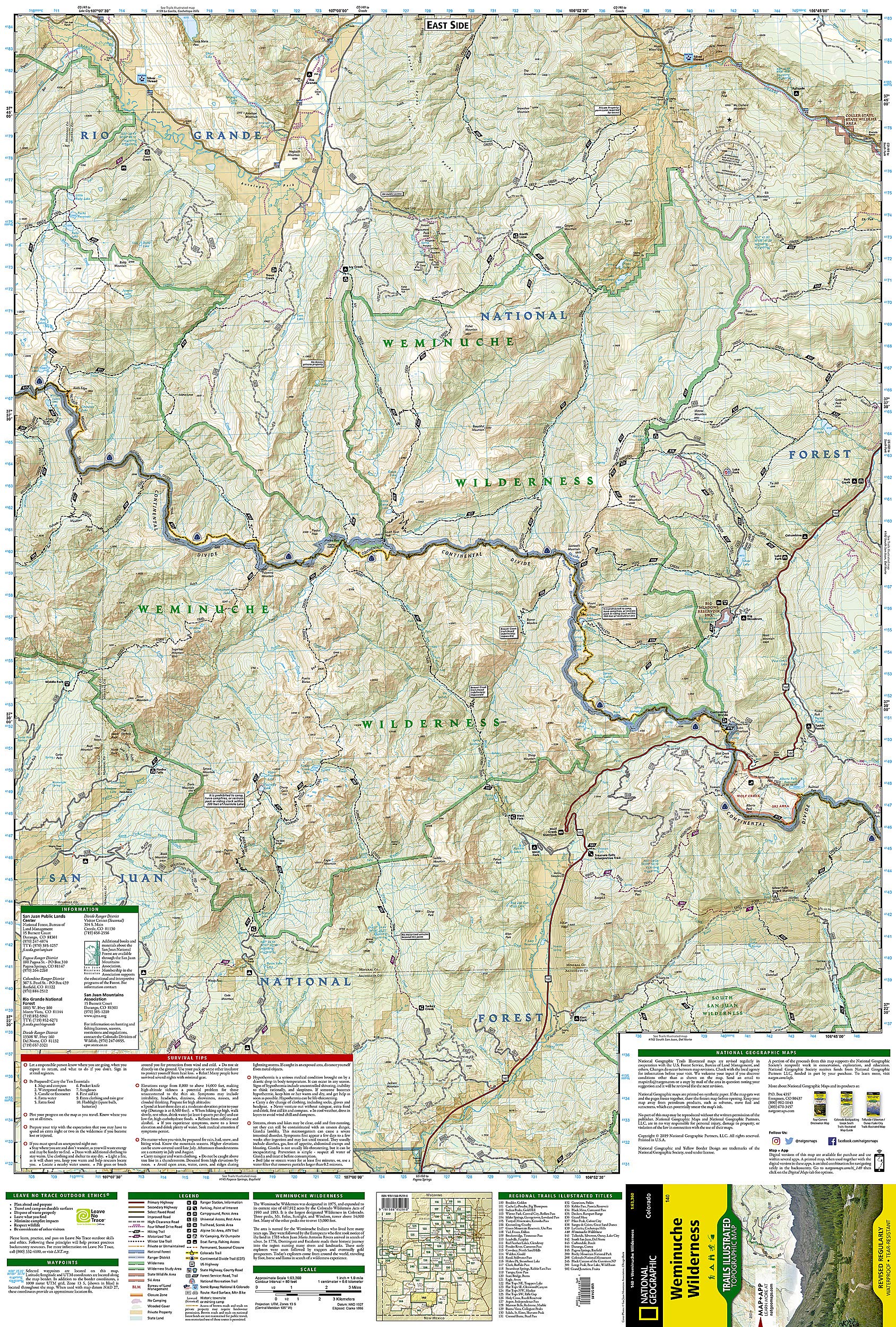 • Waterproof • Tear-Resistant • Topographic Map The Weminuche Wilderness spans the Continental Divide and at nearly a half million acres is the largest wilderness area in Colorado. Expertly researched and created in partnership with local land management agencies, National Geographic's Trails Illustrated map of Weminuche Wilderness provides an unparalleled tool for exploring this rugged country and its fragile ecosystems. This map offers unmatched detail of the entire park including such key areas of interest as Big Meadows, Williams Creek, and Rio Grande reservoirs; the Rio Grande and Animas rivers; Wolf Creek; and three fourteeners, Mount Eolus, Sunlight Peak, and Windom Peak, located in the San Juan Mountains. The map also includes the San Juan and Rio Grande national forests. With miles of clearly marked trails including portions of the Colorado and Continental Divide trails, and the scenic roadways Silver Thread and San Juan Skyway, this map will prove invaluable whether you're taking in the scenery on foot or by car. Whatever the season, you'll find this map a useful tool in pursuing a host of recreational activities. Alpine ski areas, hard surface and mountain bike routes, campgrounds, trailheads, boat ramps, fishing access, and ATV trails are all noted, as are historic townsites and mining camps. The map base includes contour lines and elevations for summits, passes and many lakes. Every Trails Illustrated map is printed on "Backcountry Tough" waterproof, tear-resistant paper. A full UTM grid is printed on the map to aid with GPS navigation. Other features found on this map include: Mount Eolus, Needle Mountains, Rio Grande National Forest, San Juan Mountains, San Juan National Forest, Sunlight Peak, Weminuche Wilderness, Windom Peak, Wolf Creek Pass. Map Scale = 1:63,360 Sheet Size = 25.5" x 37.75" Folded Size = 4" x 7.5"