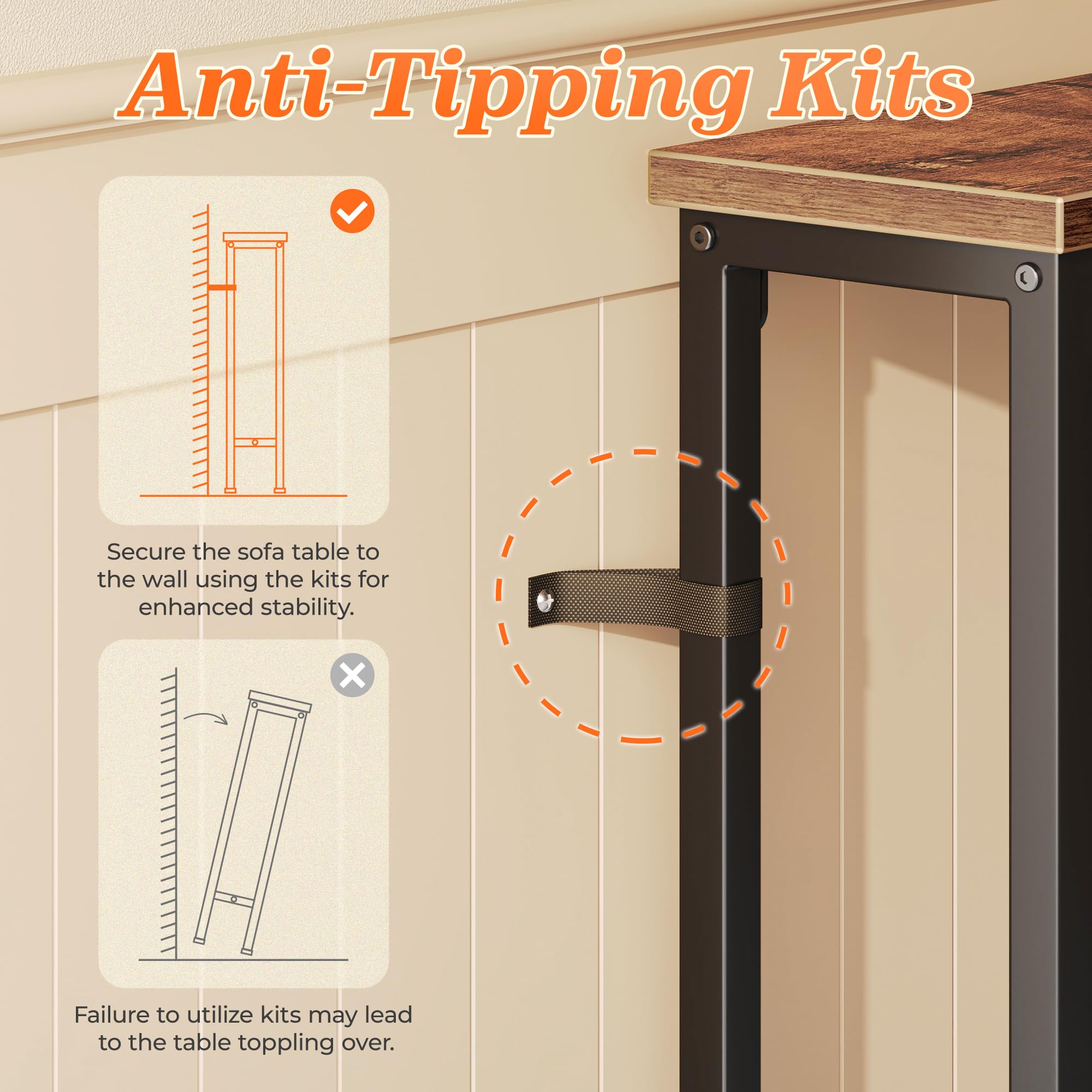 【Strong, Stable & Safe】Made from high-quality engineered wood and a sturdy metal frame, this behind the sofa table is built for daily use. Anti-tip kit included for wall-mount safety, plus upgraded larger adjustable feet keep it steady on uneven floors, much more stable than smaller leg bases