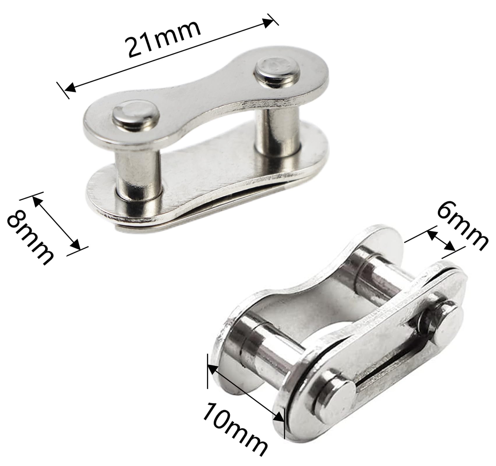 Size: each missing chain link size is 21 x 8 x 10 mm; The bike chain link is 21 mm in length, 8 mm in width and 10 mm in height;