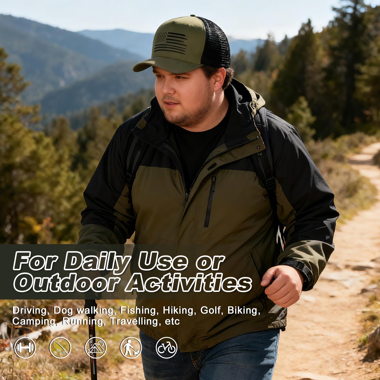 3.Breathable & Durable Construction – Made with 100% cotton twill front panels and rugged polyester mesh back panels, this American flag hat offers superior breathability and long-lasting durability. The mesh sides and back maximize airflow, keeping your head cool and dry during outdoor activities like hiking, camping, or sports.