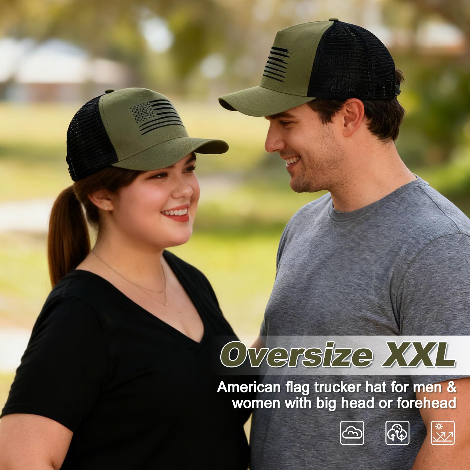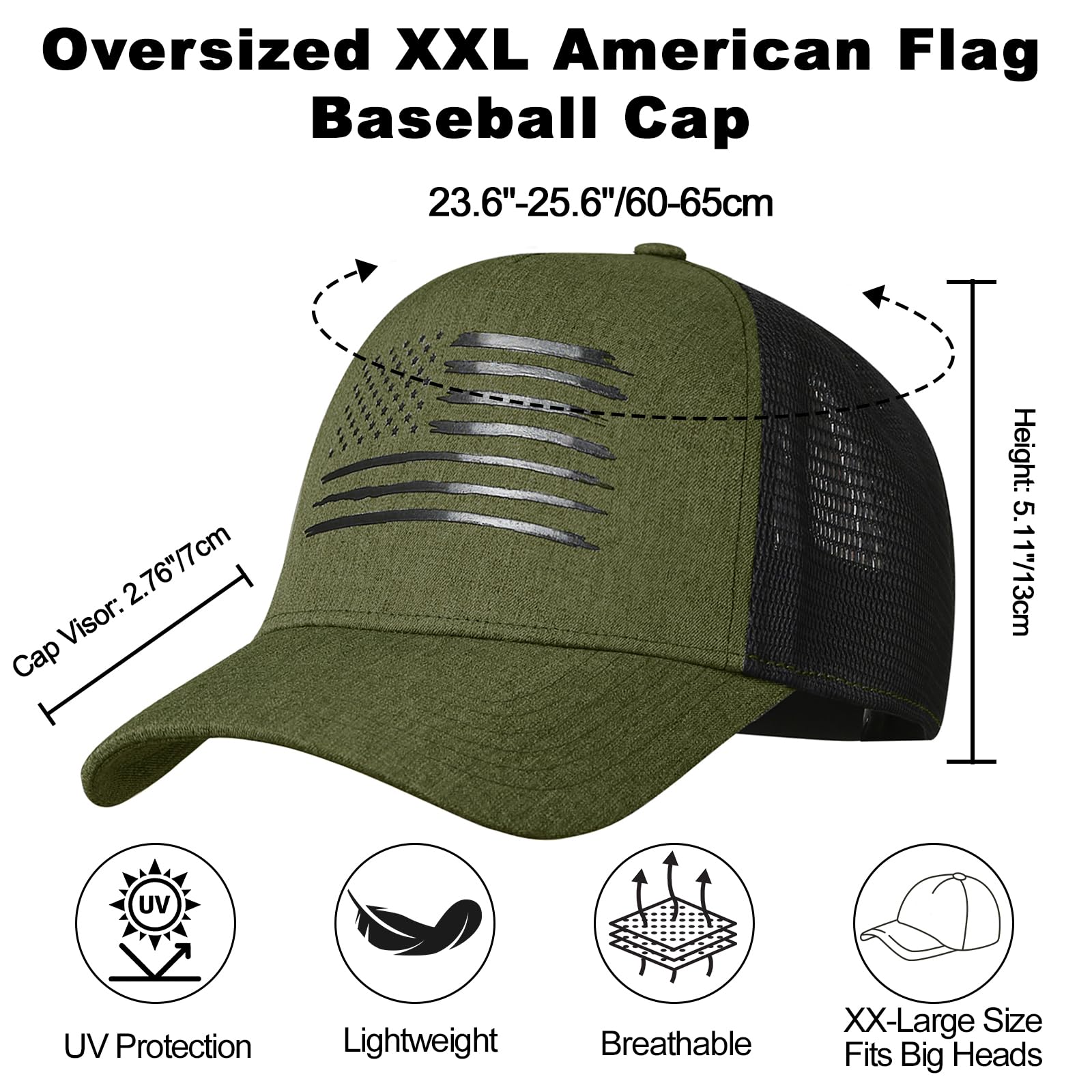 Description Oversized XXL American Flag Baseball Cap – Style, Comfort, and Patriotism Combined Show your American pride with this oversized XXL US flag baseball cap, designed for men and women with big heads or thick hair. Featuring a bold American flag print, this hat is perfect for outdoor enthusiasts, sports fans, or anyone looking to make a patriotic statement. Why Choose This Trucker Hat? Perfect Fit: Adjustable snapback closure ensures a comfortable fit for head sizes 23.6"-25.6". Breathable Design: Mesh back and side panels provide maximum airflow, keeping you cool and dry during outdoor activities like hiking, camping, or fishing. Durable & Fade-Resistant: Made with high-quality cotton twill front panels and rugged polyester mesh, this hat is built to last. UPF 50+ Sun Protection: Offers excellent UV protection, making it ideal for sunny days at the beach, park, or backyard BBQ. 8 Stylish Colors: Available in Black Gray, Light Gray, Green, Black, Blue, Camo, Wine red, and Dark Gray to match any outfit or occasion. Great for Gifting Looking for a unique gift? This American flag baseball cap is a thoughtful present for friends, family, or colleagues. Whether it’s for a birthday, Father’s Day, or a patriotic holiday, this hat is sure to impress. Package Includes:1 x Oversized XXL American Flag Trucker Hat Wear Your Pride, Stay Comfortable, and Stand Out with This Stylish and Functional Baseball Cap!
