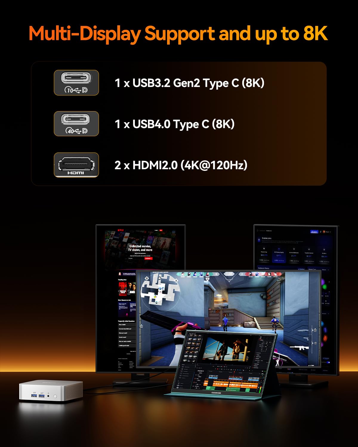 [All-in-One USB4 & Quad Display] The GEEKOM A8 mini PC packs a high-speed USB4 port (up to 40Gbps), outperforming specialized connections like Oculink. Unlike Oculinkโwhich only handles dataโUSB4 does it all: charging, multi-monitor support, superfast storage, and crucially, standard eGPU connectionโall through one standard port. This allows you to easily connect a powerful external graphics card to unlock pro-level rendering and gaming performance. Paired with dual HDMI and a full-function Type-C port, the A8 supports a stunning 8K display or up to four 4K monitors at once.