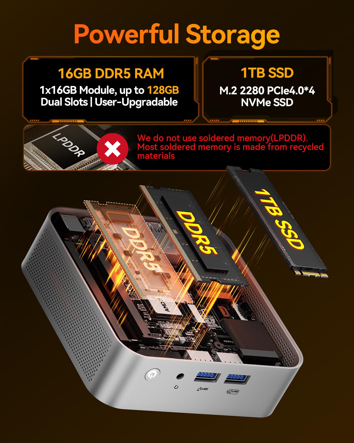 [Powerful, Expandable Memory & Storage] The A8 mini desktop comes with 16GB of blazing-fast DDR5 RAM and offers two memory slots for easy upgrades (one slot is pre-filled, leaving one open for you). Expand your memory up to 128GB whenever you needโ๐ฏ๐ฟ๐ฒ๐ฎ๐ธ๐ถ๐ป๐ด ๐ณ๐ฟ๐ฒ๐ฒ ๐ณ๐ฟ๐ผ๐บ ๐๐ต๐ฒ ๐ณ๐ถ๐ ๐ฒ๐ฑ ๐น๐ถ๐บ๐ถ๐๐ ๐ผ๐ณ ๐๐ผ๐น๐ฑ๐ฒ๐ฟ๐ฒ๐ฑ ๐บ๐ฒ๐บ๐ผ๐ฟ๐. For storage, it includes a ๐ญ๐ง๐ ๐๐ฒ๐ป๐ฐ ๐ก๐ฉ๐ ๐ฒ ๐ฆ๐ฆ๐ (expandable to 4TB) and is fully compatible with Gen3 drives, delivering top-tier speeds and the freedom to upgrade down the line.