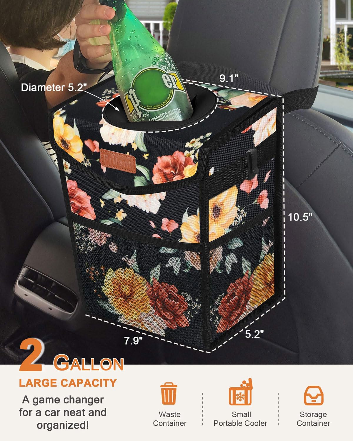 3-in-1 Multipurpose Container With 2 gallon Capacity:A game changer for a car neat and organized! It is not only a rubbish holder and car storage organizer, but a nice portable cooler bag for your car. Mesh pockets provide convenient storage places for things like tissues, extra trash bags, and cleaning wipes. The mesh pockets can hold anything you want to keep within arm’s reach in your car. Why not upgrade your driving experience today and invest in a Pritent Trash can for your car?