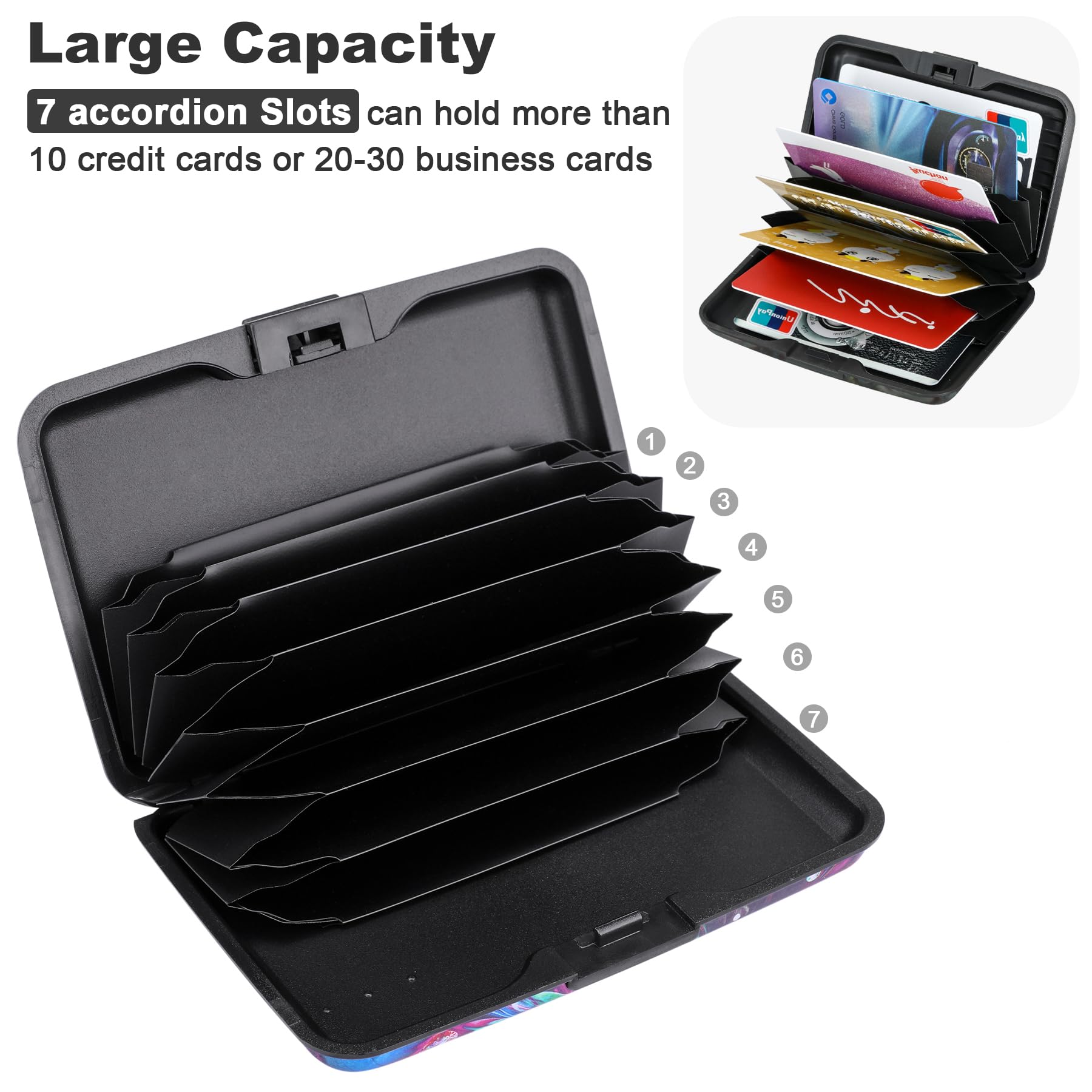 Latches safely and securely when not in use. Rounded corner wouldn't damage on your clothes. With 7 accordion Slots, Capacity for up to more than 9 credit cards or more than 21 business cards.