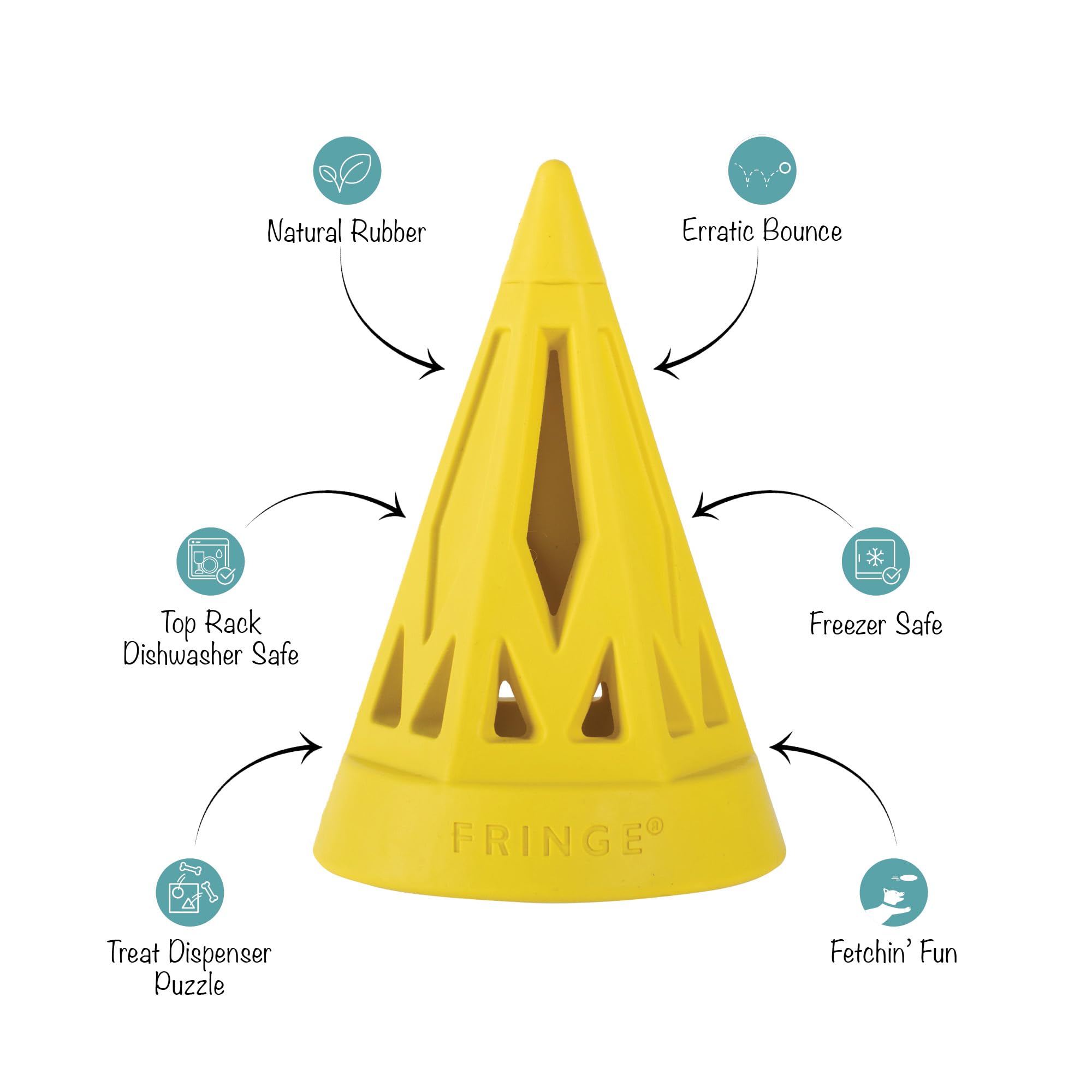 Ready to join the Dura Club? PetShop by Fringe Studio's "You Cone Do It!" yellow rubber dog toy is for pups that love to work for their treats, chew, and play lots of fetch. As a treat dispenser puzzle with an erratic bounce and made with natural rubber, this toy was created for long-lasting interactive play. Simply fill it with treats or thread it with a bully stick, then toss it for some fetchin' fun to keep your pup busy trying to get them out. Great for all-sized dogs and strong chewers.