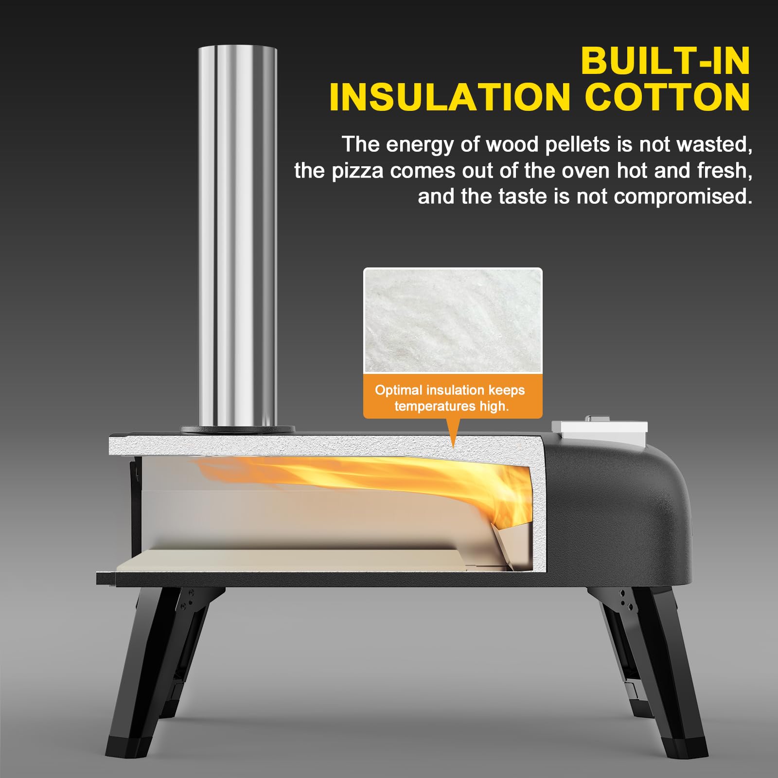 Pizza oven:Using hardwood pellet fuel allows for a balanced, reliable burn, providing the perfect burn-smoke ratio, adding a special flavor of smoky wood to food that gas grills don't have.