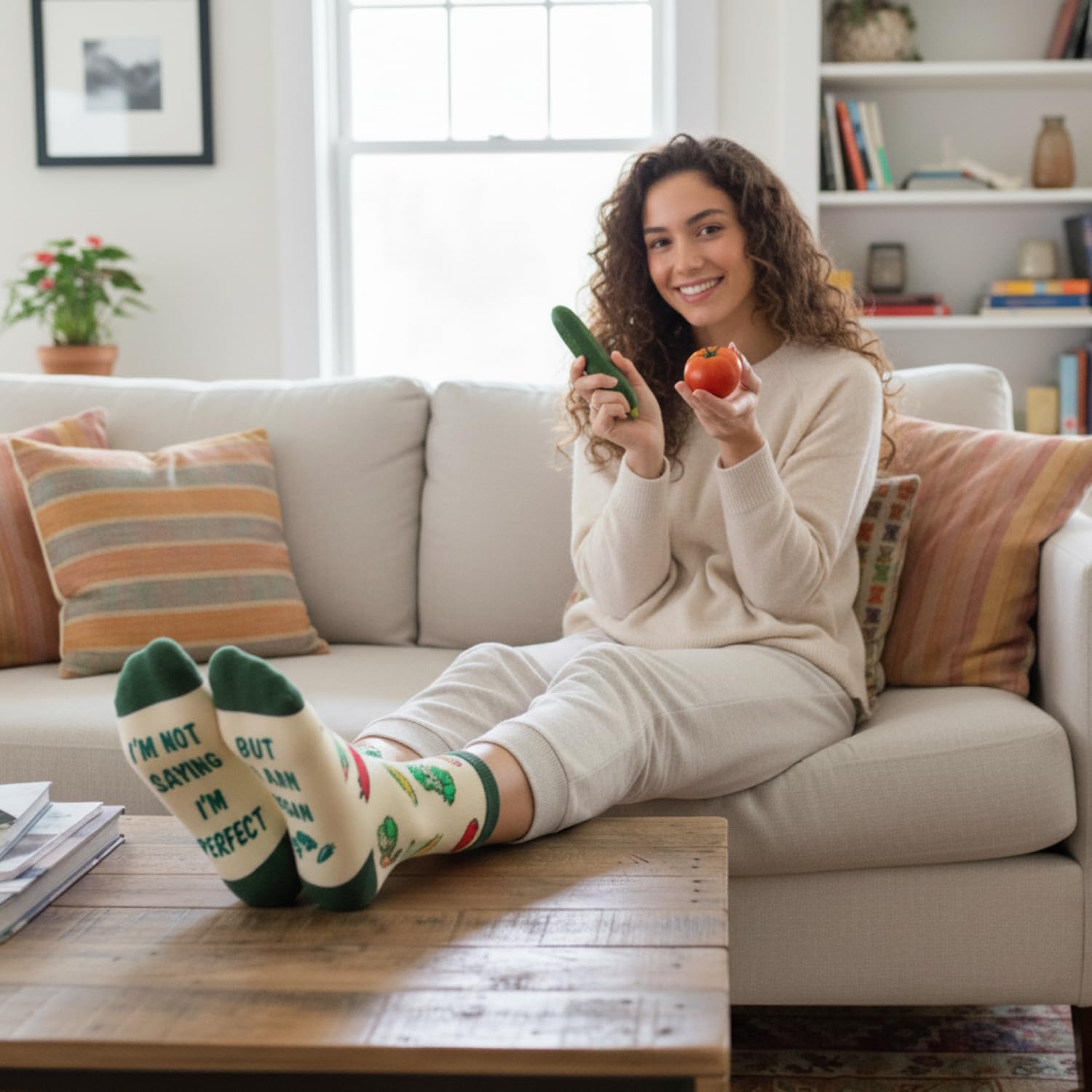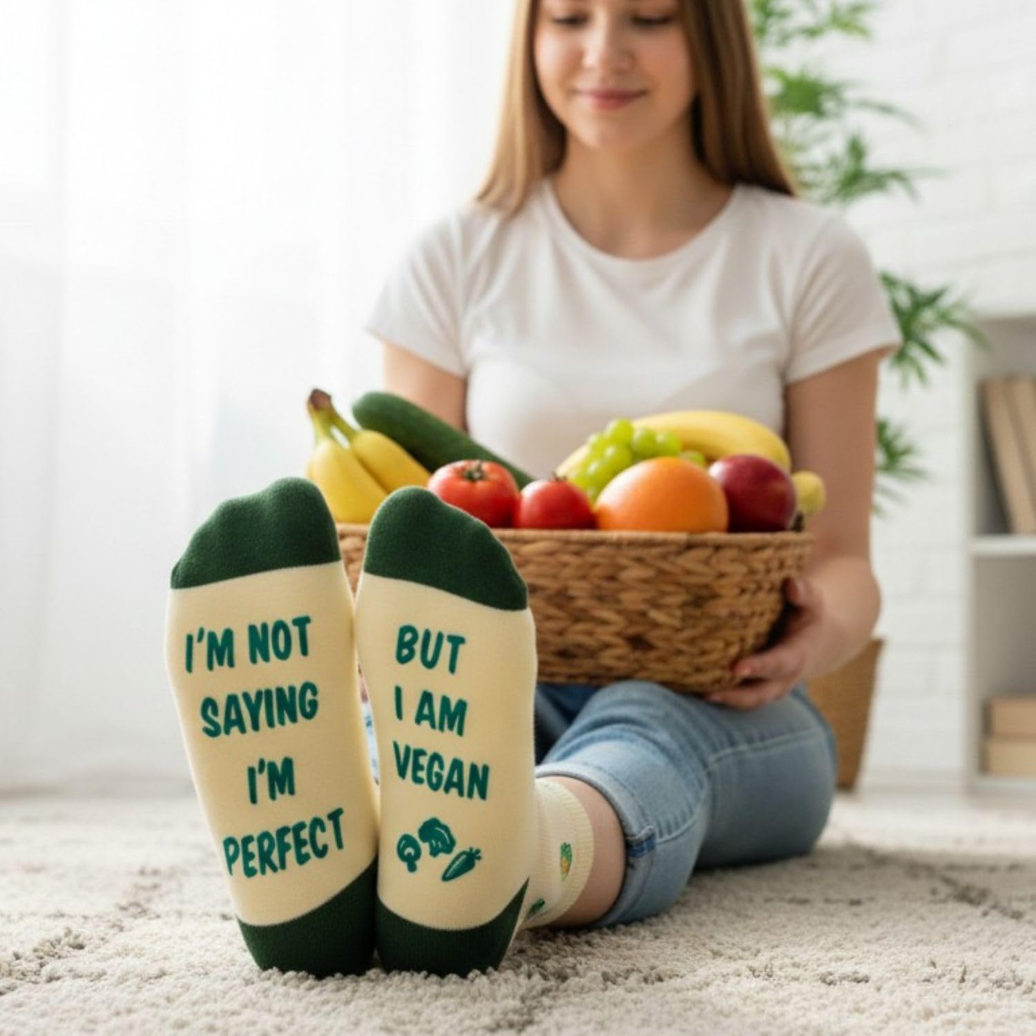 VEGAN GIFTS: These food socks are adorned with pumpkin, eggplant, corn, peas, peppers, carrots, avocados, broccoli, lemons, and radishes. Moreover, the socks knitted a funny message that reads "I'M NOT SAYING I'M PERFECT BUT I AM VEGAN".