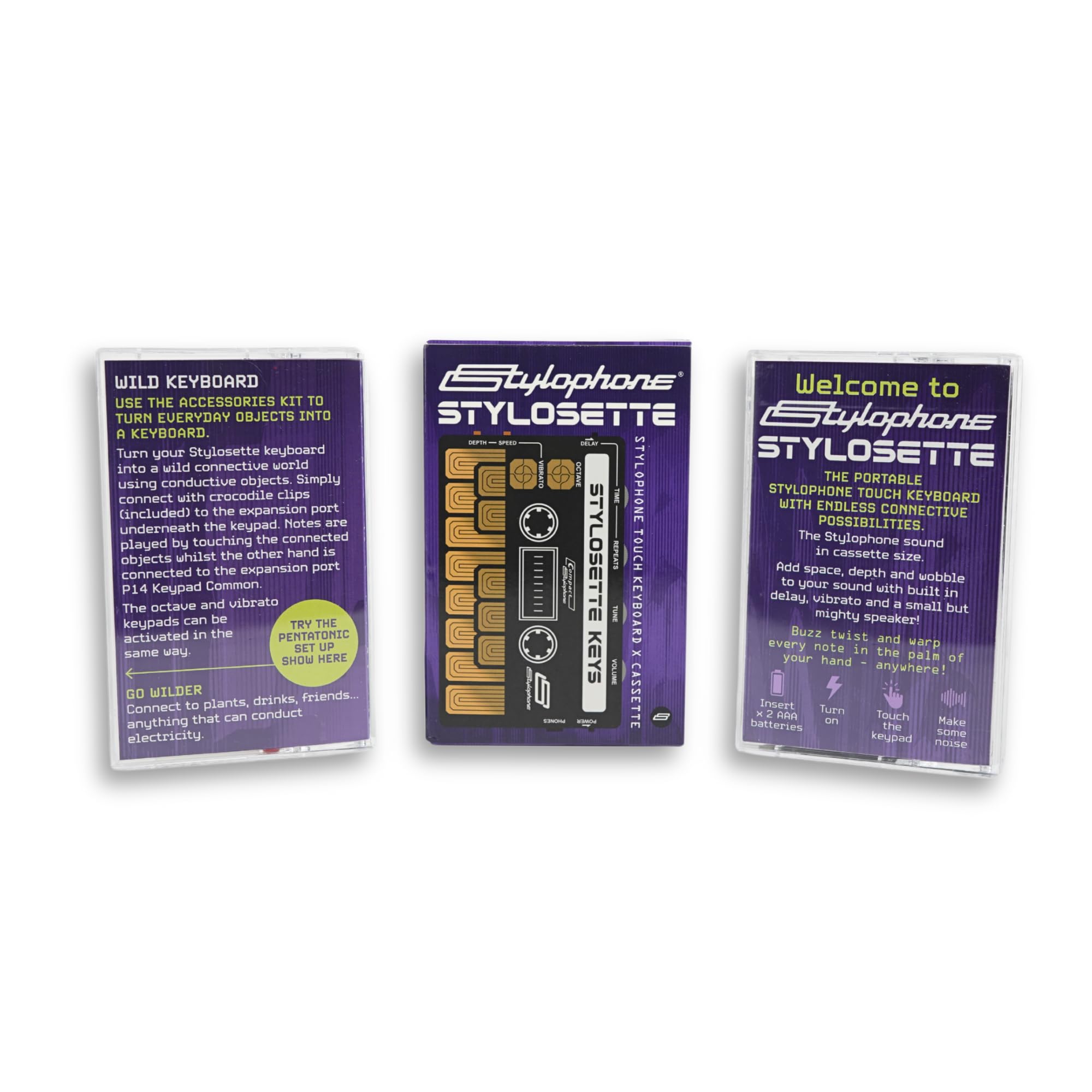 EASY TO PLAY: Our Stylophone Stylosette retro cassette-style synthesizer is played by sliding your finger along the touch-sensitive metal surface. Each segment on the synthesizer keyboards plays a different note. Add vibrato and delay, and change octaves with ease.