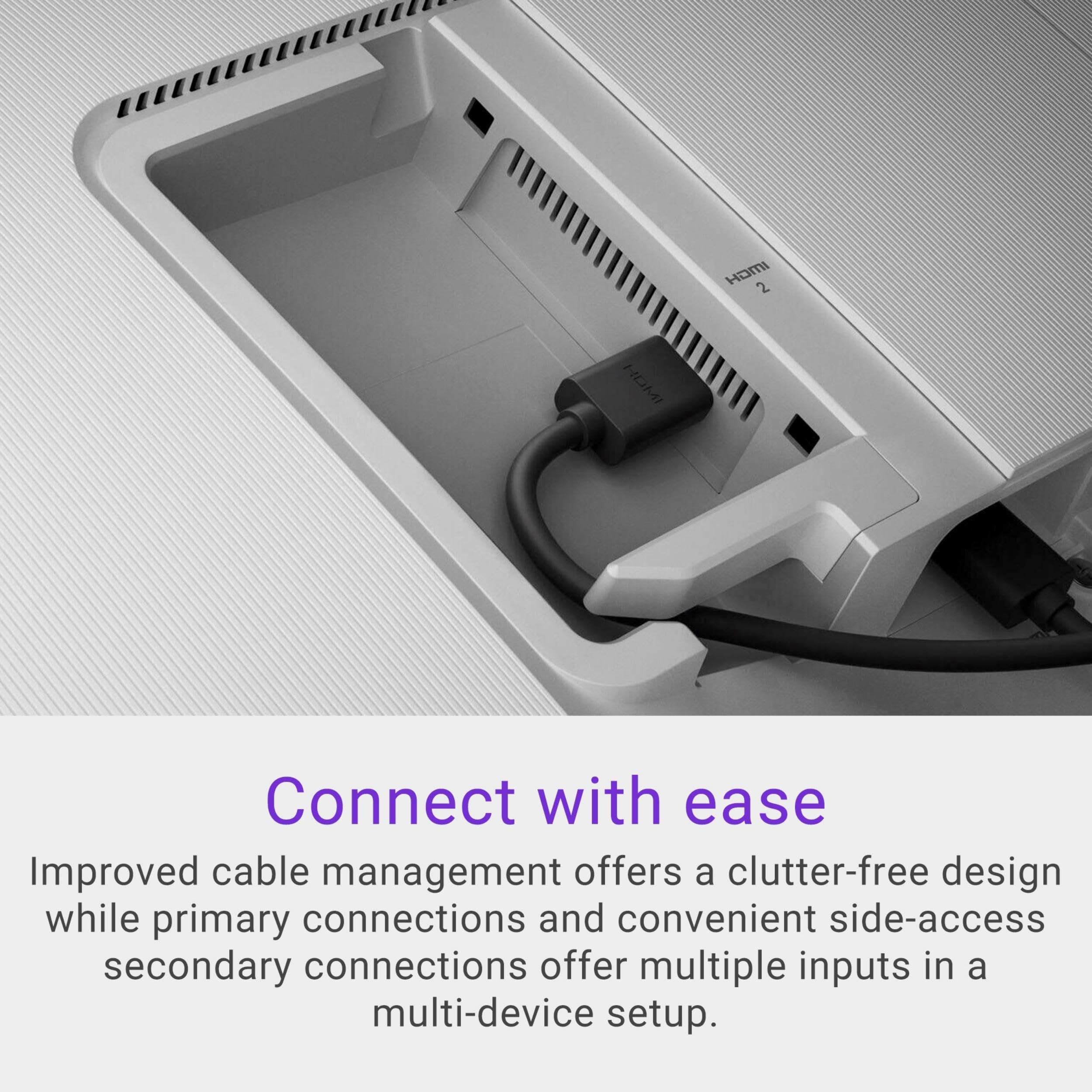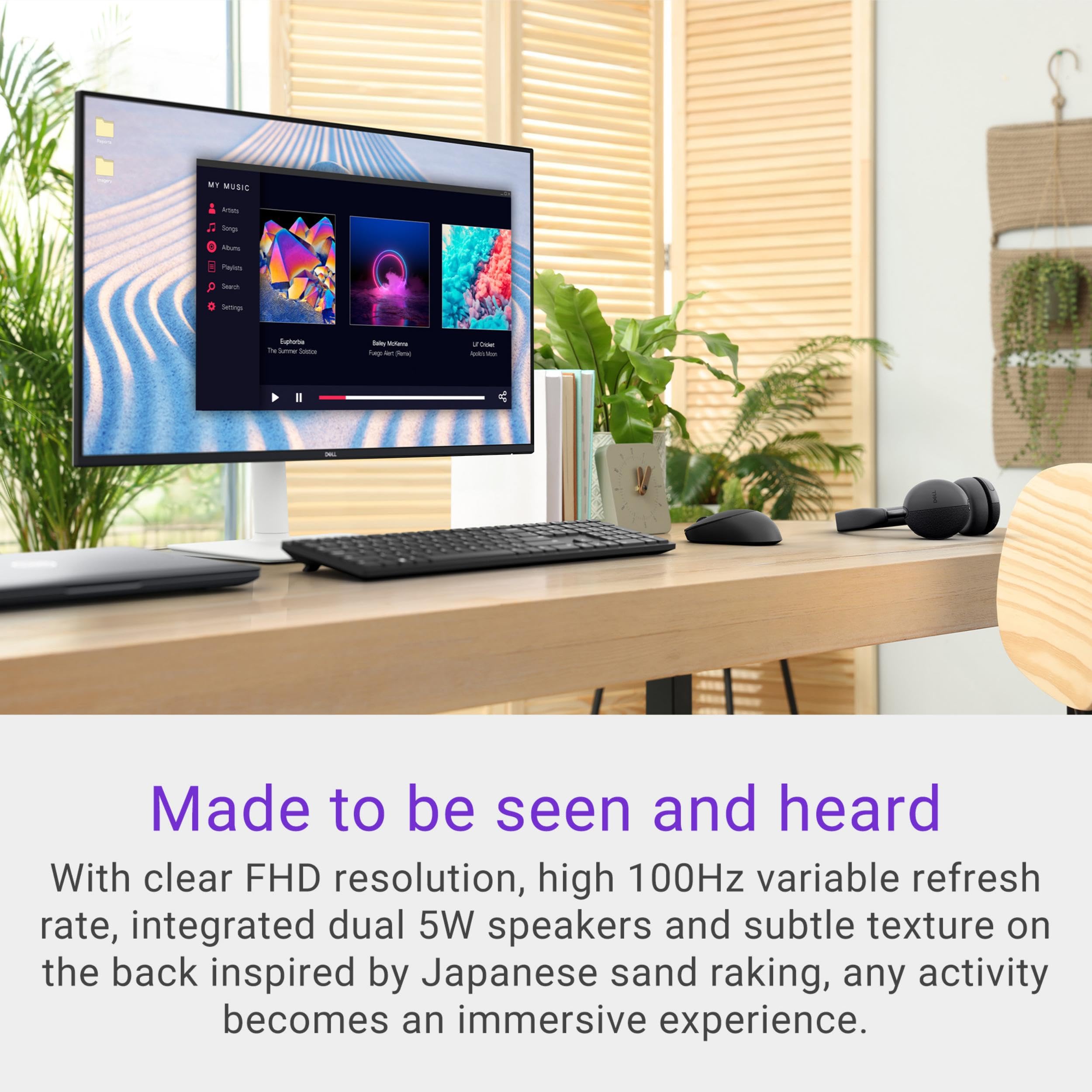 A 27-inch FHD monitor that optimizes eye comfort and features impressive visuals with outstanding acoustics in a lifestyle-inspired design. With clear FHD resolution, high 100Hz variable refresh rate, integrated dual 5W speakers and subtle texture on the back inspired by Japanese sand raking, any activity becomes an immersive experience.