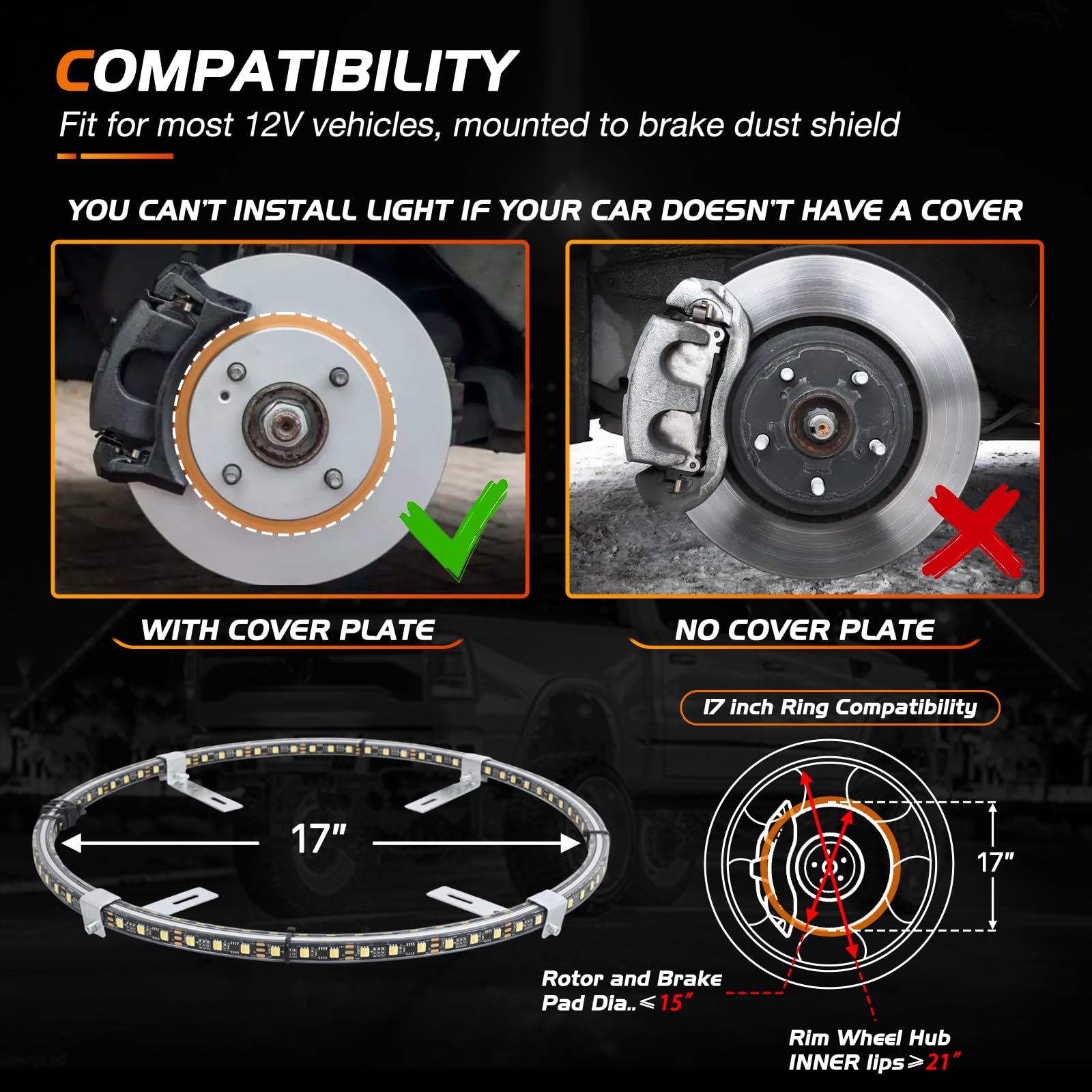 Compatibility: Fit for Car, SUV, Jeep, Truck, Vans, etc. Please note the wheel ring dimensions before purchasing to avoid buying the incorrect size of wheel ring lights.